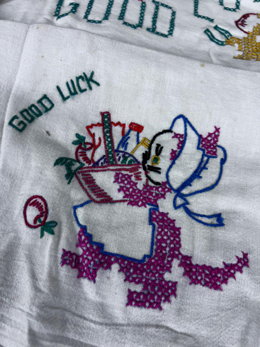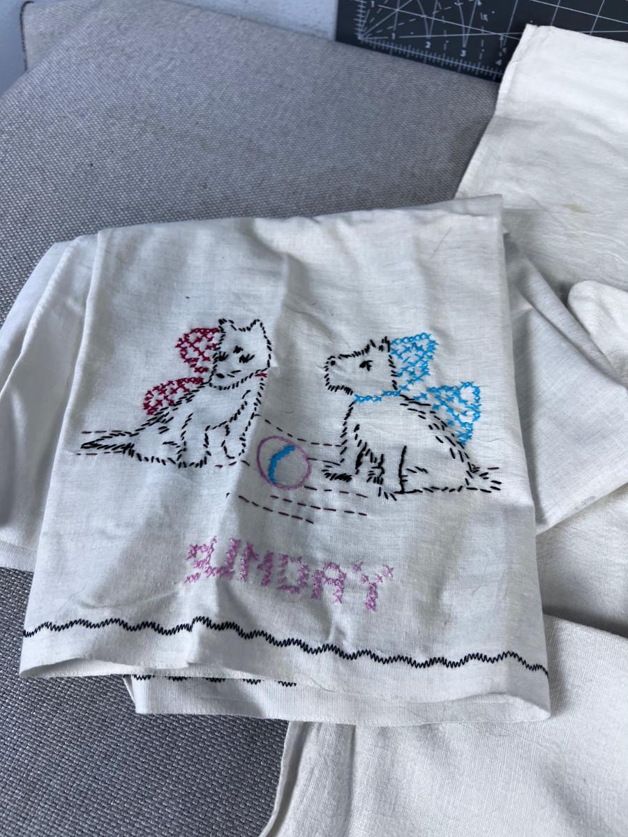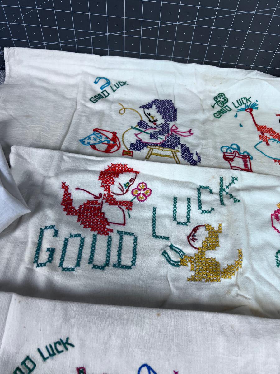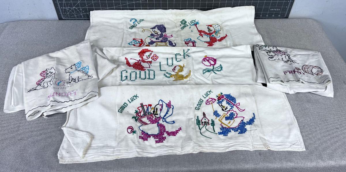 Kitty GOOD LUCK Towels (3) And (2) Puppy Friday & Sunday Towels Embroidered.
