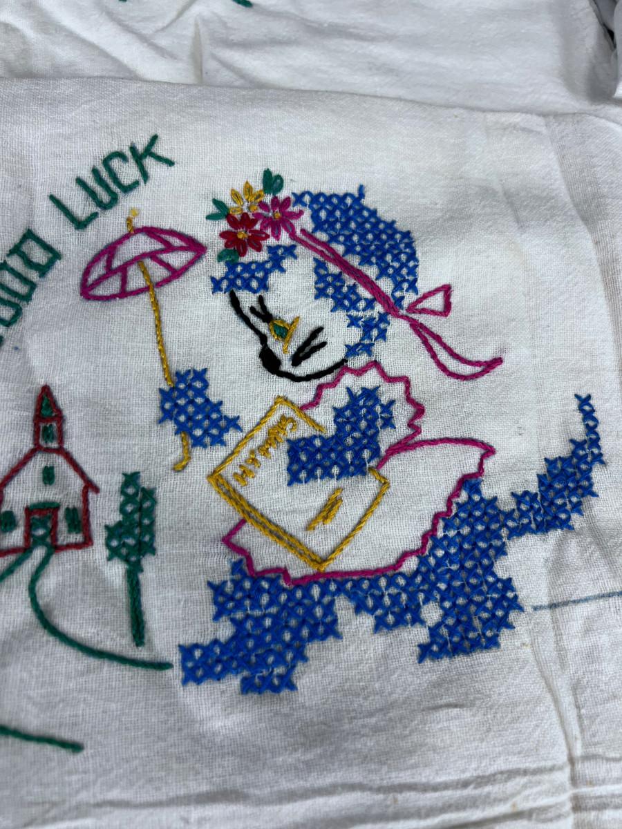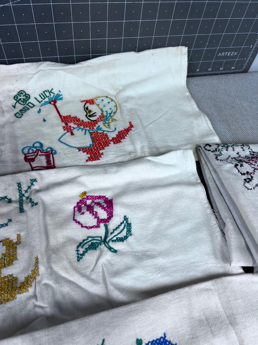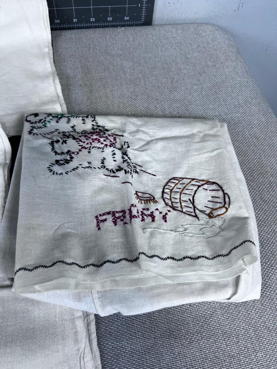 Kitty GOOD LUCK Towels (3) And (2) Puppy Friday & Sunday Towels Embroidered.