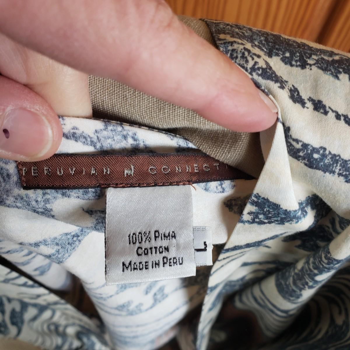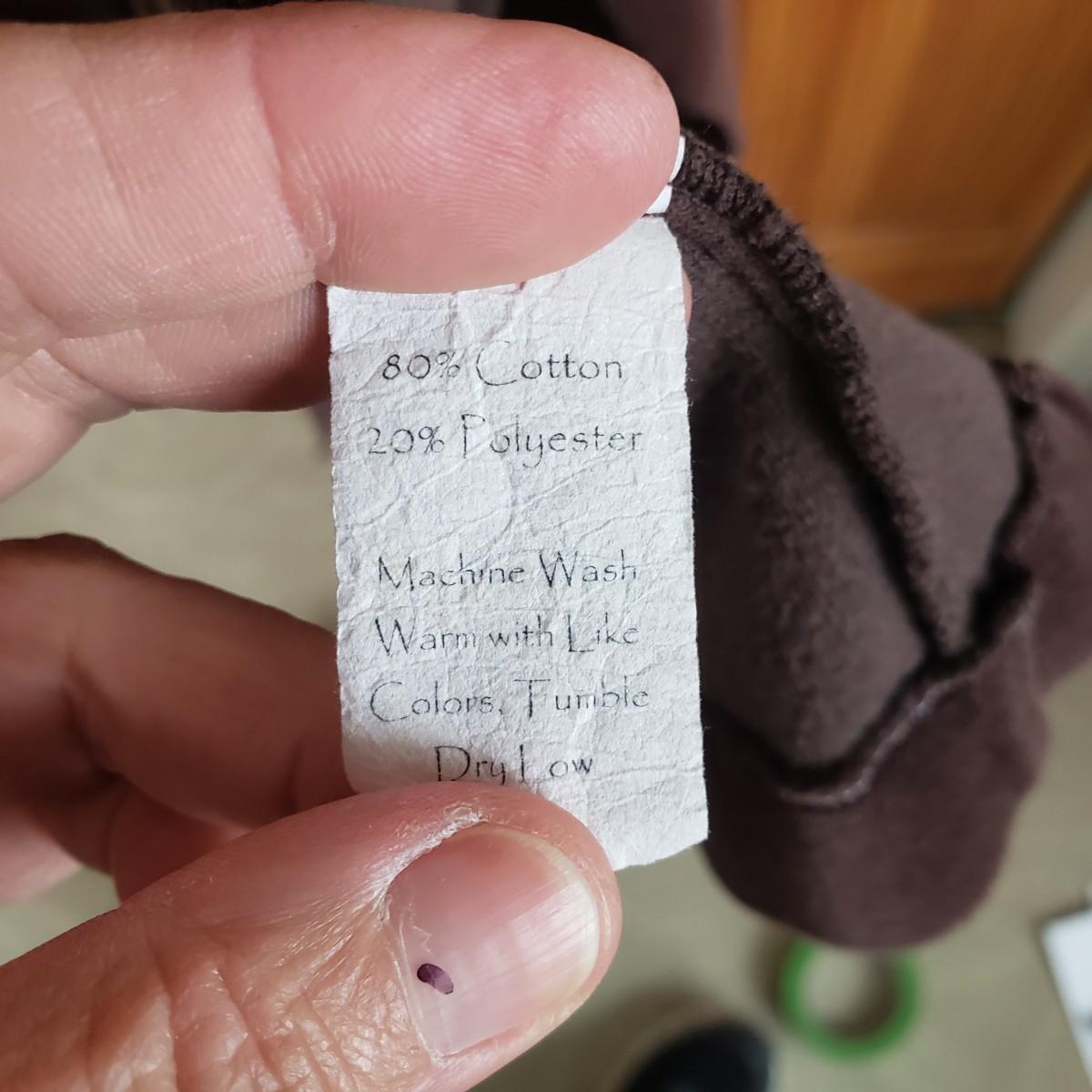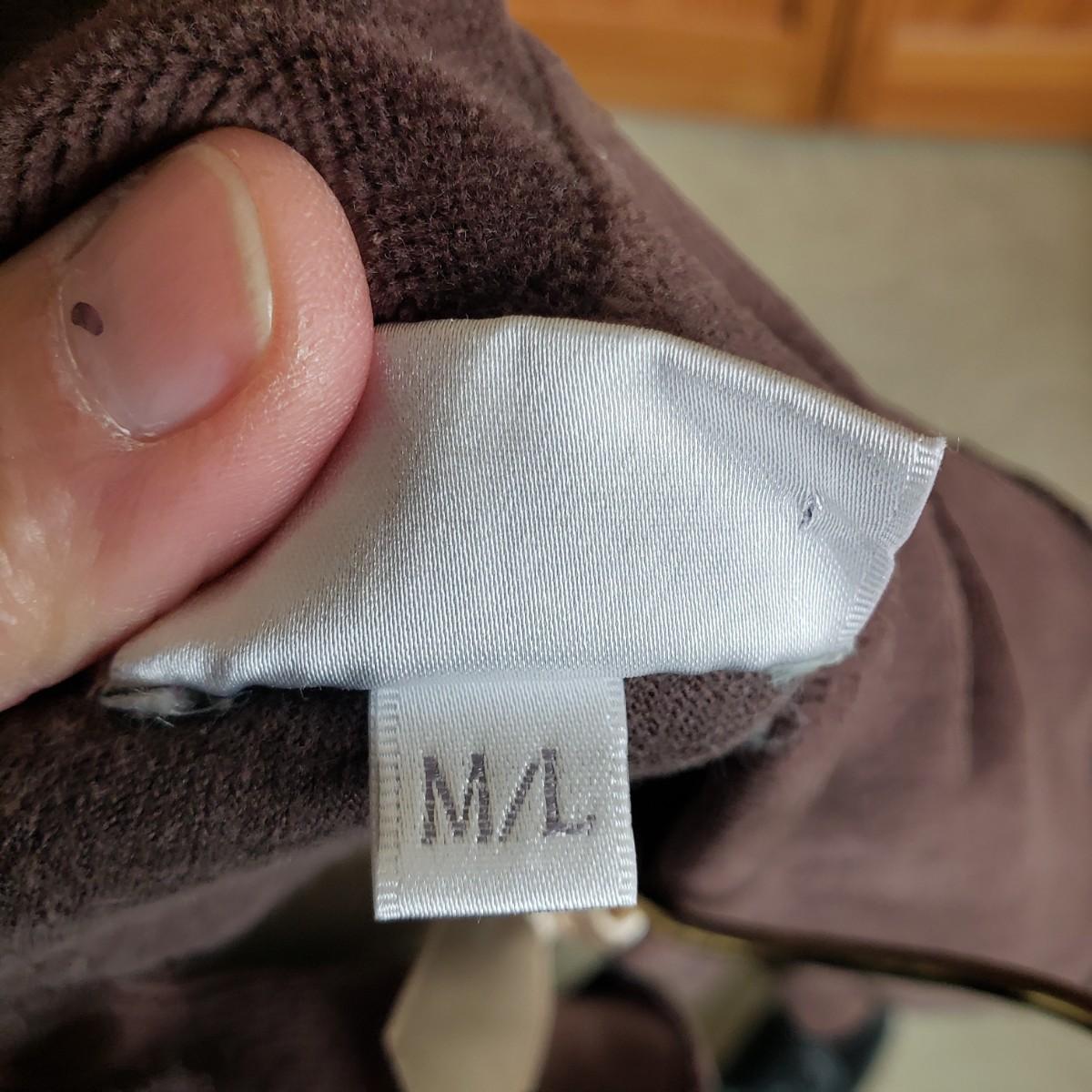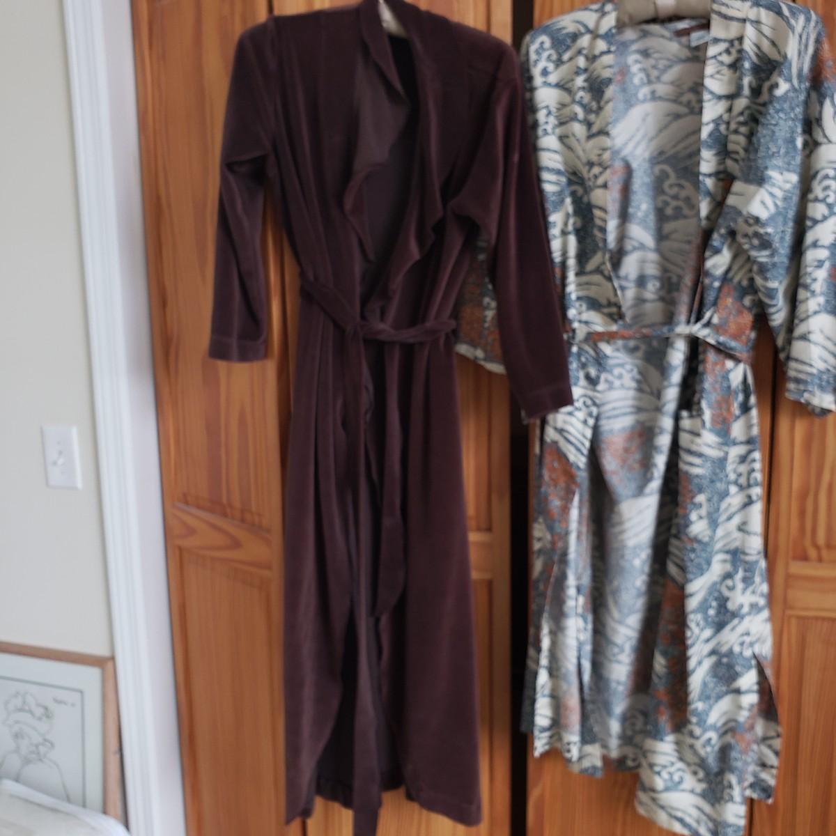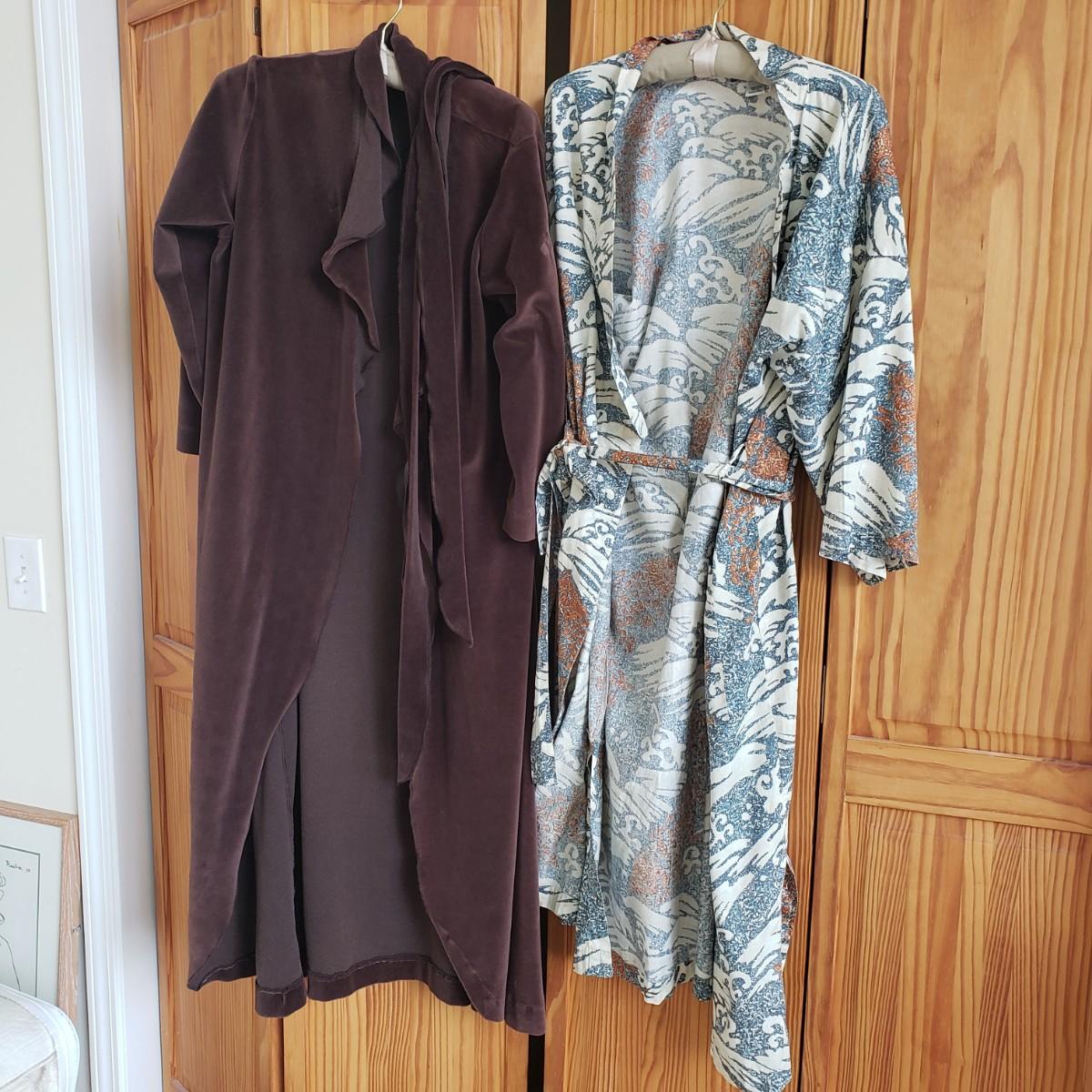 This two piece lot has a Pima cotton robe by Peruvian Connections, size large. This robe is a thinner cotton. The brown very soft robe is made by Kiyomi and is size medium/large. Both robes have pockets!
