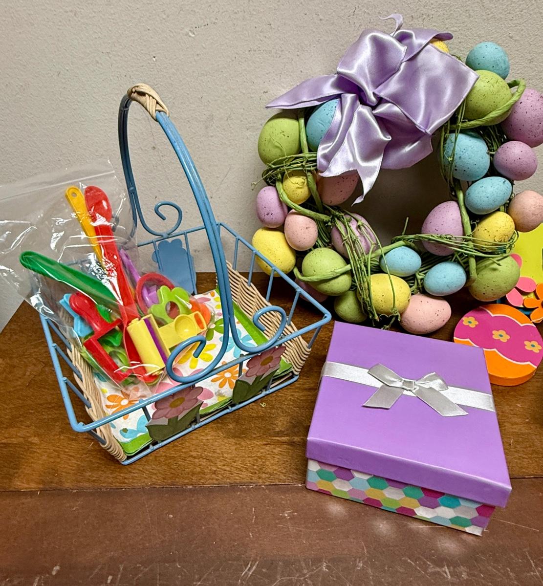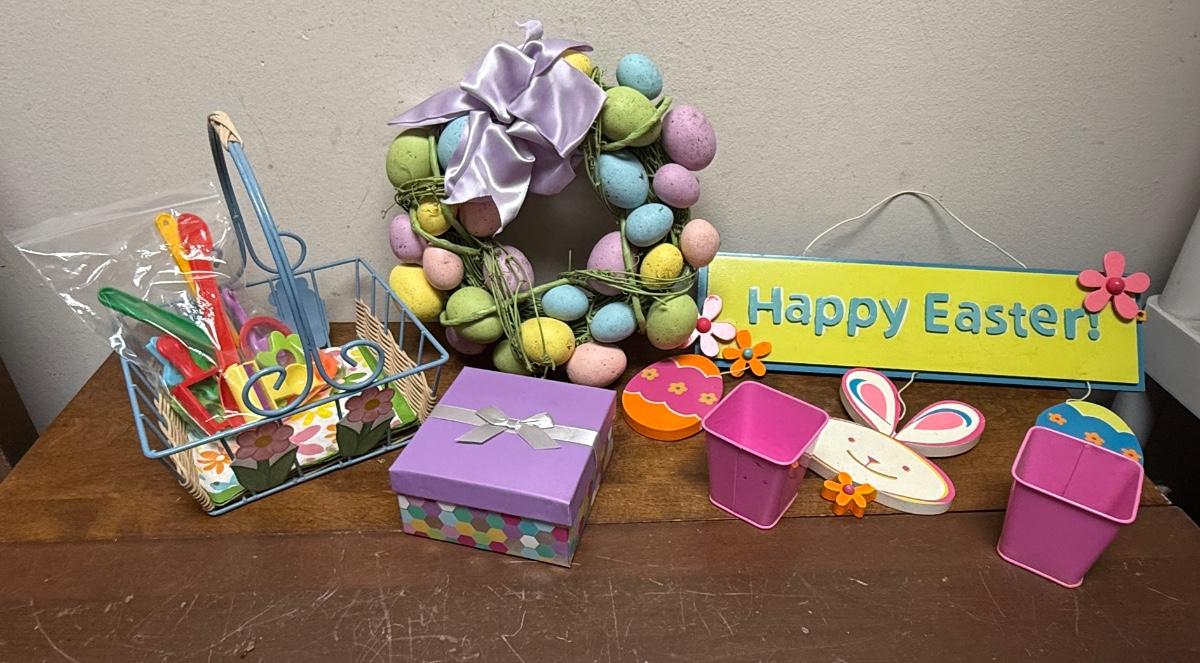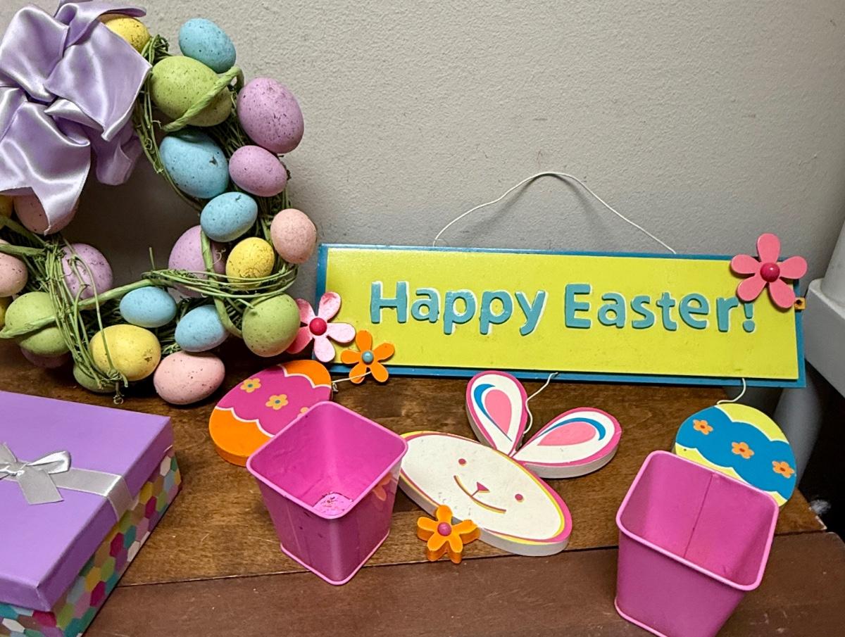 Wreath made with colored eggs, hanging signs, metal baskets, boxes and more.