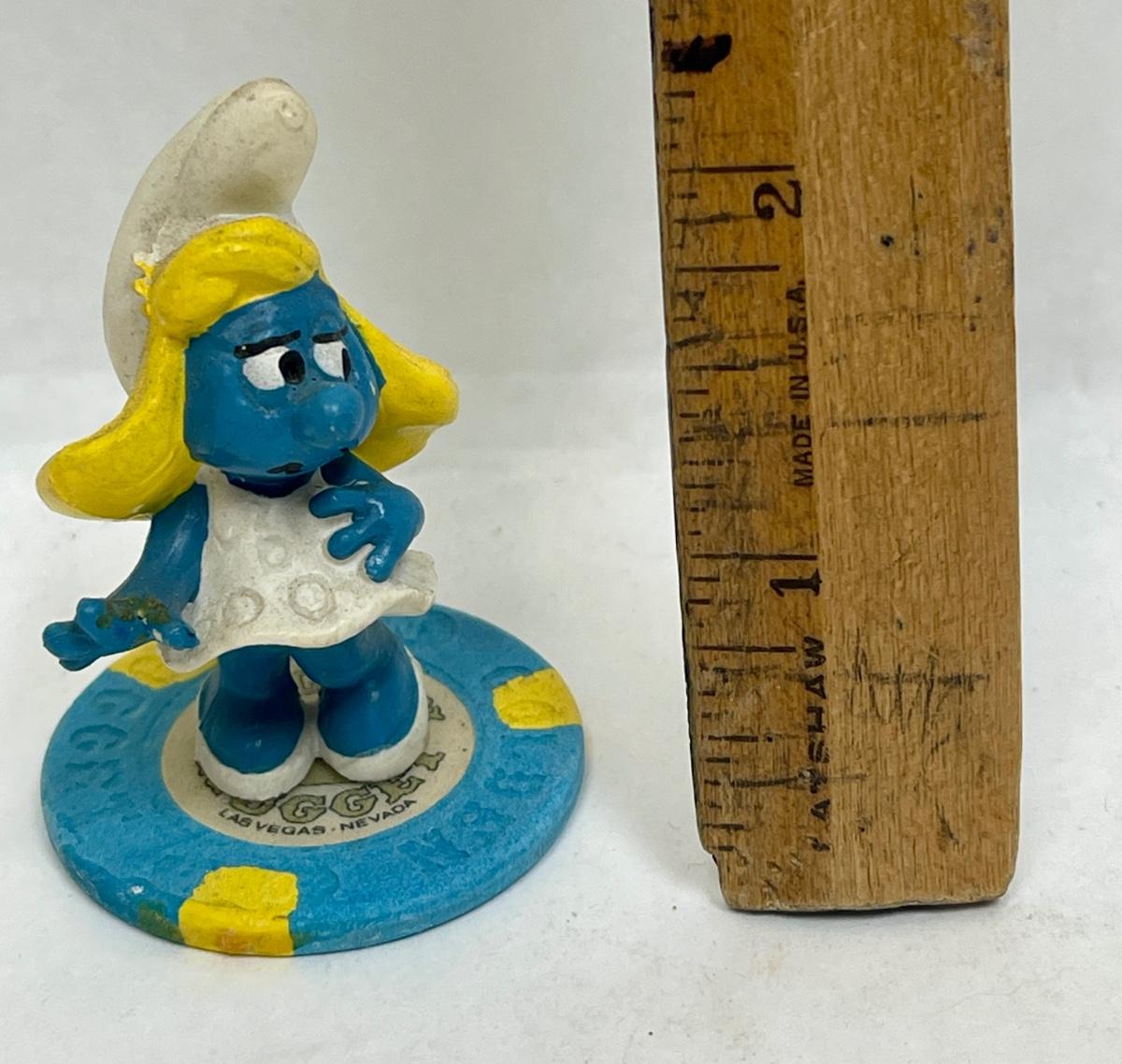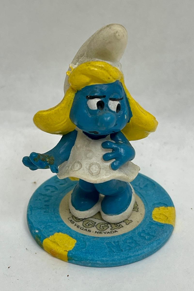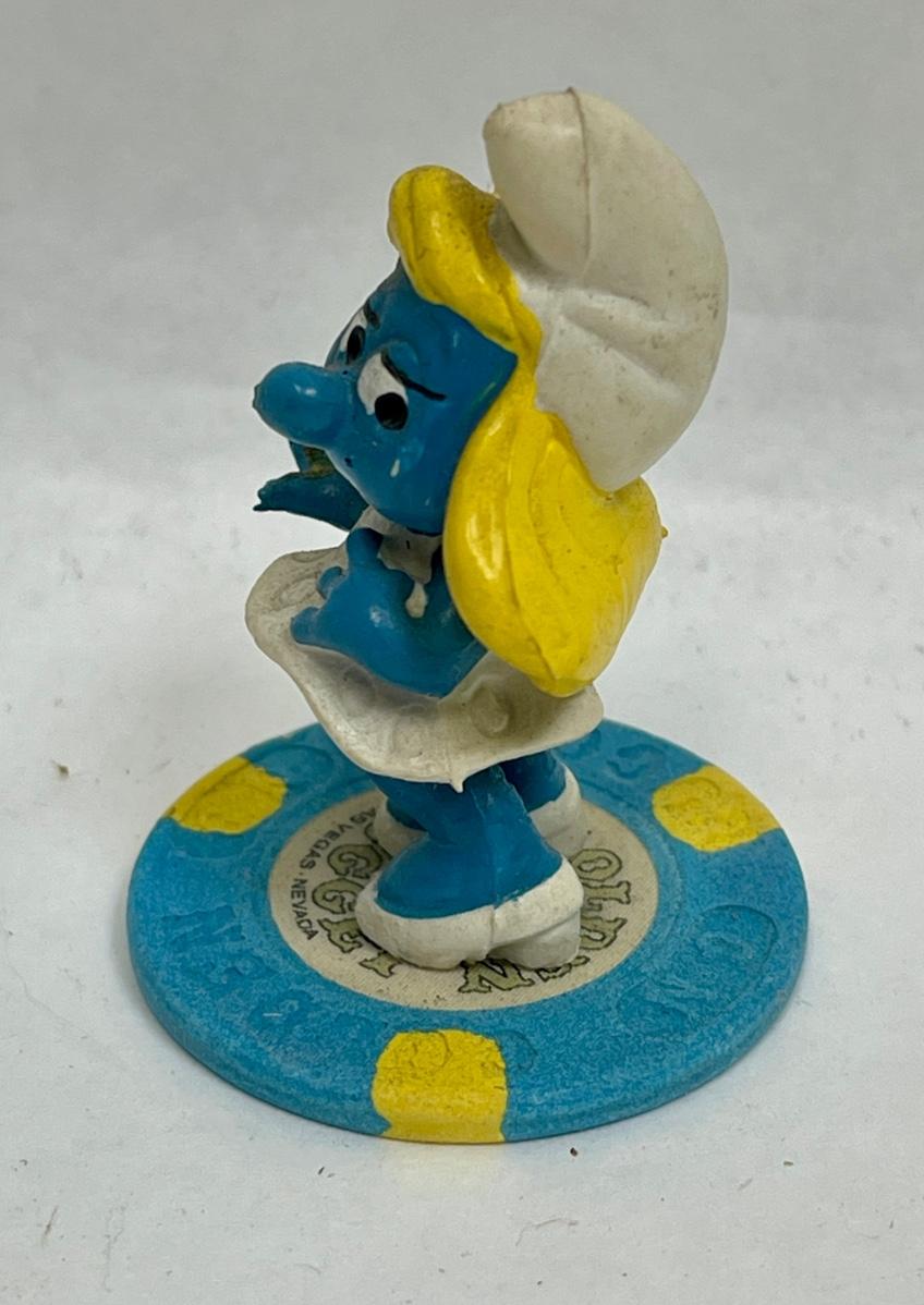 Plastic Smurfette Figurine attached to a Golden Nugget $1 casino chip. Whimsical collectible item.