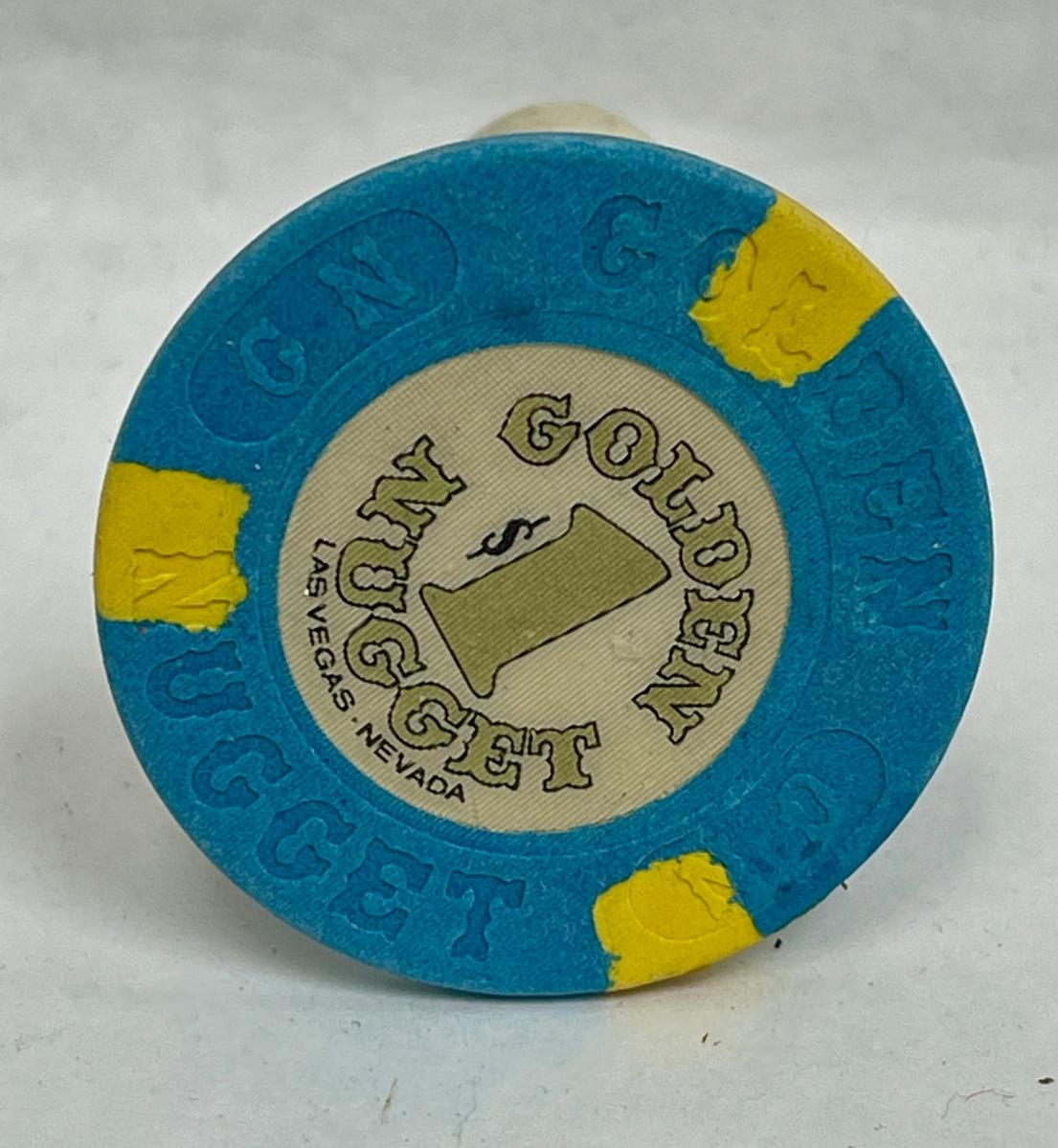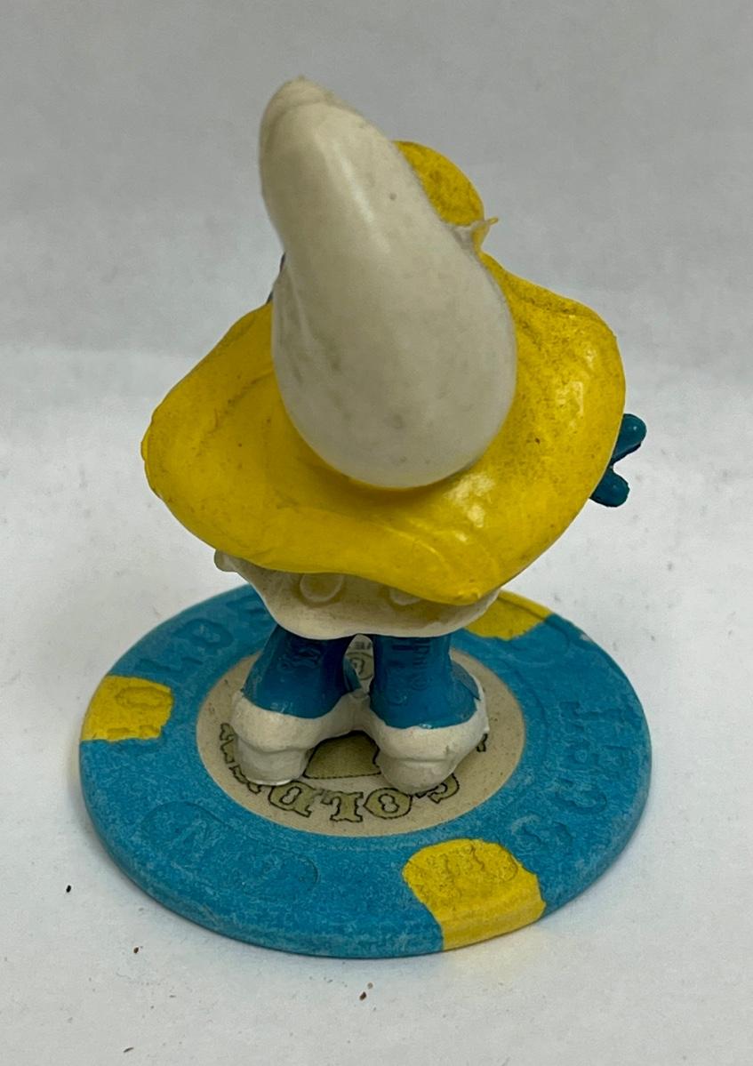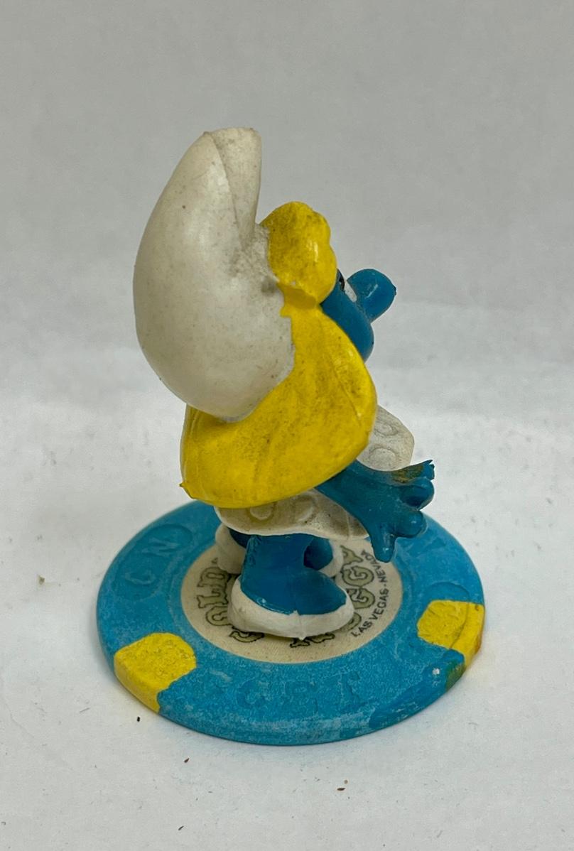 Plastic Smurfette Figurine attached to a Golden Nugget $1 casino chip. Whimsical collectible item.