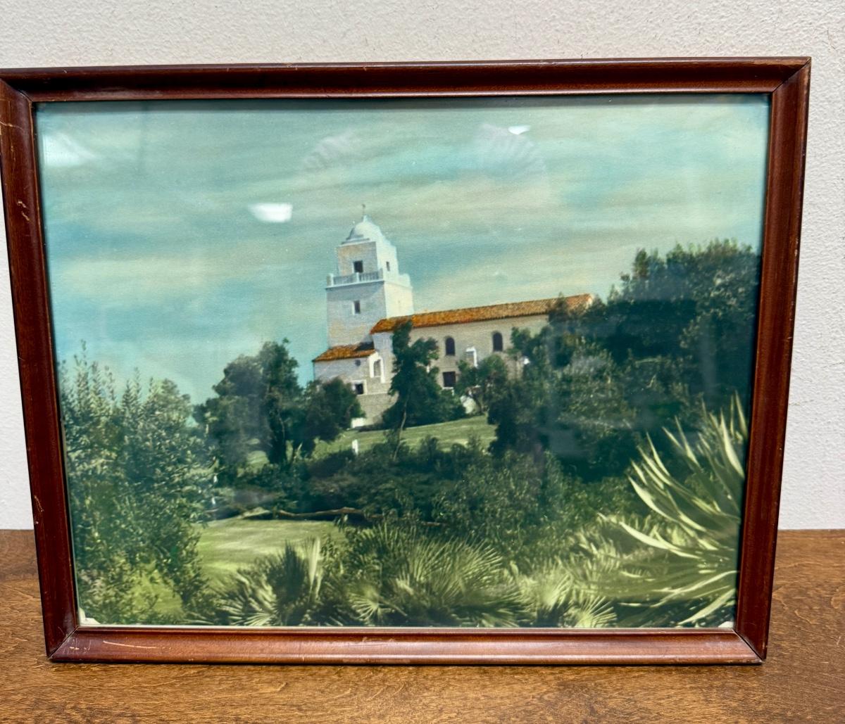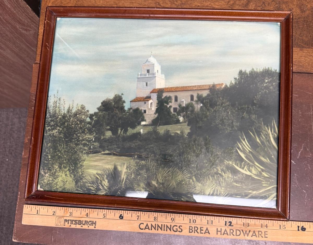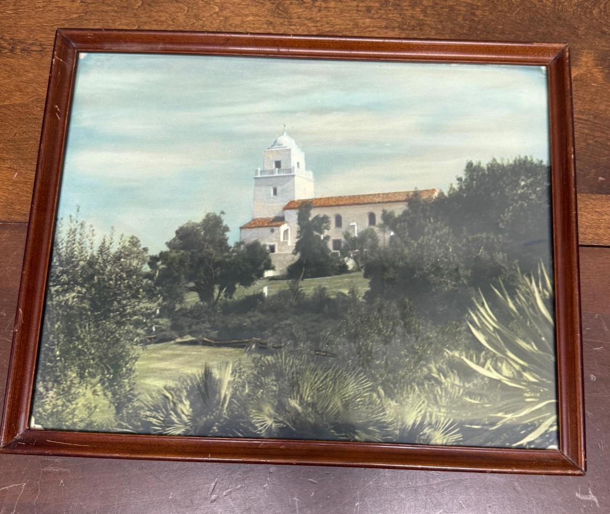 Junipero Serra Museum Presidio Hill San Diego painting unknown artist original? in mahogany frame 12" x 15"