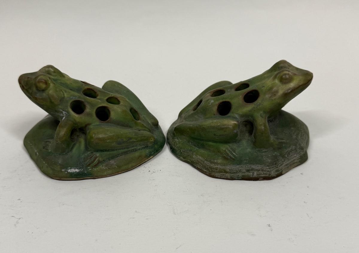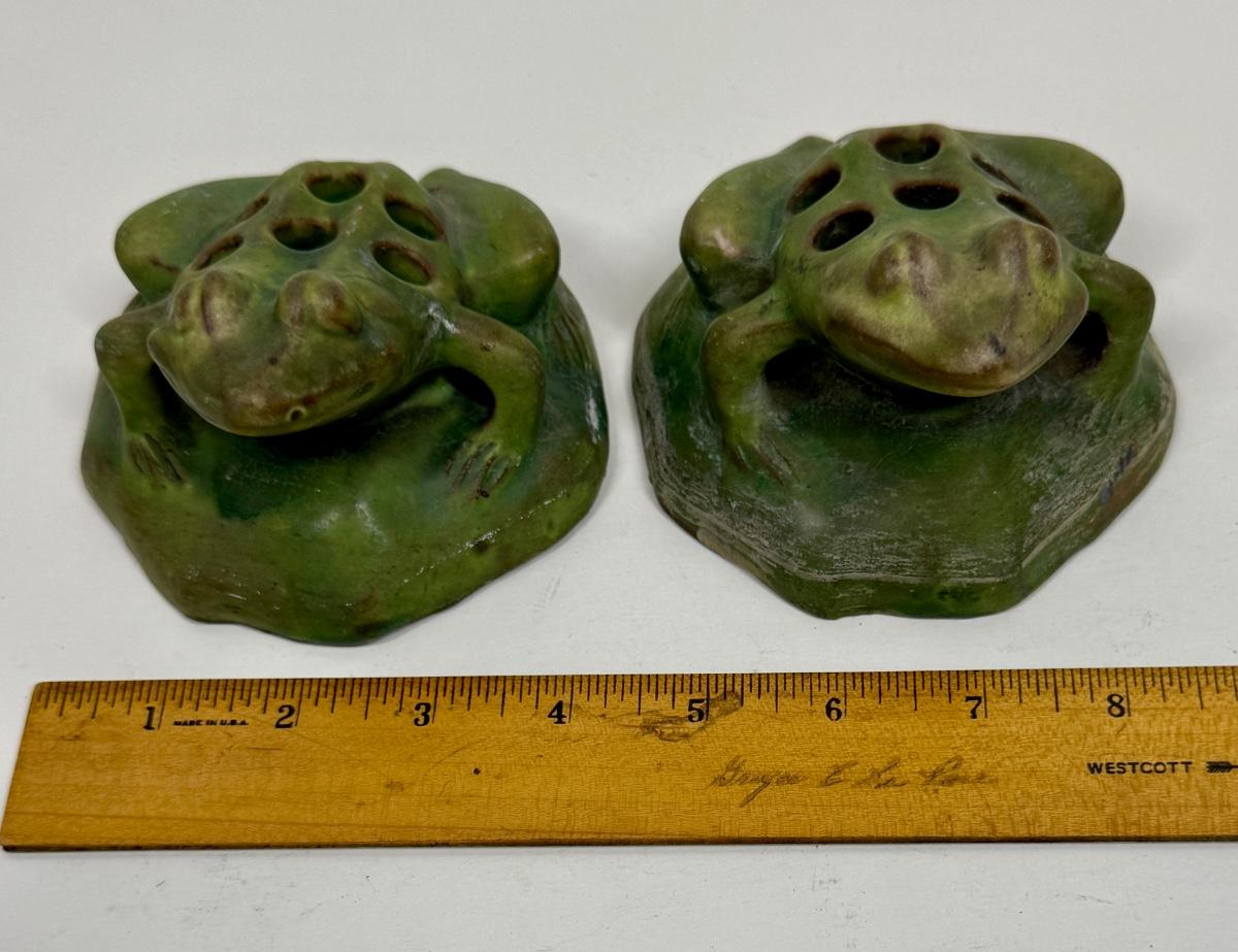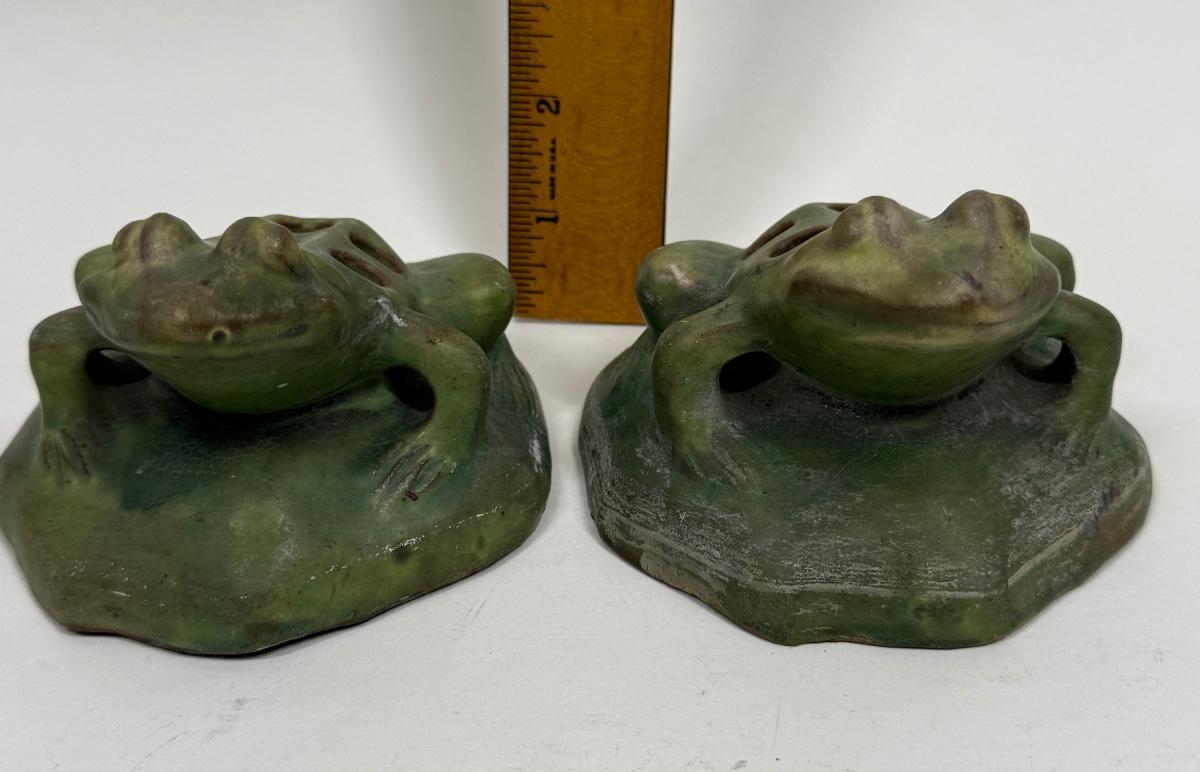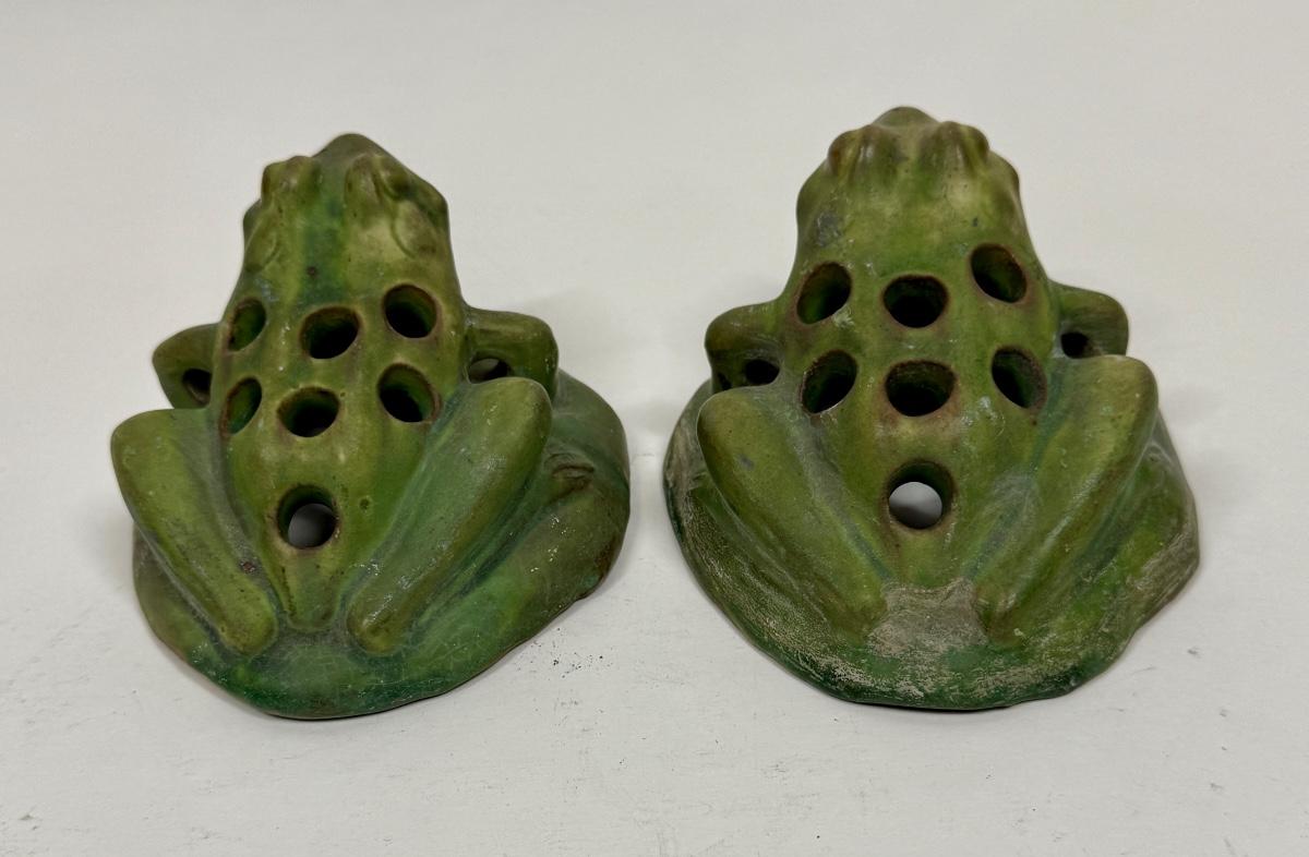 Antique Green Pottery Figural Frog Pair - Flower Frogs with 7 holes for floral arrangements