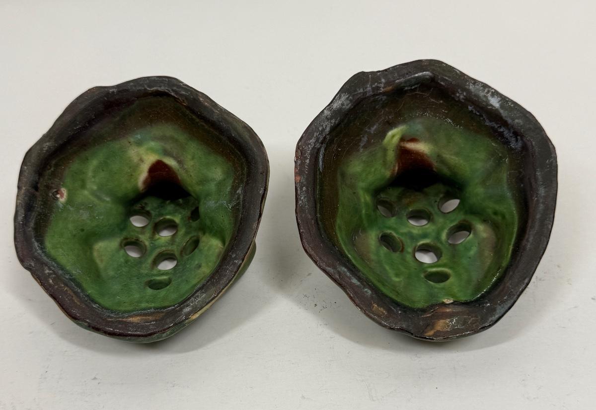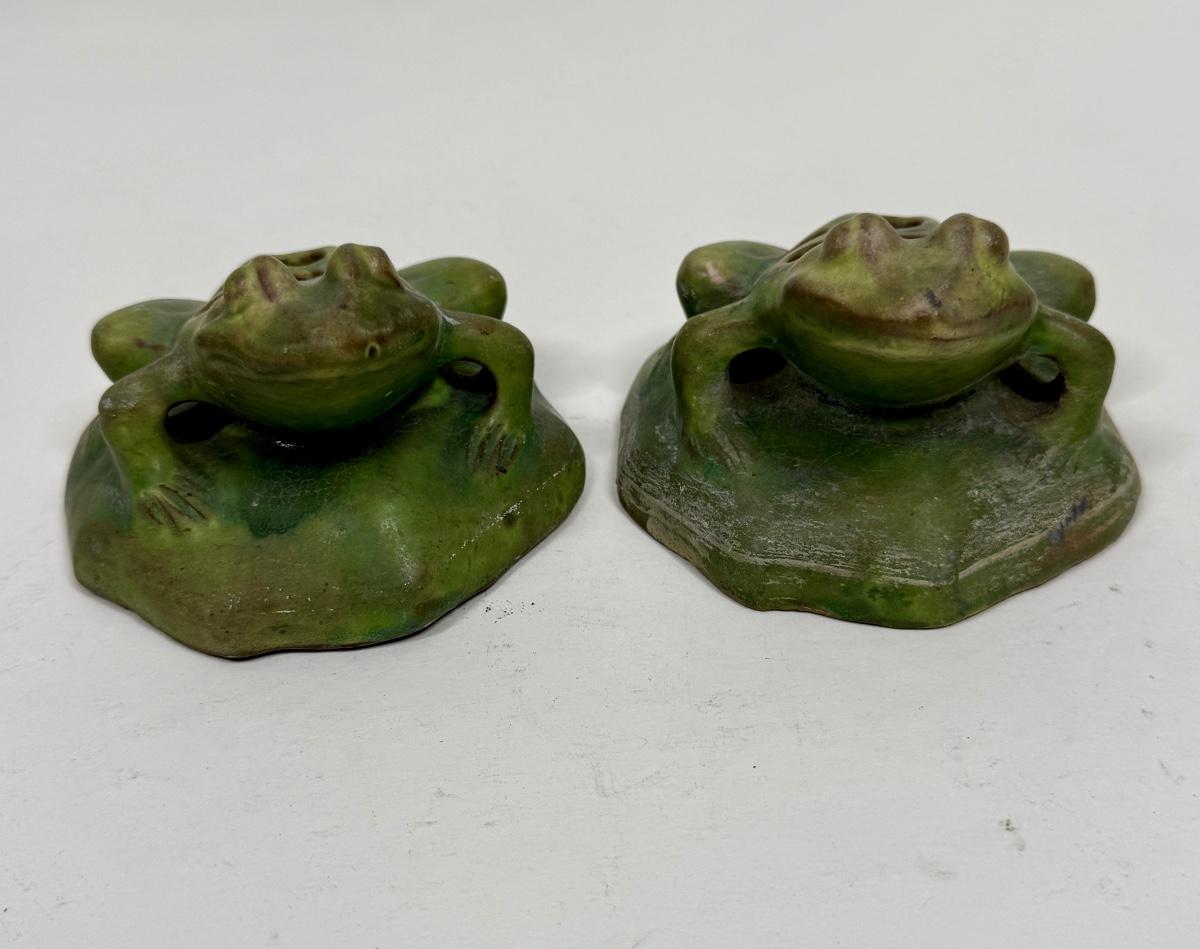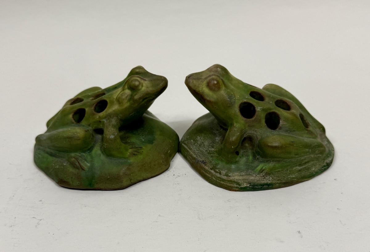 Antique Green Pottery Figural Frog Pair - Flower Frogs with 7 holes for floral arrangements