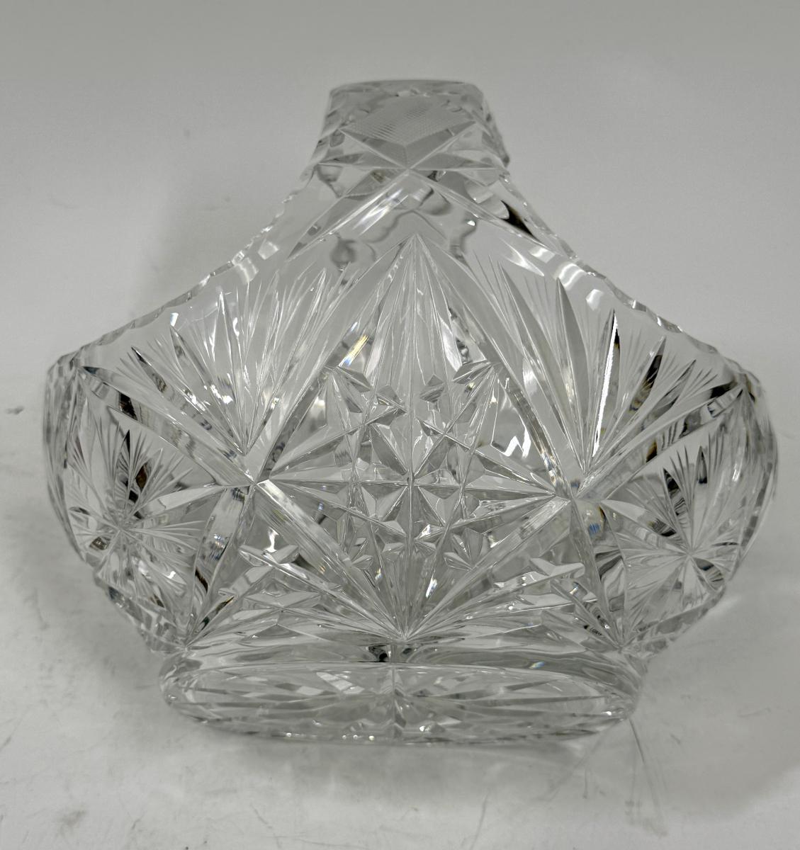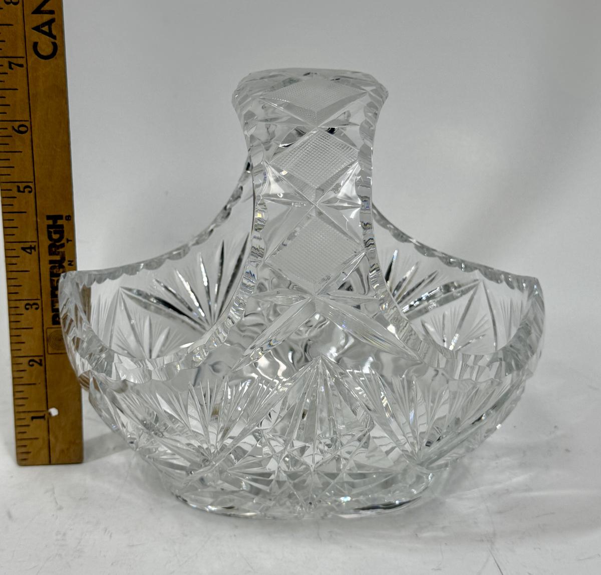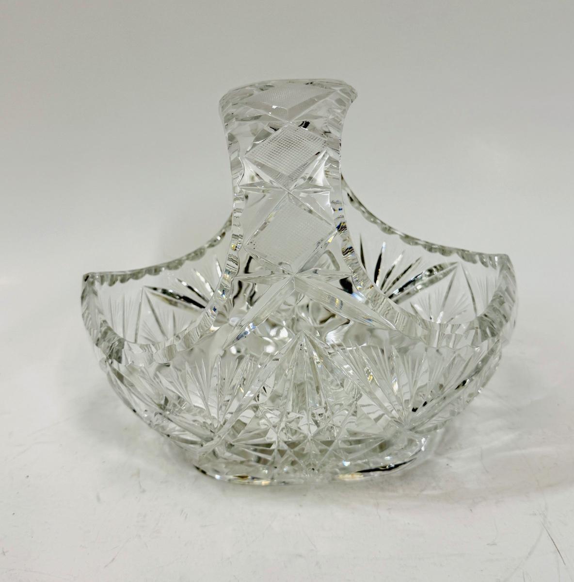 Vintage Clear Lead Crystal Glass Starburst Pinwheel Cut Basket With Handle