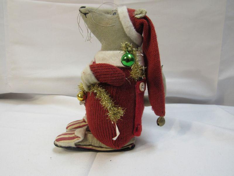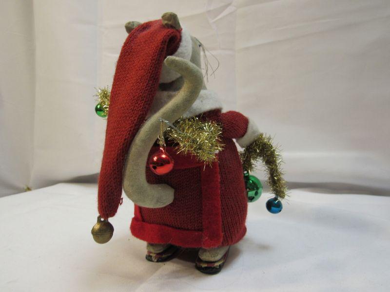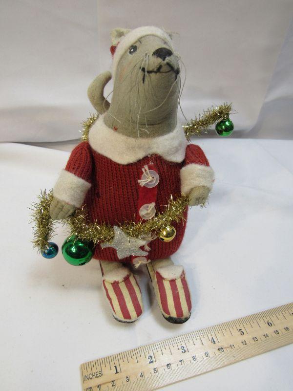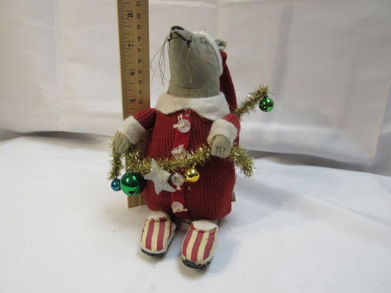 Christmas holiday plush mouse. Holding decorations, wearing red with Santa hat. About 8" size.