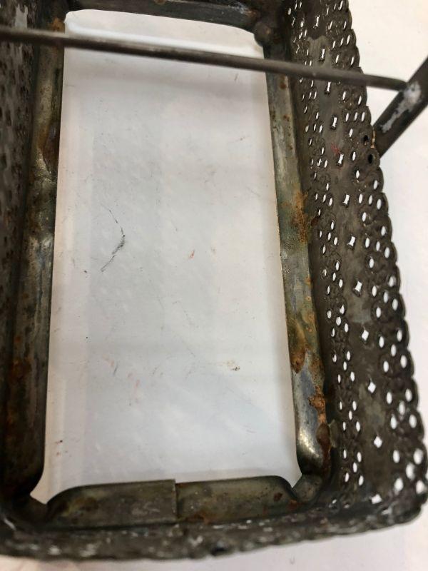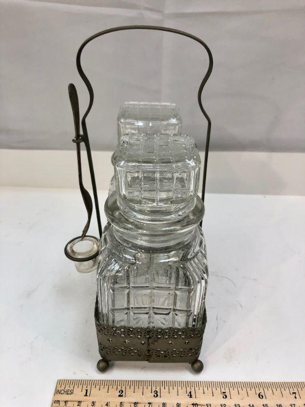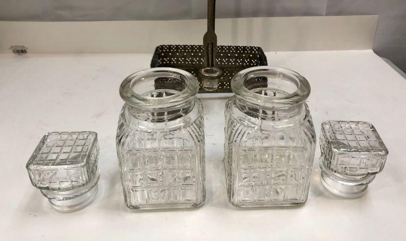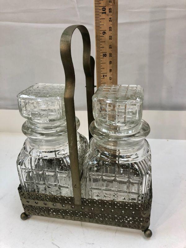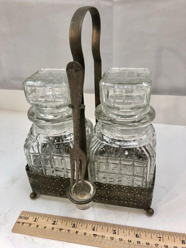 Vintage condiment caddy. Metal basket with two glass jars and fork. Not sure if fork is original. Metal has signs of age. #022-0459
