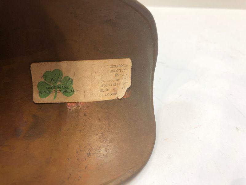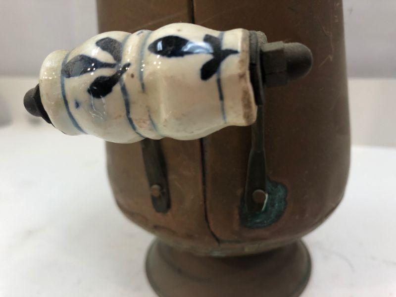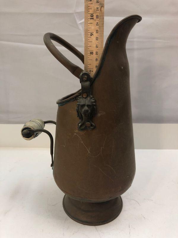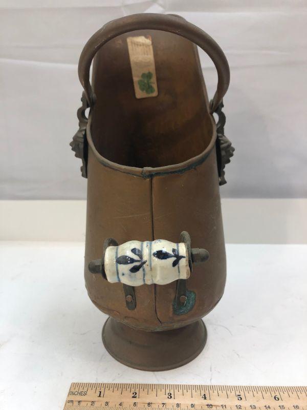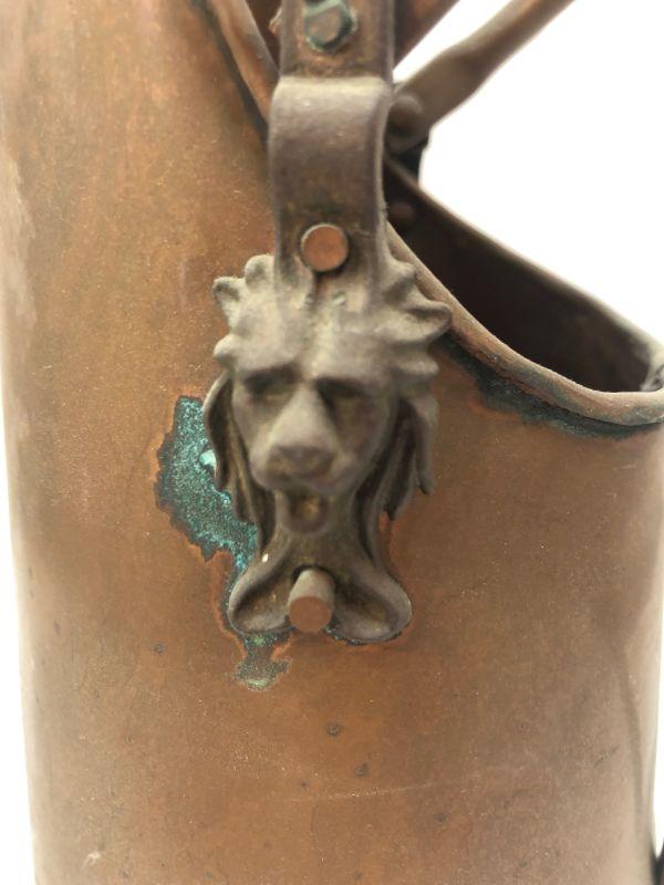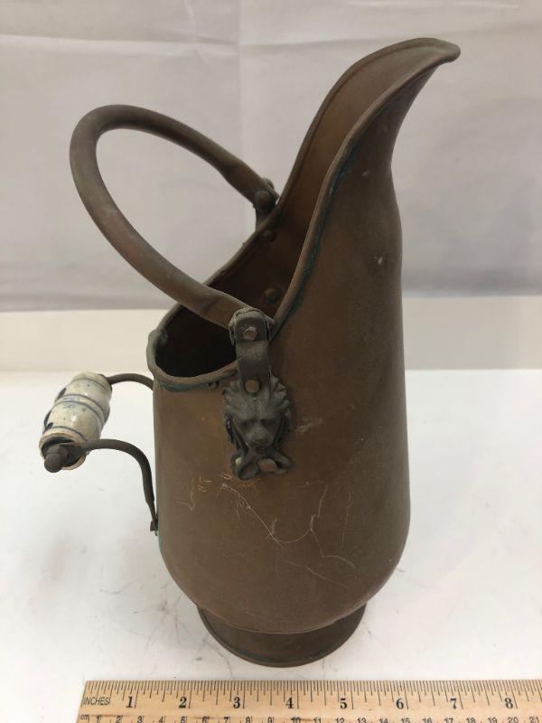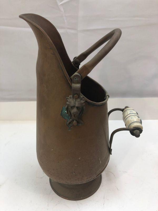 Vintage watering pail. Copper pot has lion head details on sides and a ceramic handle. Does have signs of age and wear but displays nicely. #022-0465