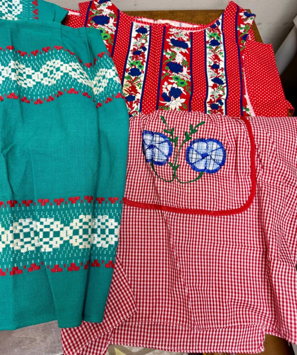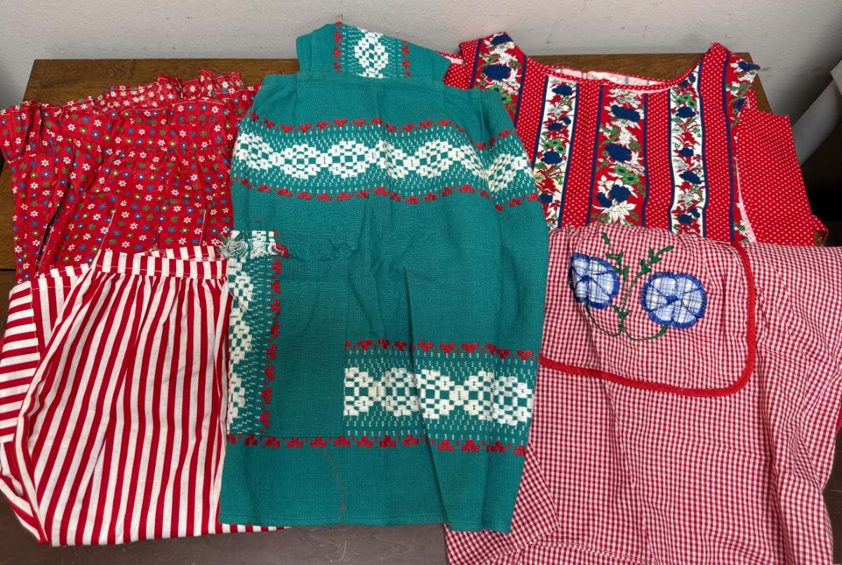 Vintage Apron Lot - 5 homemade aprons - reds and green colors skirt smock embroidered floral pattern