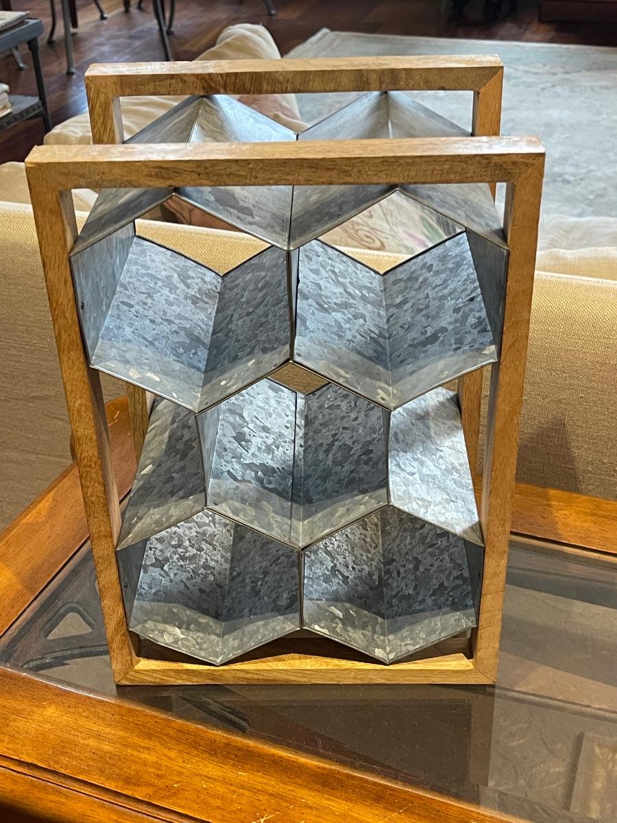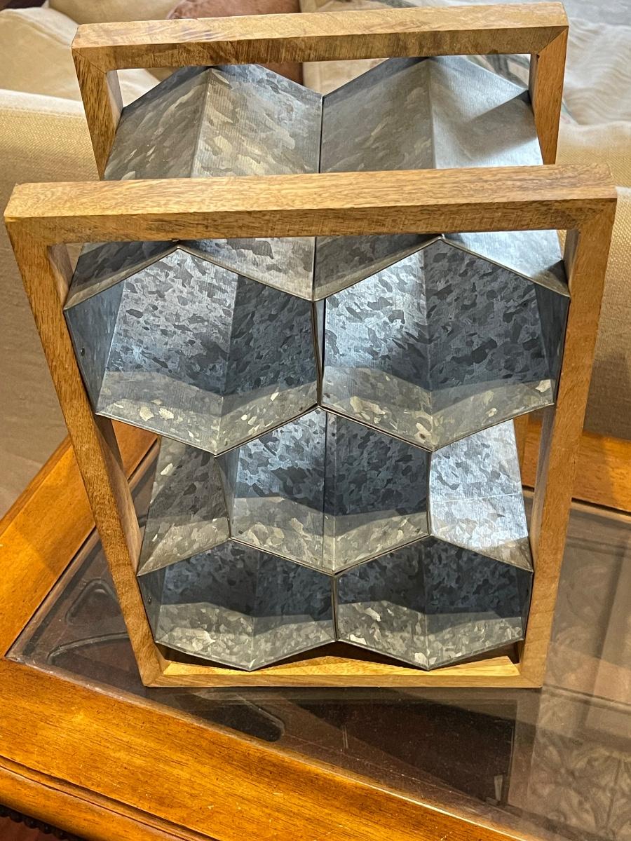 This unique piece measures 14 x 10. Holds 5 Bottles.