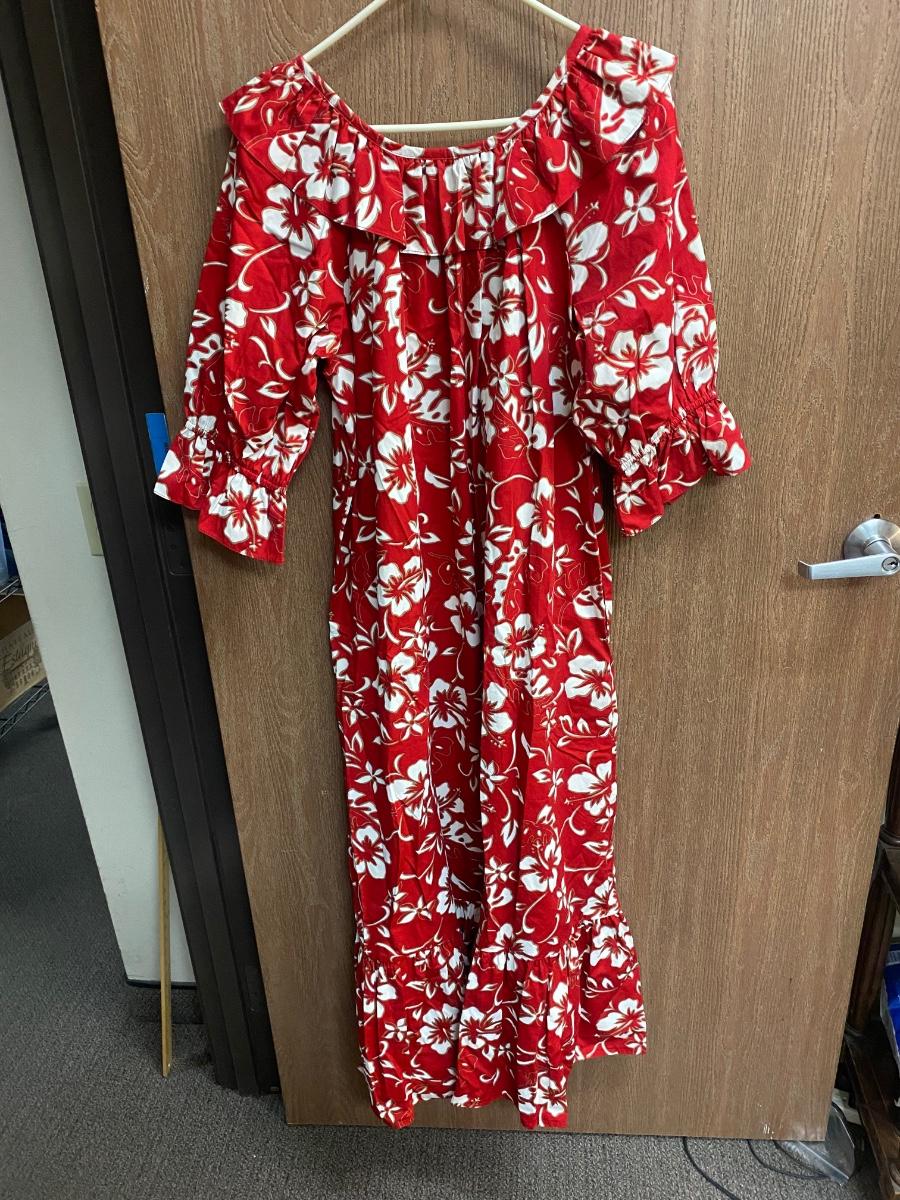 Red & White Hilo Hattie Traditional Hibiscus Pattern Hawaiian Caftan Dress Mumu