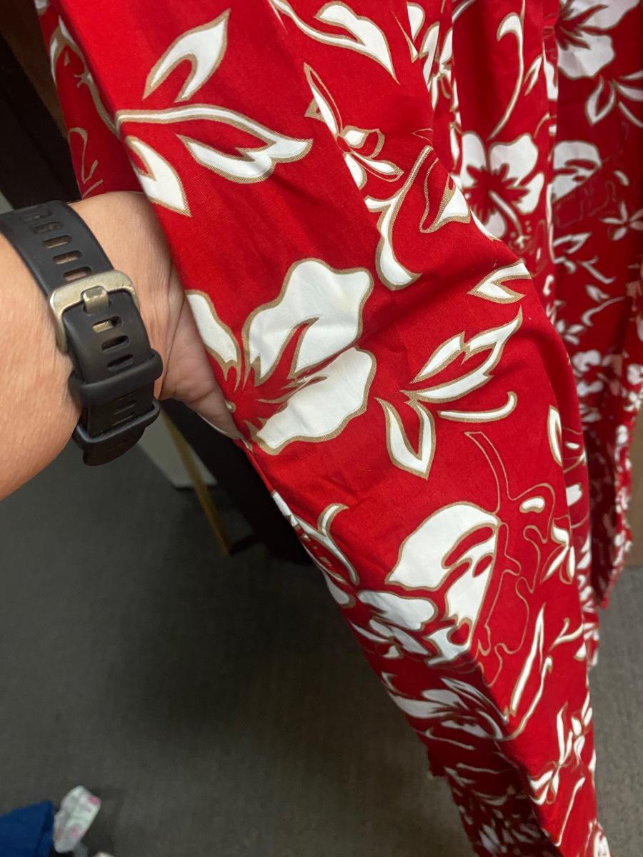 Red & White Hilo Hattie Traditional Hibiscus Pattern Hawaiian Caftan Dress Mumu. In very good condition. Size medium. Hibiscus and plumeria pattern. One pocket on the left side.