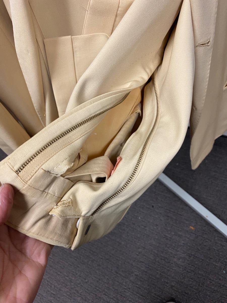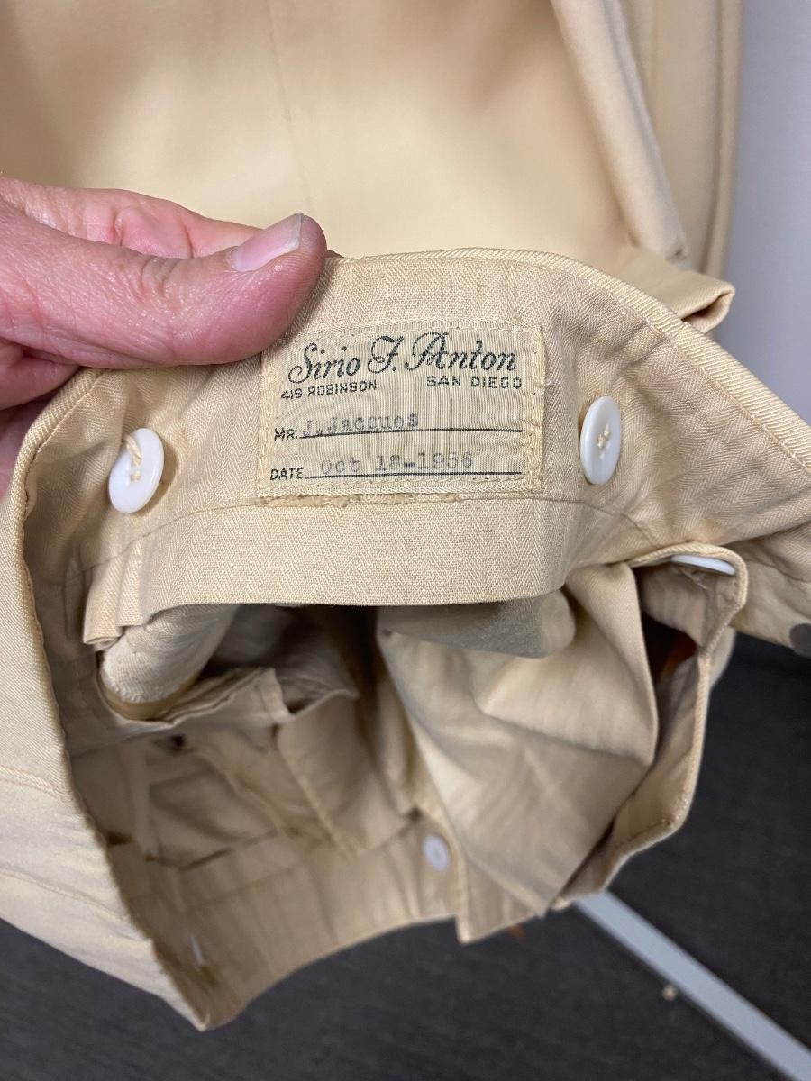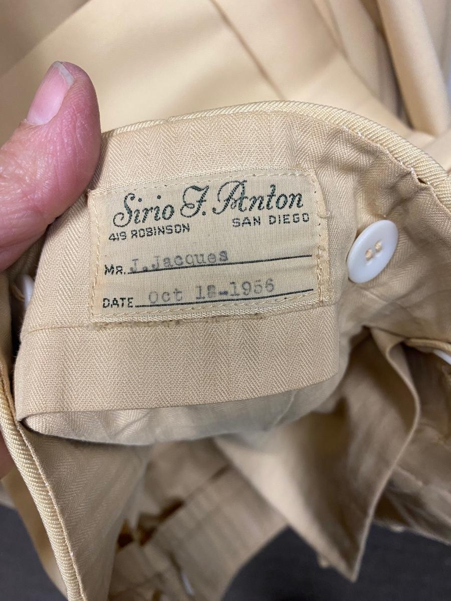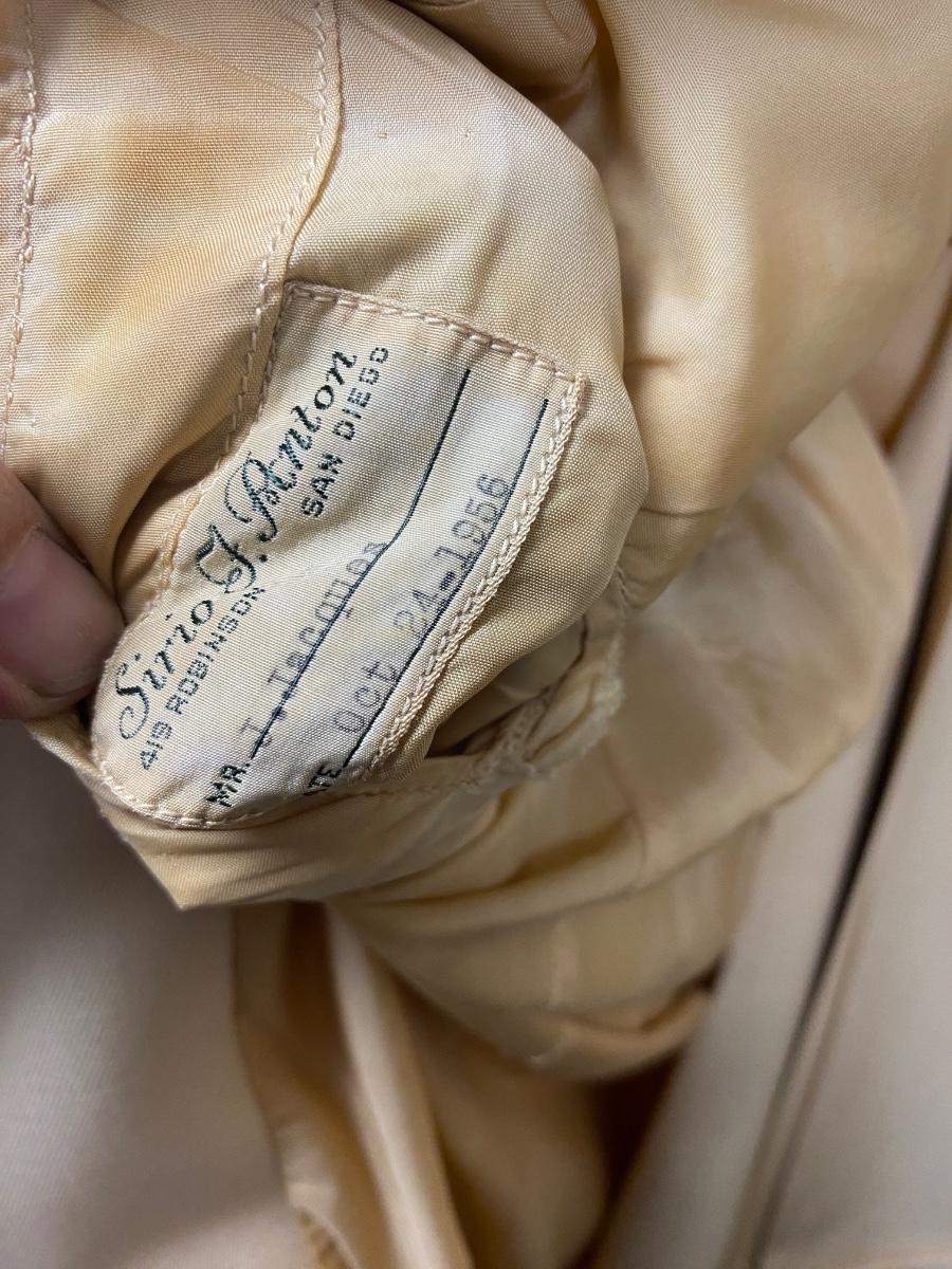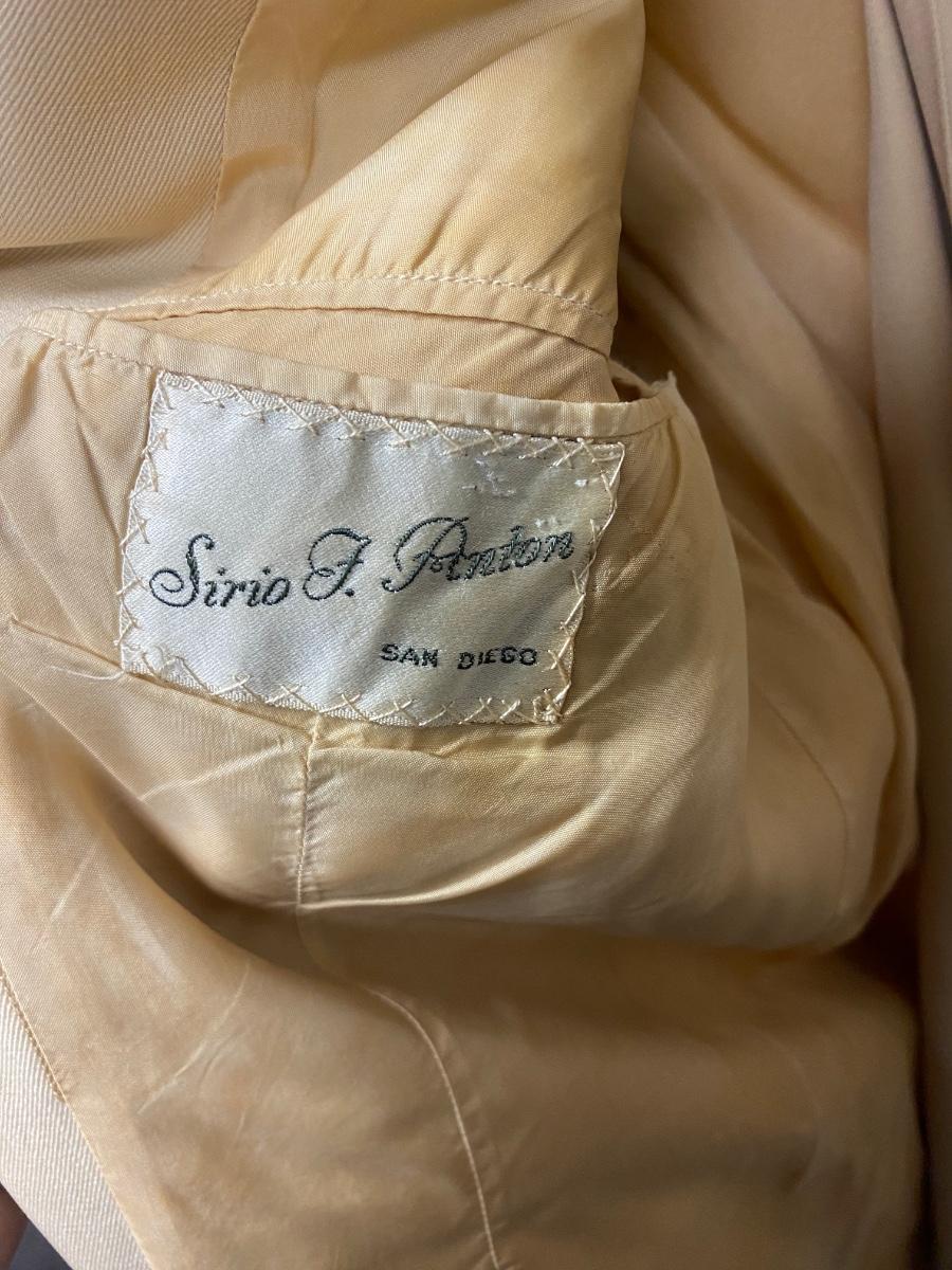 Vintage 1956 Sirio F Anton Men's Off-White Suit Jacket & Pants. In good vintage condition, light discolor from age and a tiny hole in shoulder but no major spots, stains, or damage. Around a size large.
