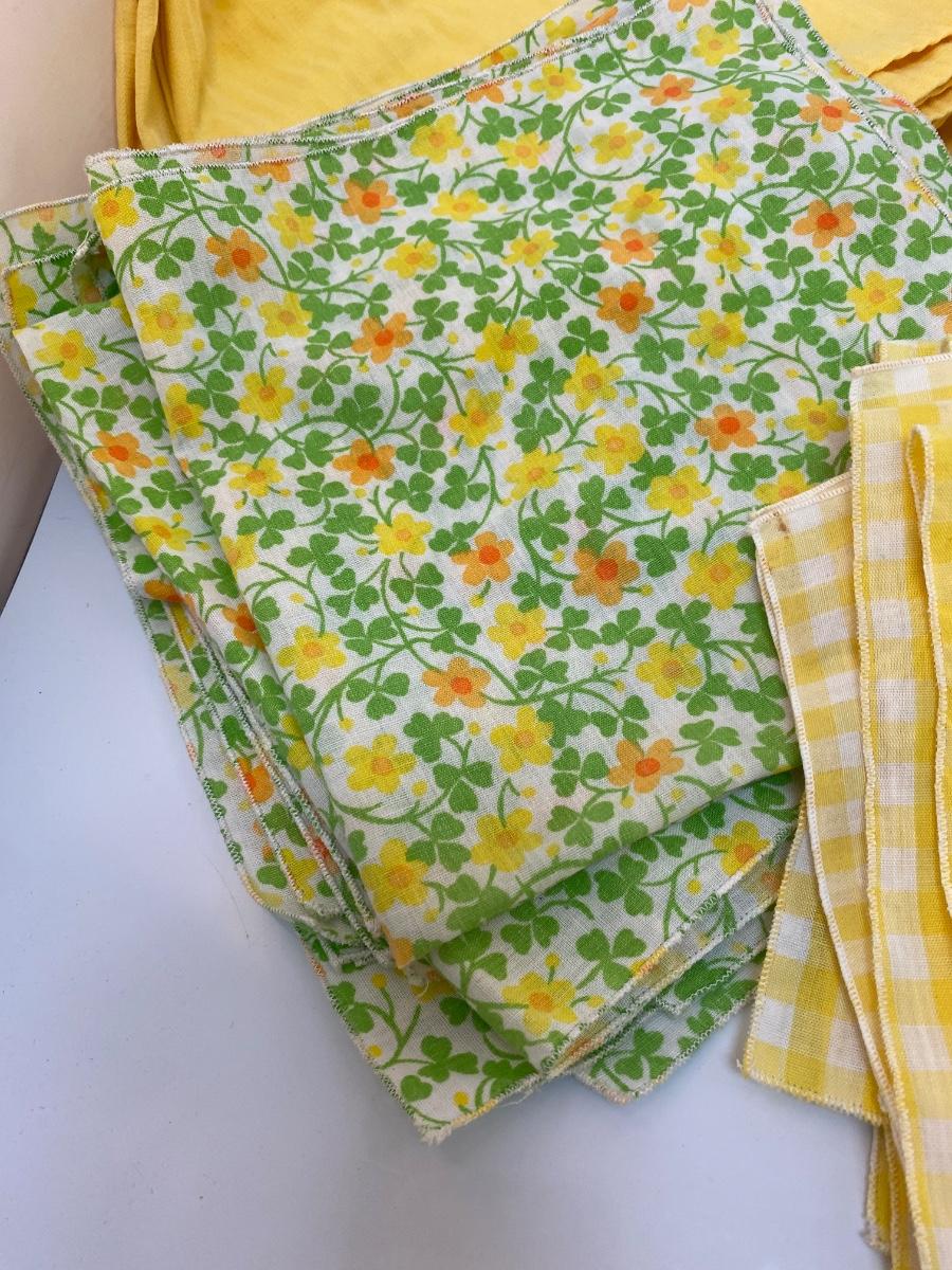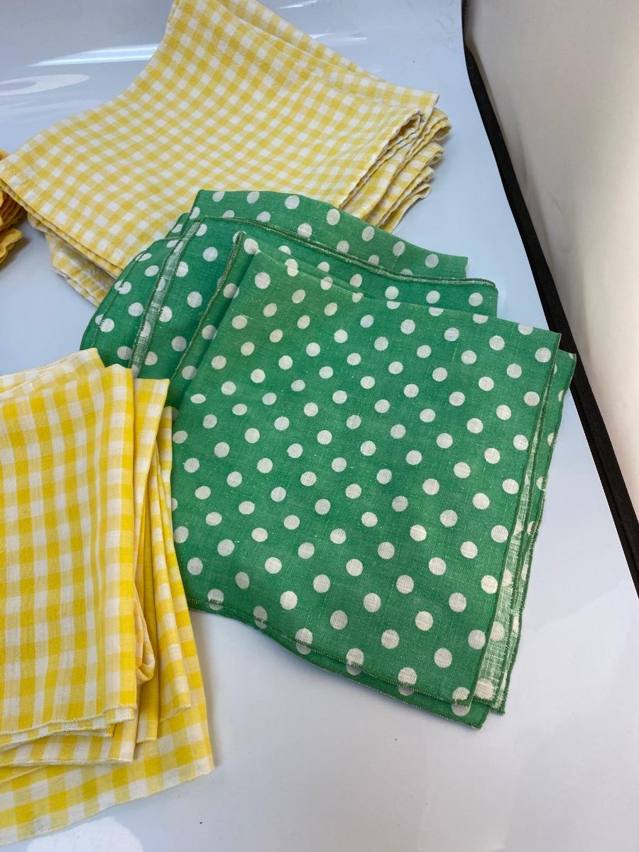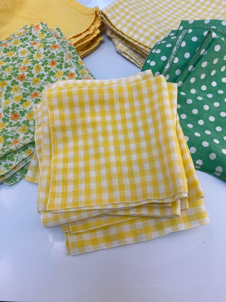 Mixed Lot of Yellow and Green Colored Dinner Fabric Napkins. In good previously used condition. Mix and match, various quantities of each pattern.