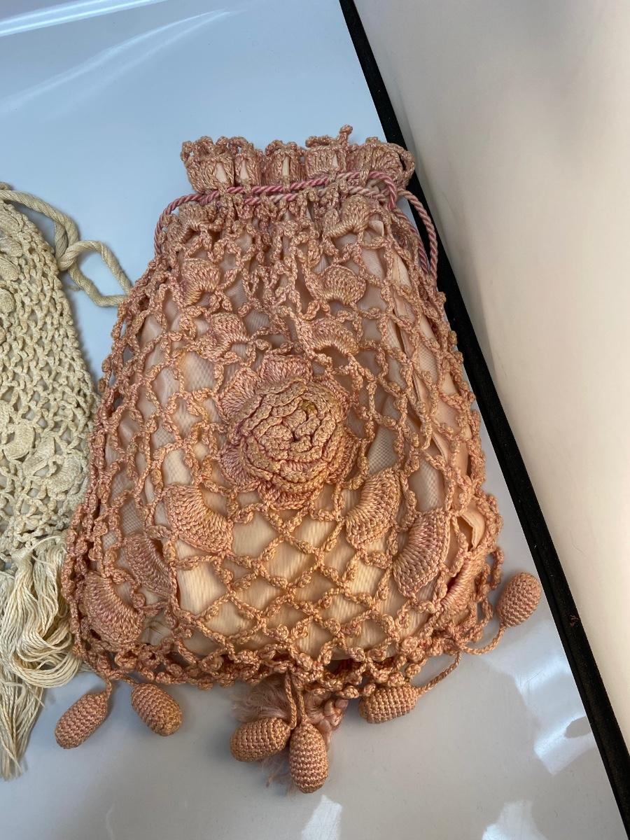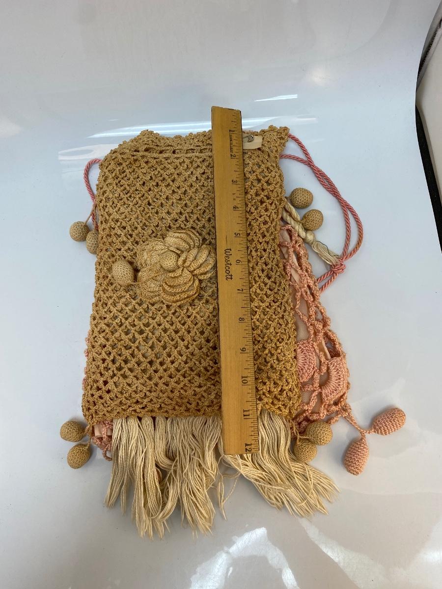 Set of 3 Vintage Victorian Boho Crochet Drawstring Purse Bag. Good vintage condition. Some light discoloration and one purse needs a new drawstring put in. About 12" size.