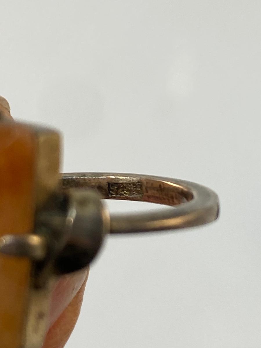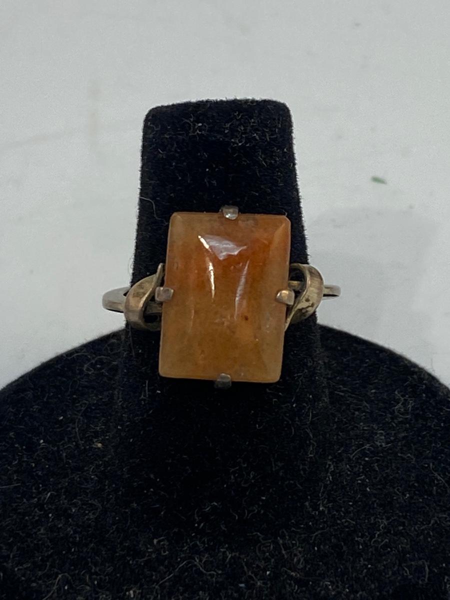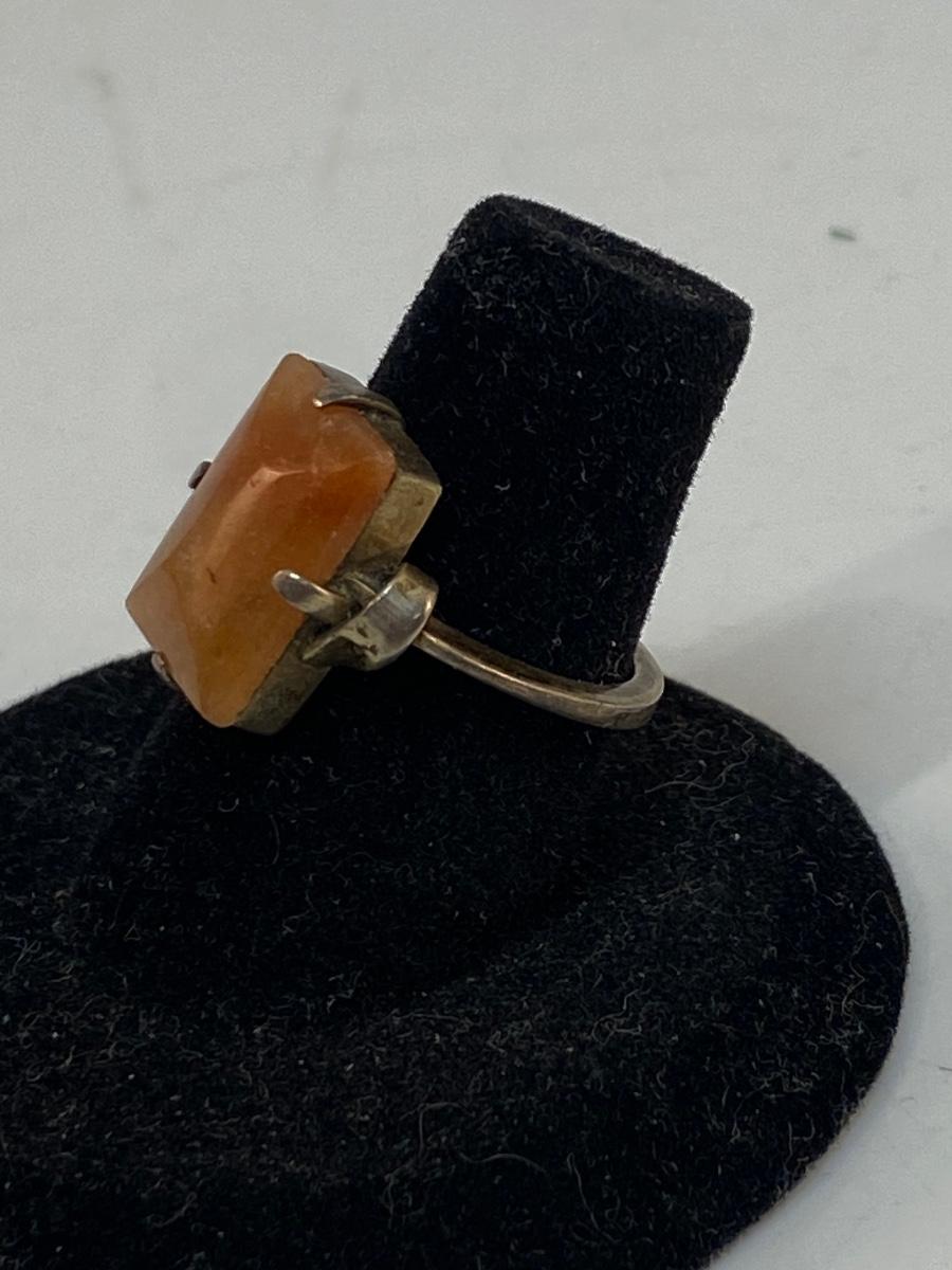 Polished Square Cut Carnelian Stone & Silver Ring. In good condition. Reddish colored stone in good condition, looks to be carnelian. There is a stamp inside, may be a sterling 925 mark but hard to read. About a size 6.