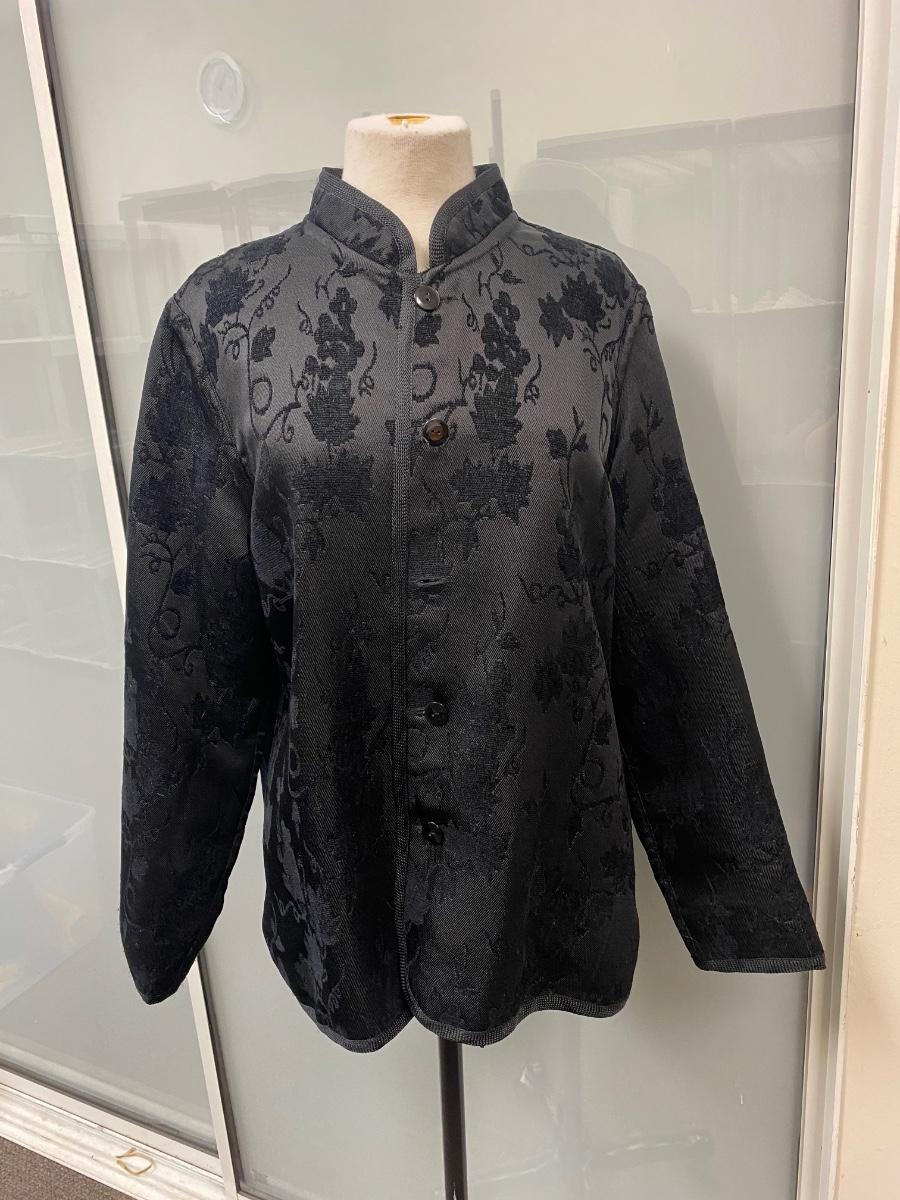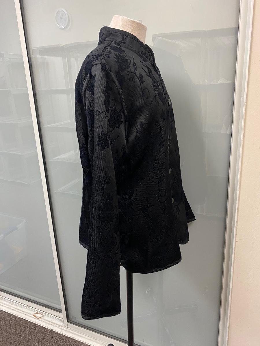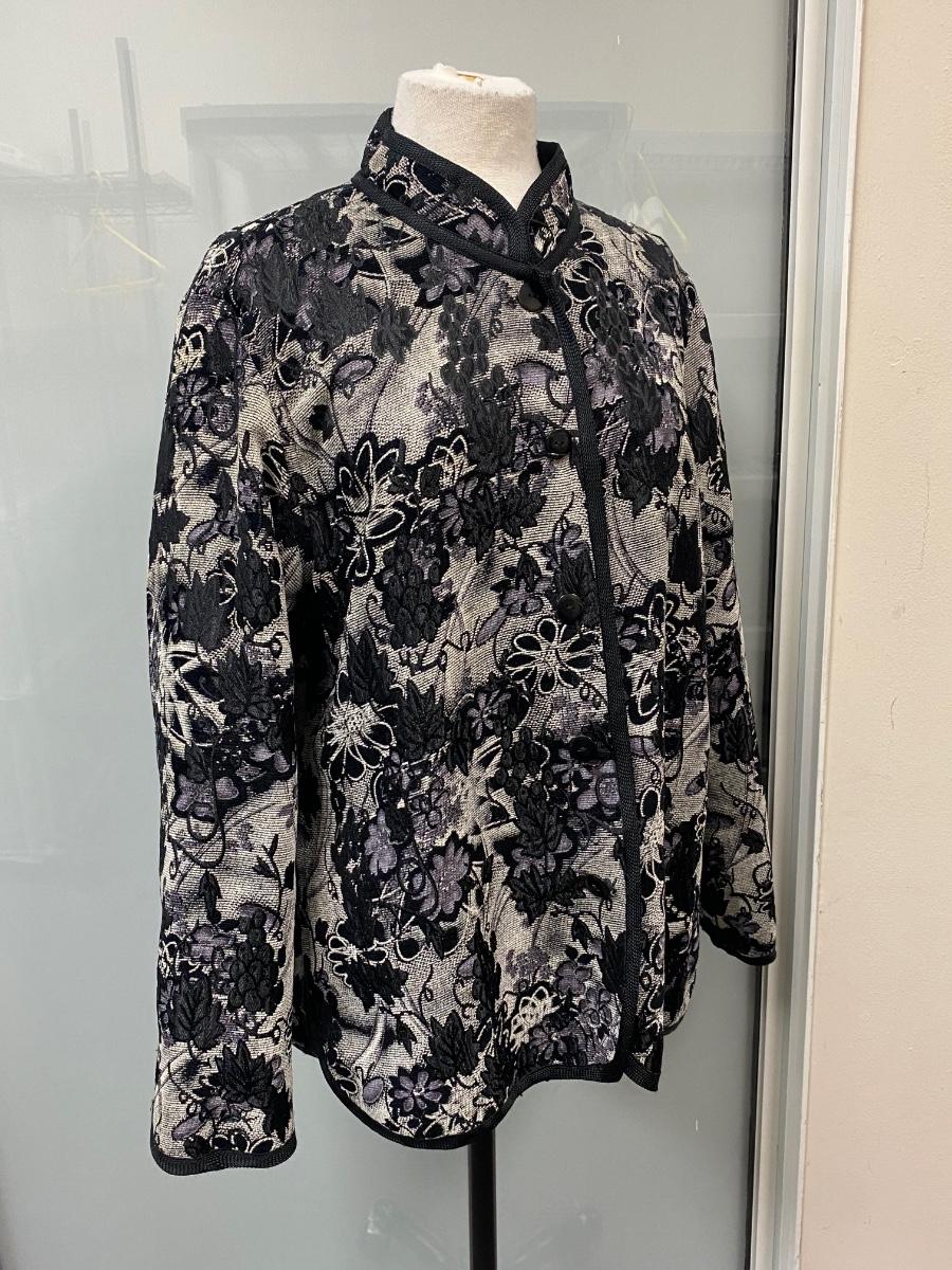 Reversible Black on Black/ Black on White Floral Dinner Formal Button Front Blouse Jacket. In good condition except on button has broken and needs to be replaced. No tags. About size medium.