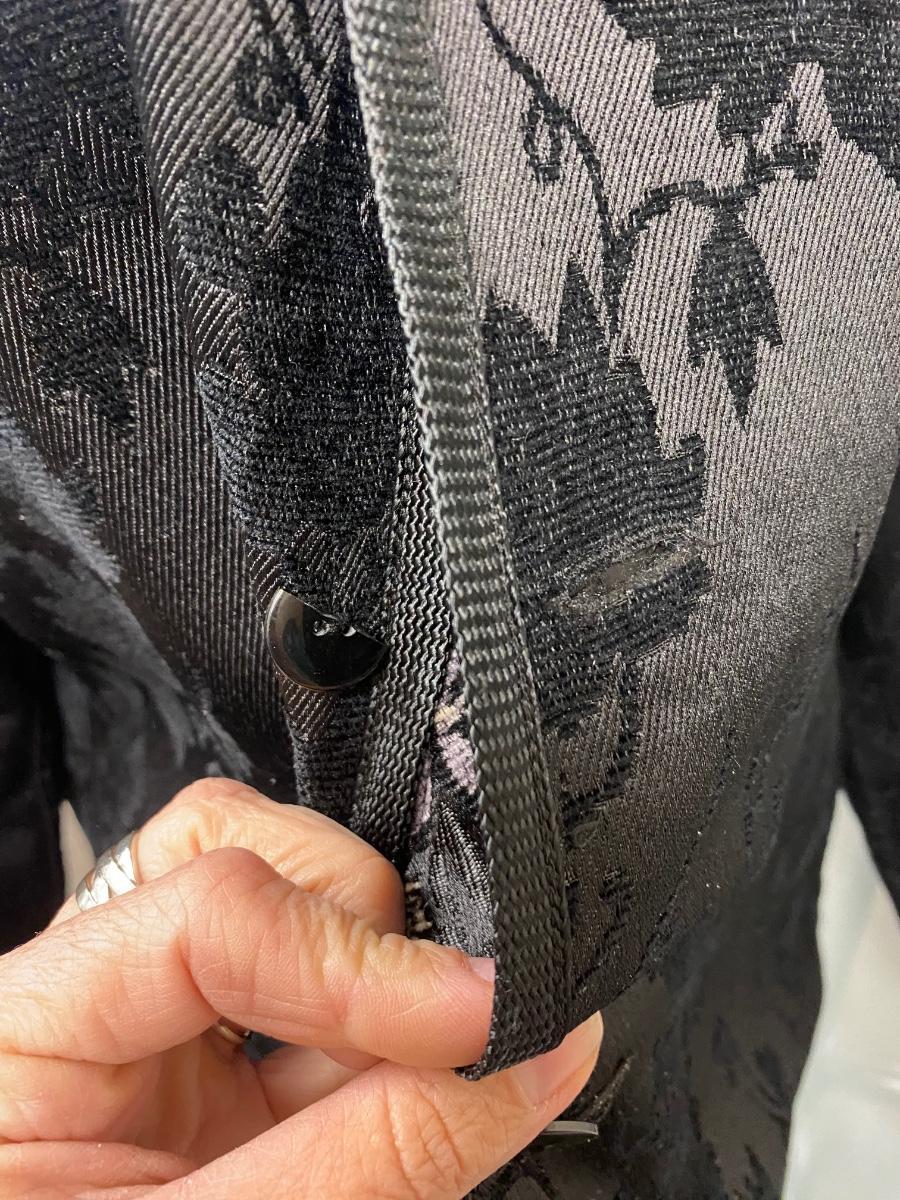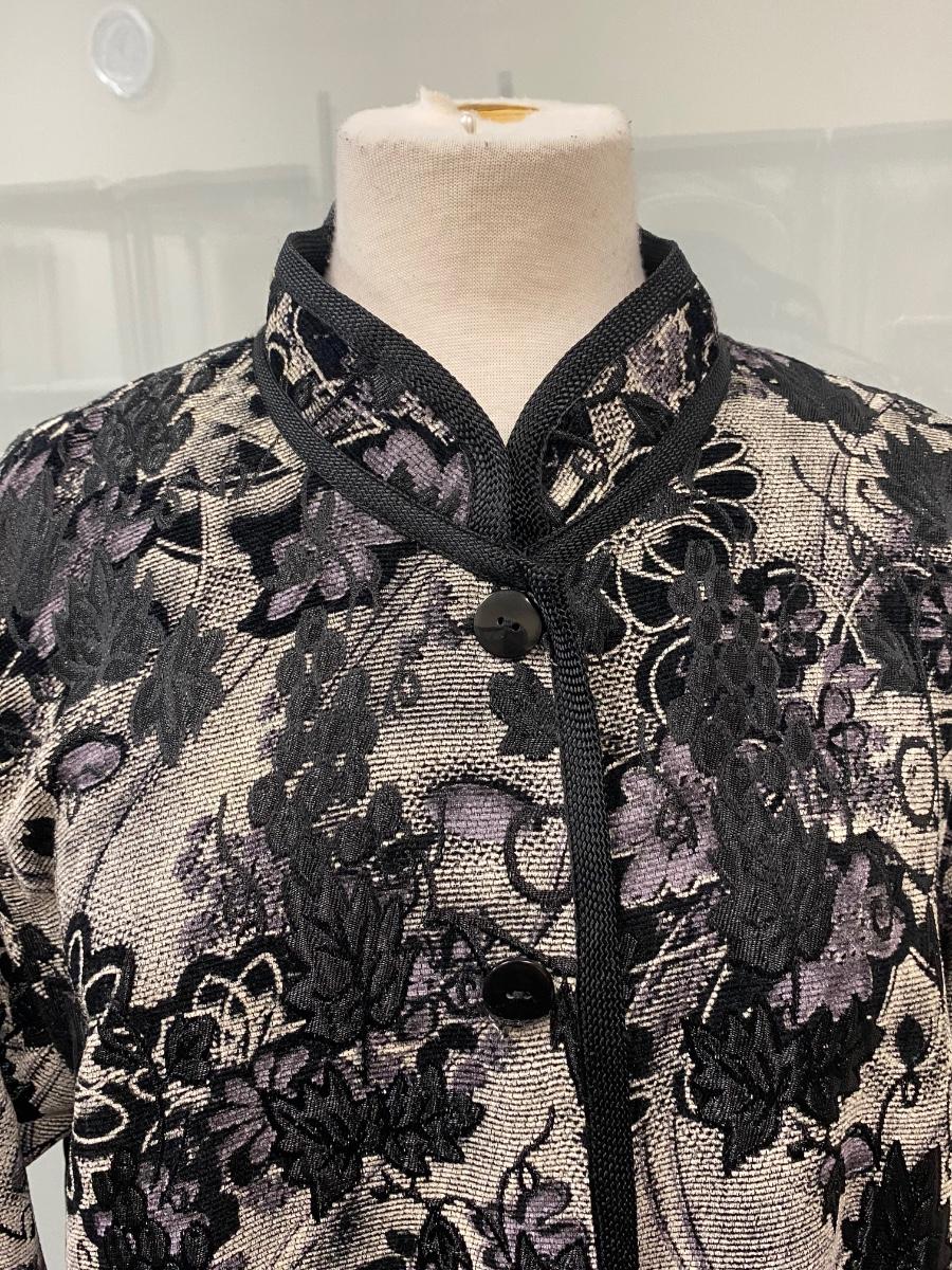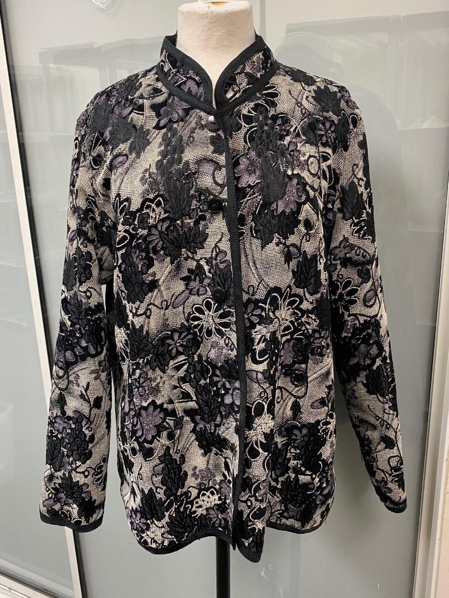 Reversible Black on Black/ Black on White Floral Dinner Formal Button Front Blouse Jacket. In good condition except on button has broken and needs to be replaced. No tags. About size medium.