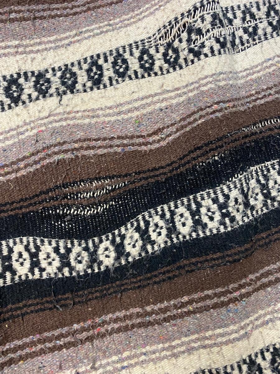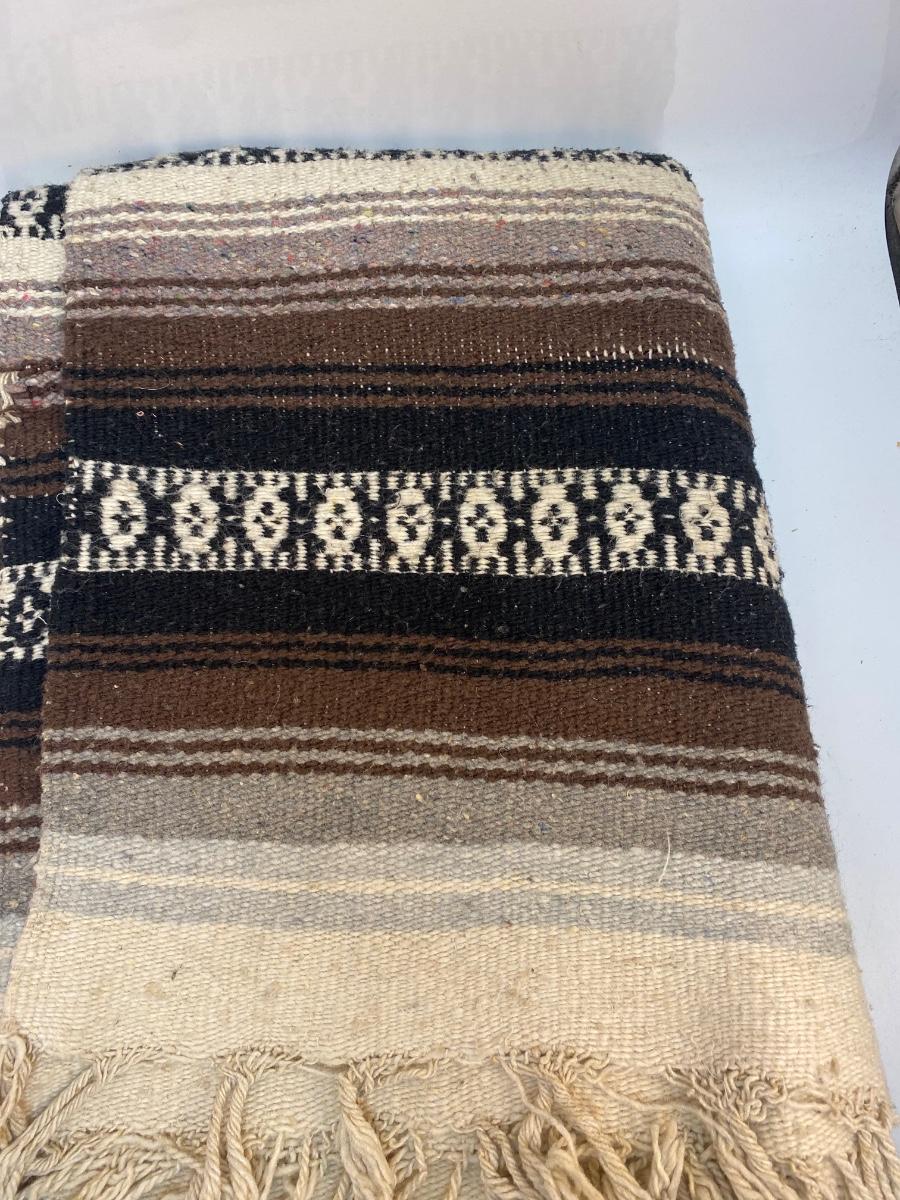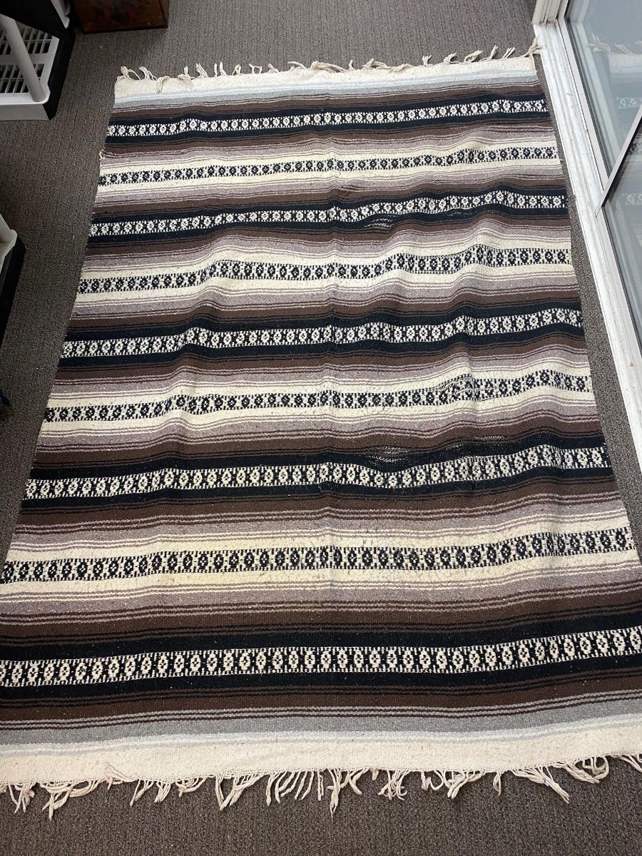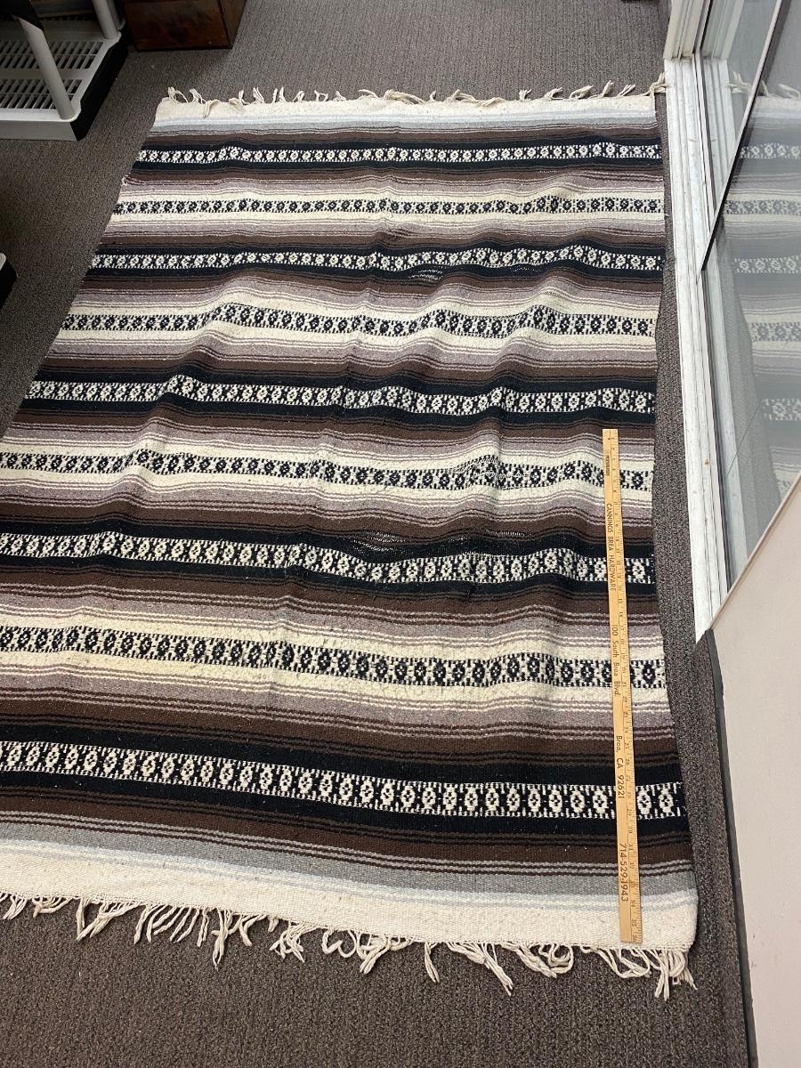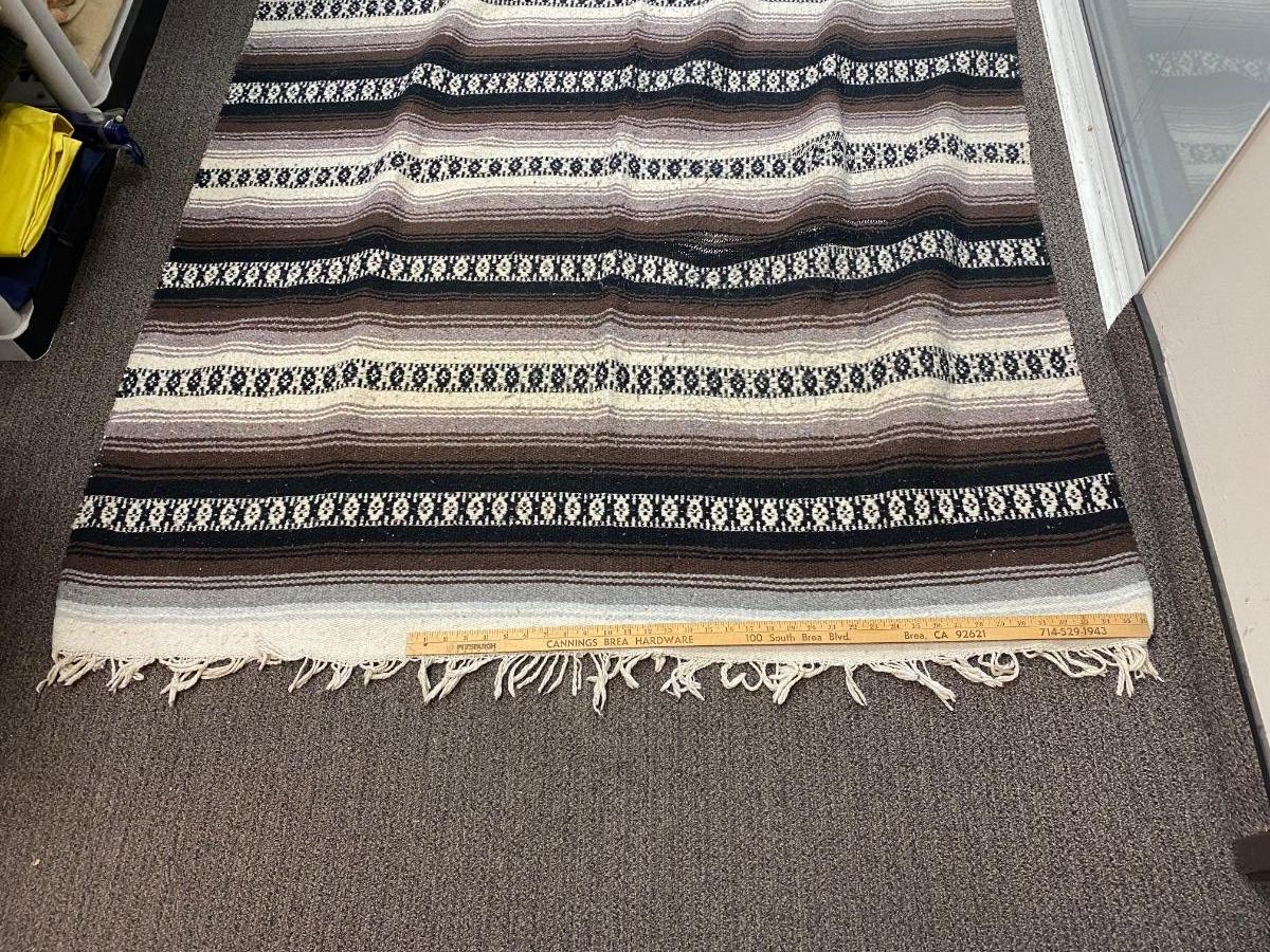 Vintage Brown & Black Striped Mexican Southwestern Wool Fringed Edge Blanket. Large. In good vintage condition. Soft wool, not stiff. About 6'x4'