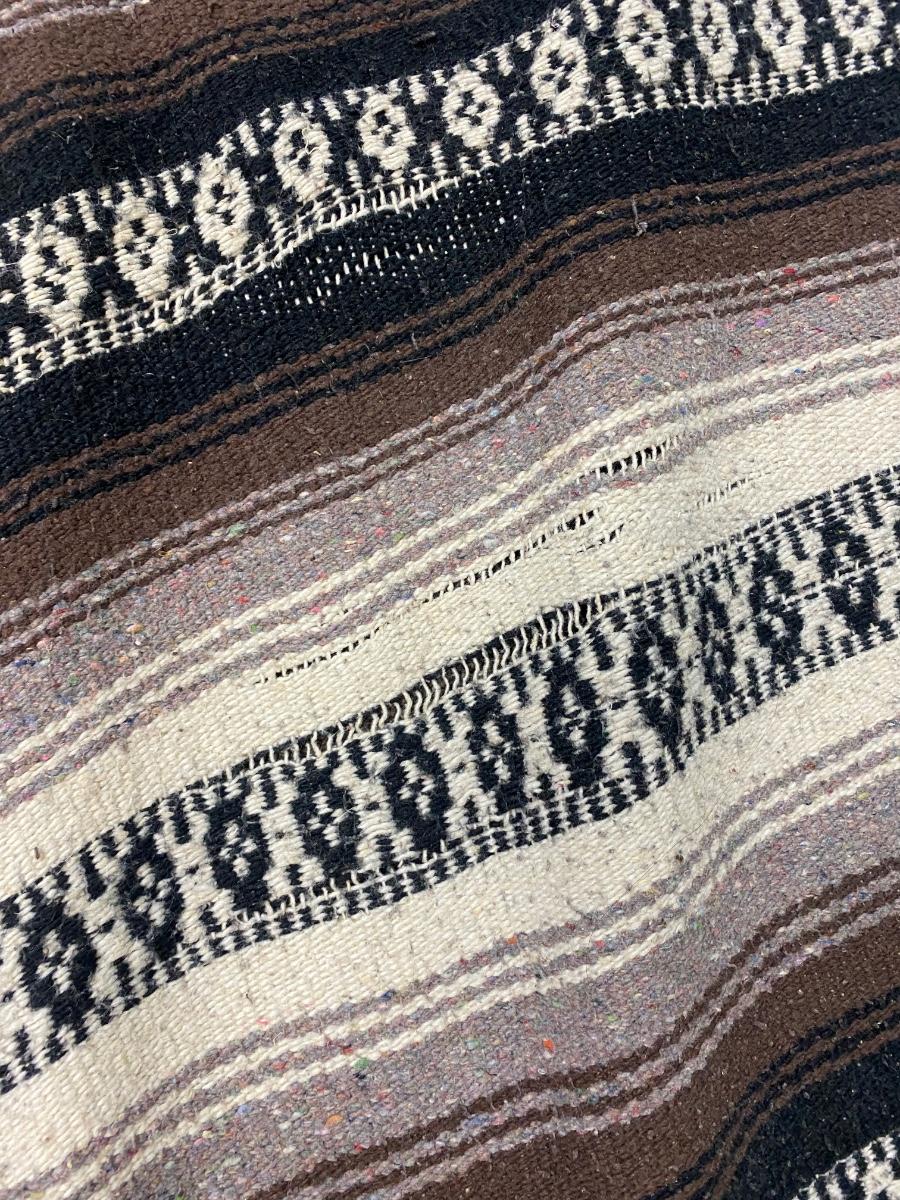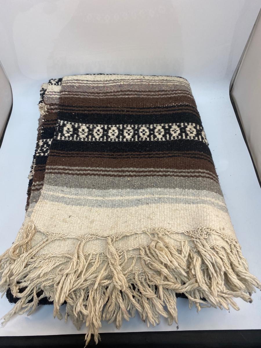 Vintage Brown & Black Striped Mexican Southwestern Wool Fringed Edge Blanket