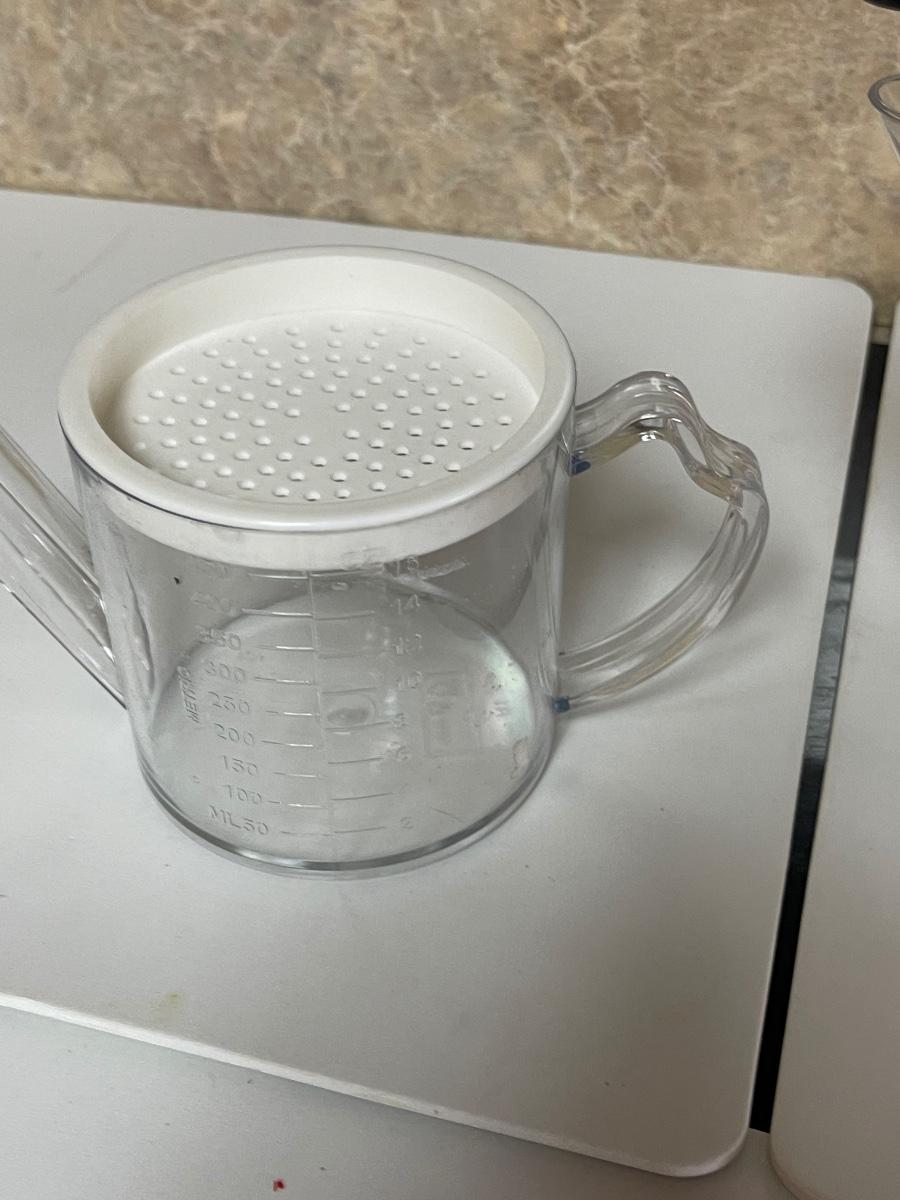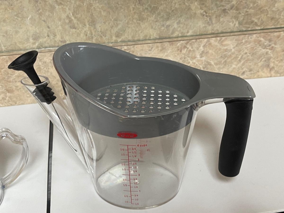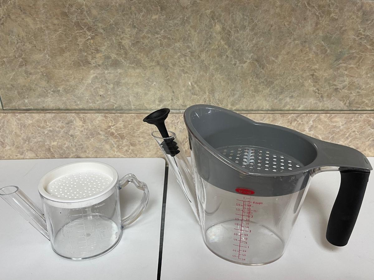 One fat separating strainer and one plastic gravy measuring cup.