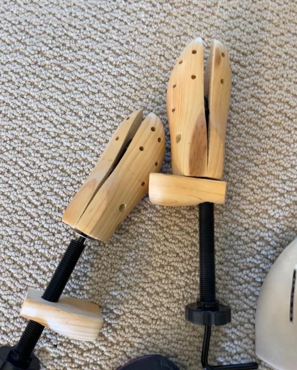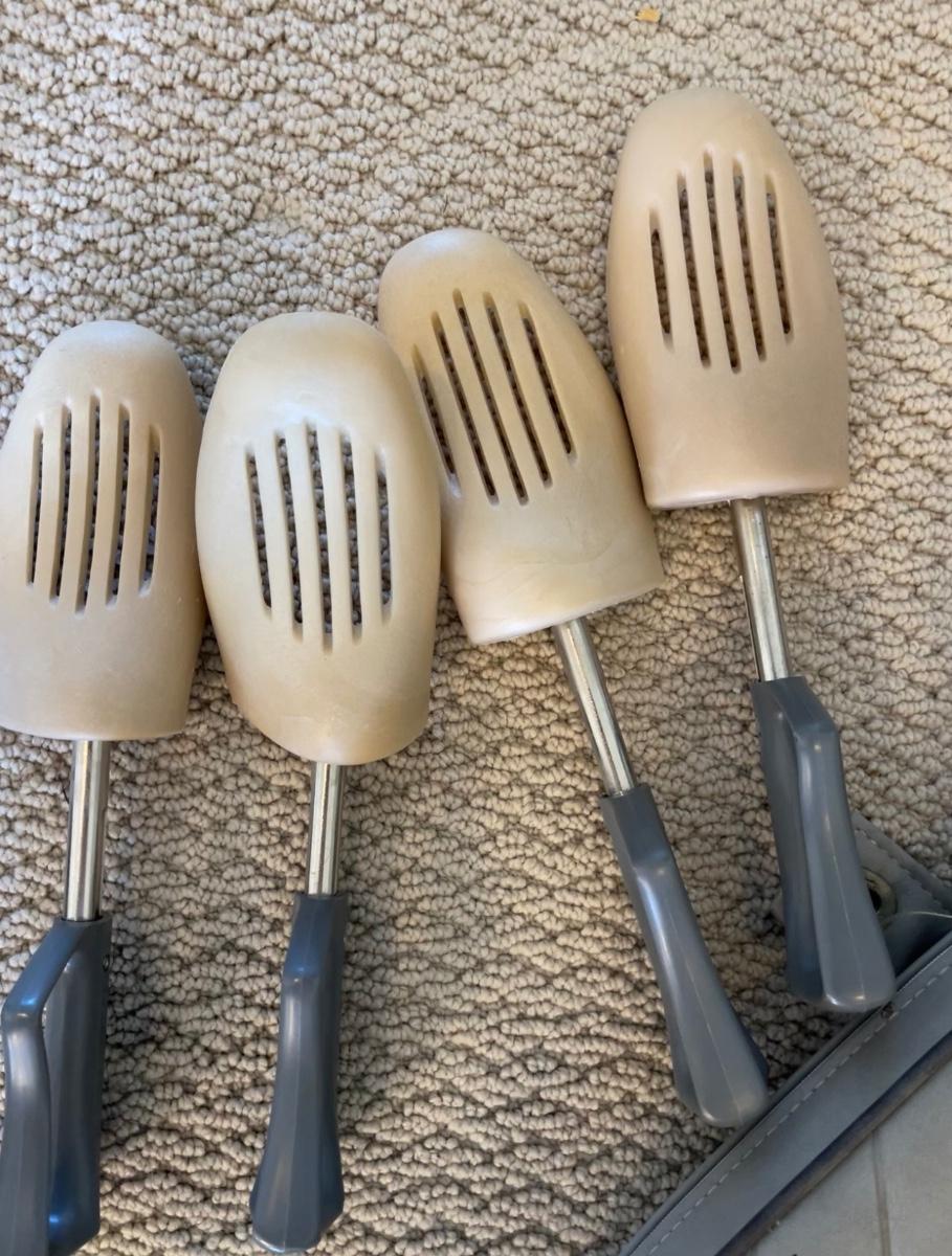 This lot includes four plastic shoe stretchers and two wood stretchers