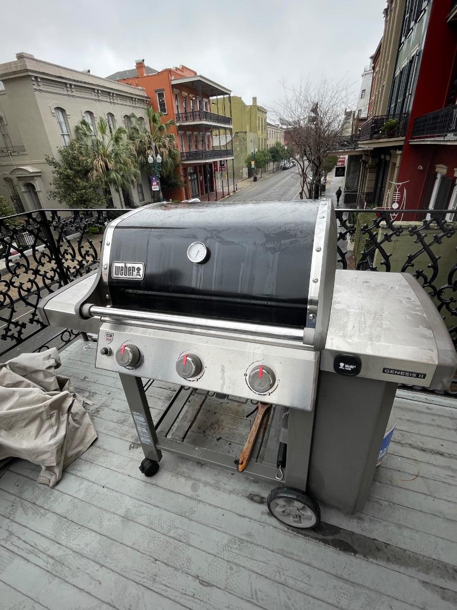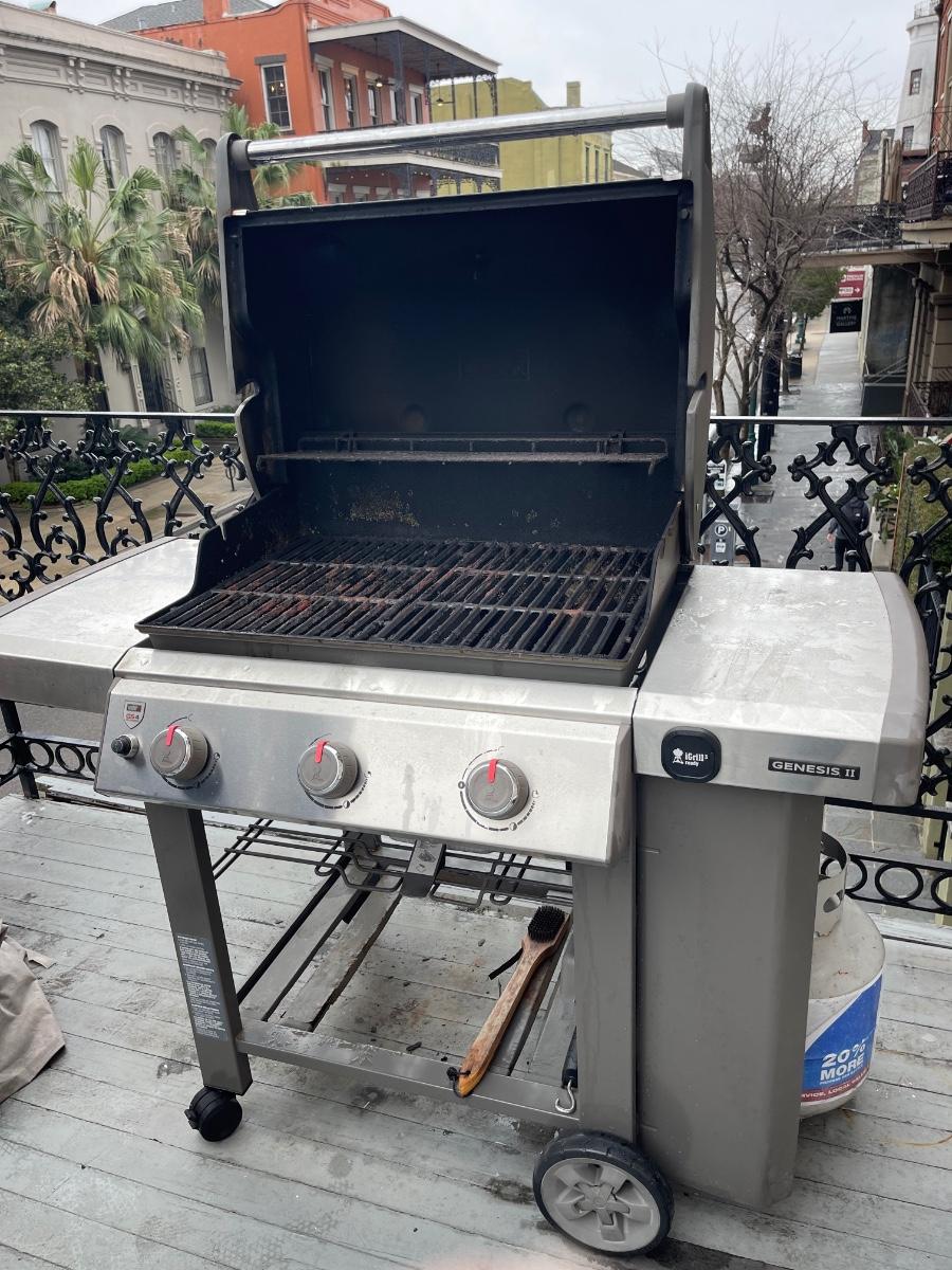 This pit is in good condition. One of the ignition covers may need to be replaced. It is located on a balcony and would need to be partially taken apart to get downstairs.