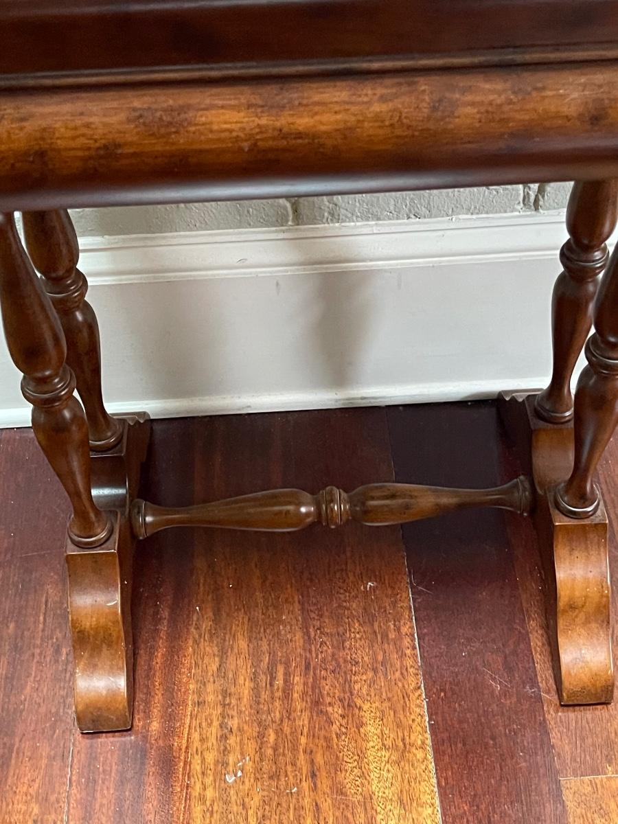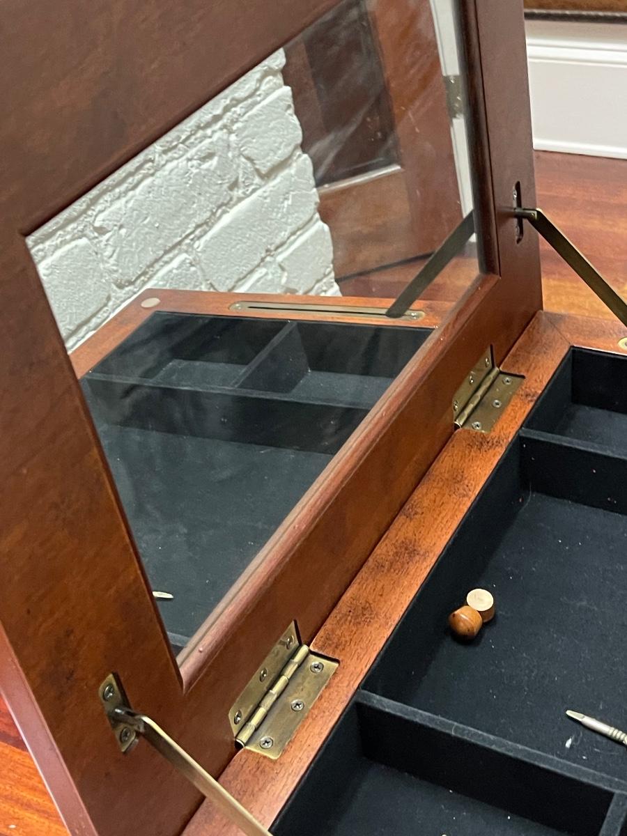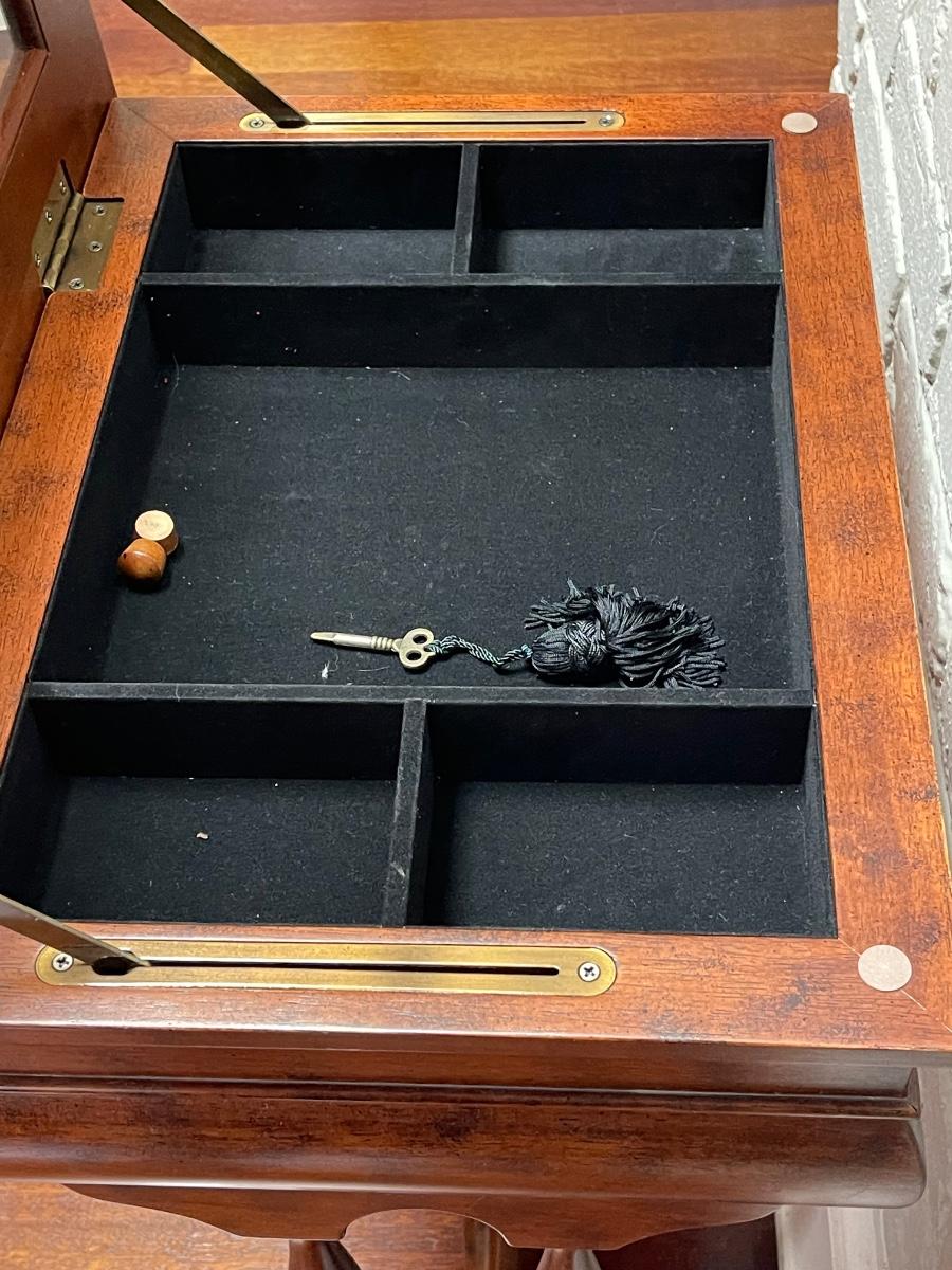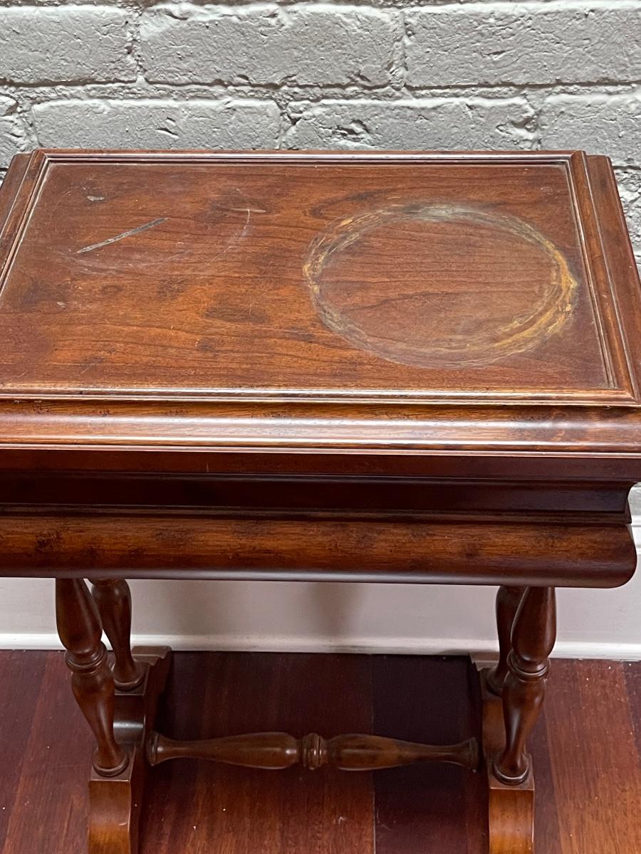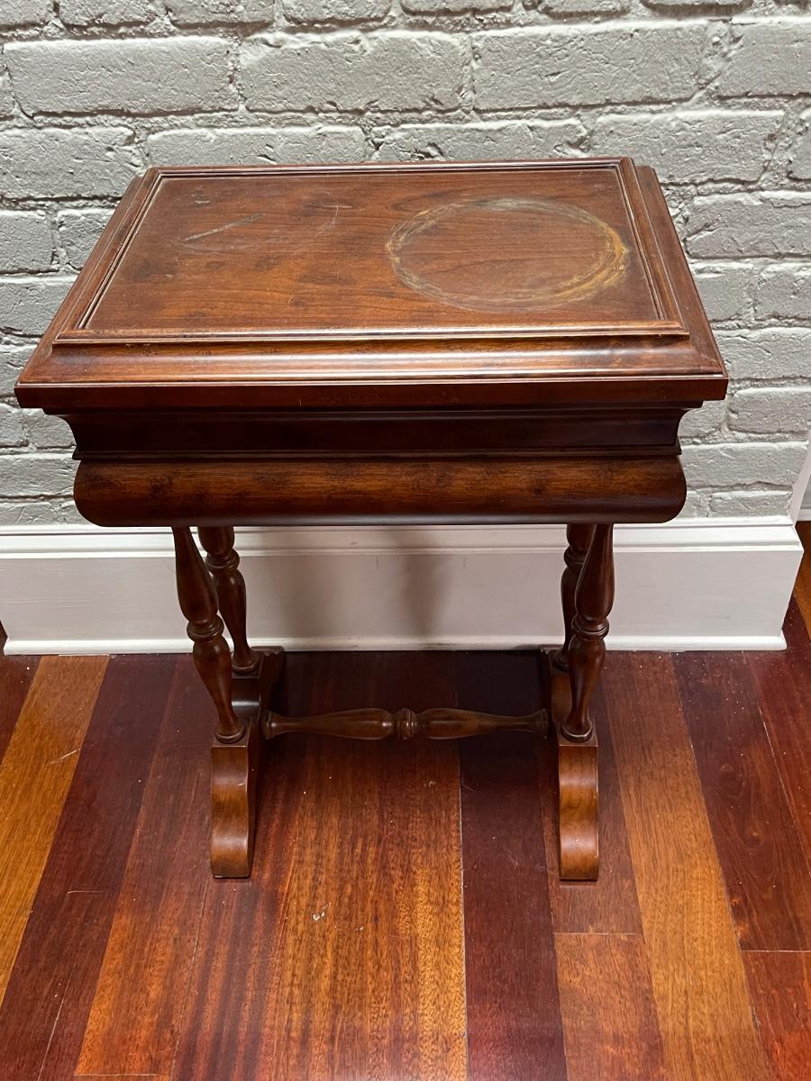 This is an awesome piece. It has some stain spots on top but pretty much excellent everywhere else. It measures 28 x 20 x 15
