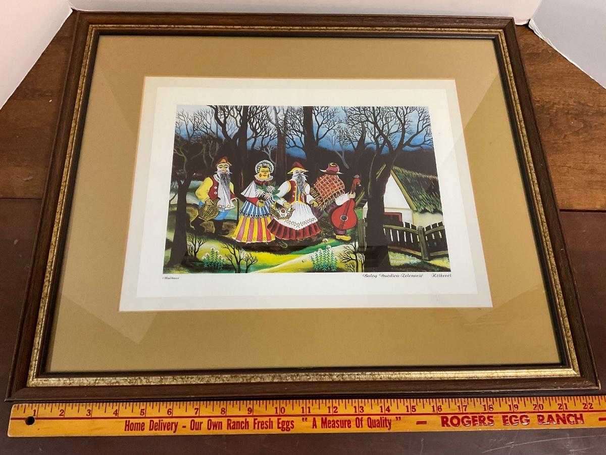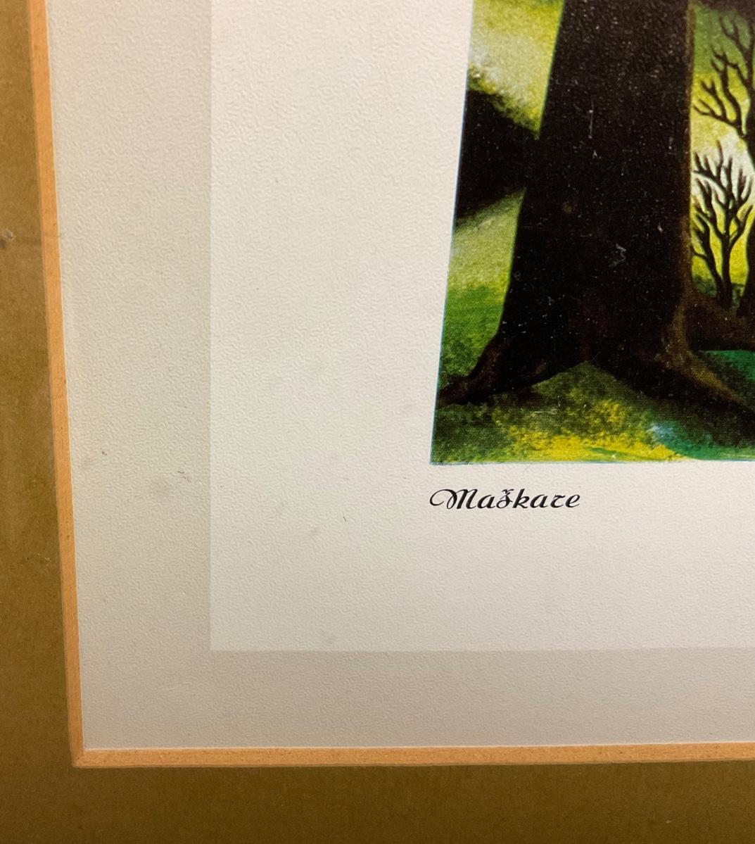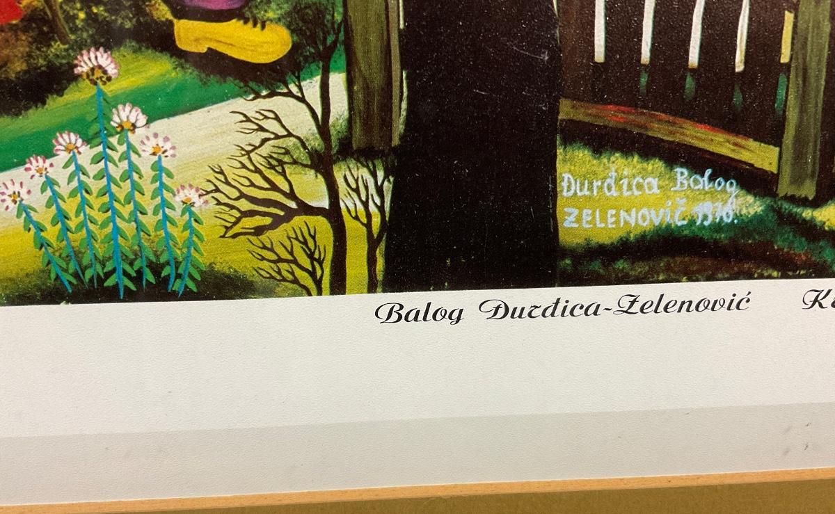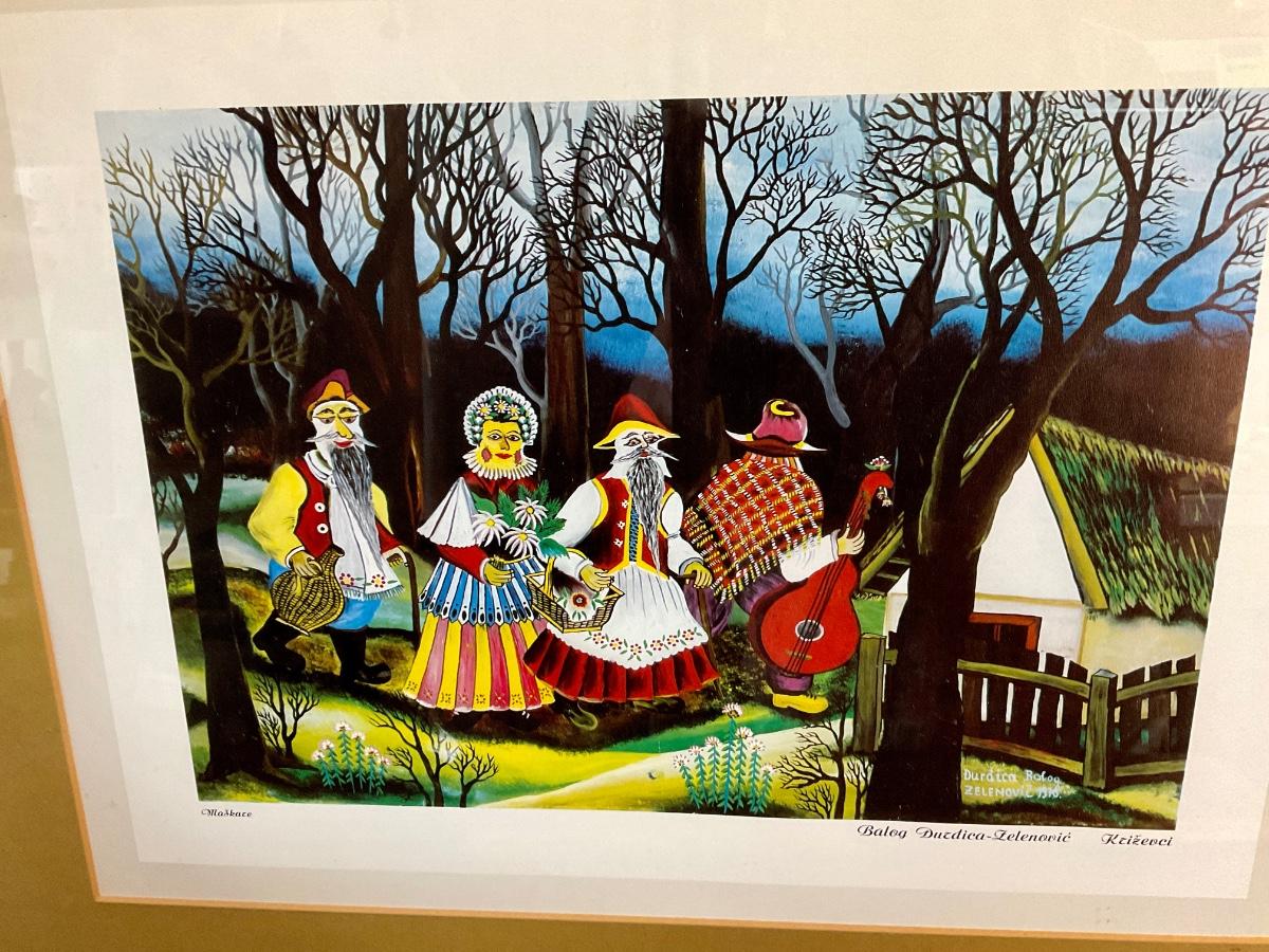 Vintage Russian Eastern European Folk Naive Art Print Maskare Balog Durdica Zelenovic. Colorful eastern European folk-art print. In good condition.