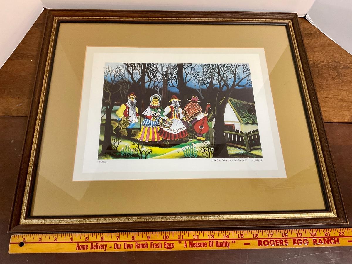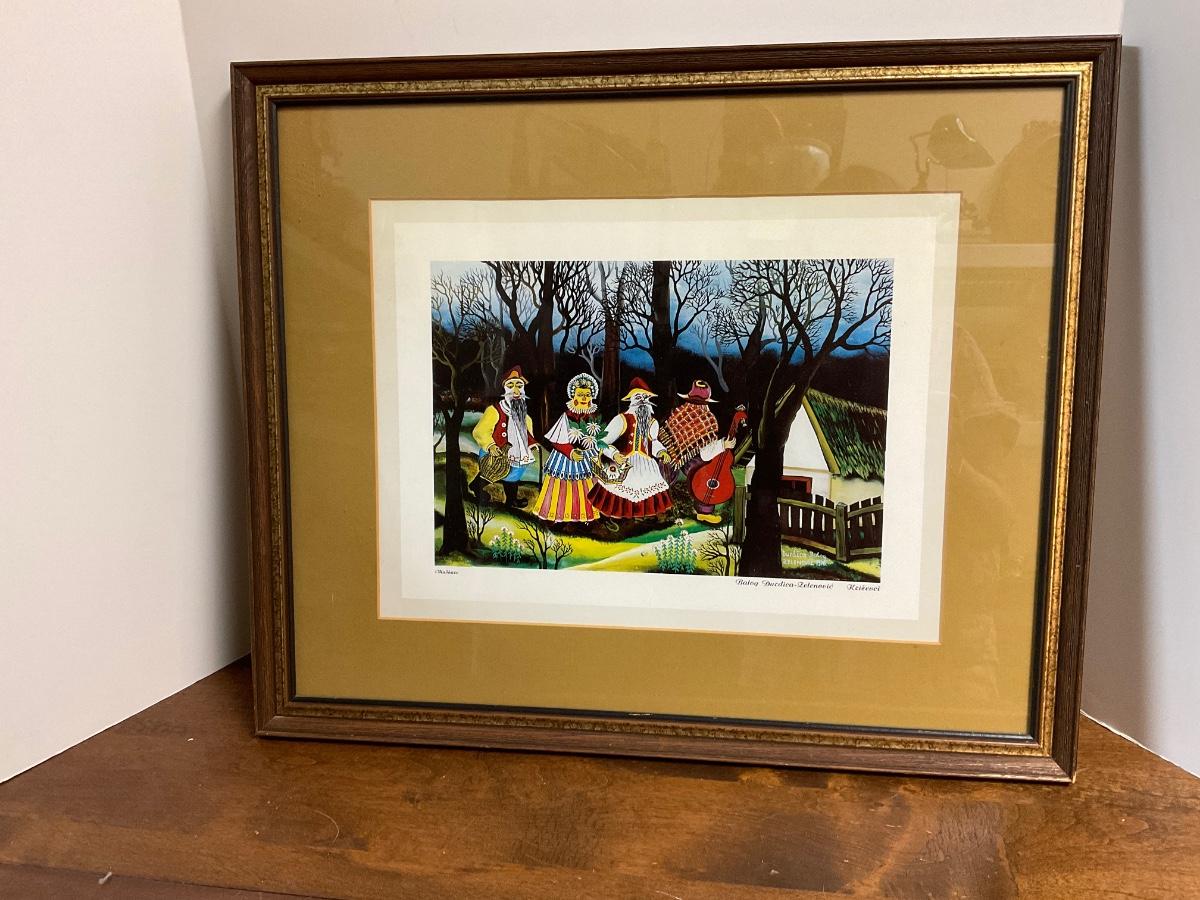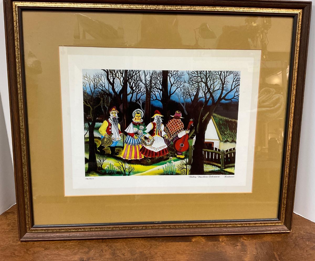 Vintage Russian Eastern European Folk Naive Art Print Maskare Balog Durdica Zelenovic. Colorful eastern European folk-art print. In good condition.