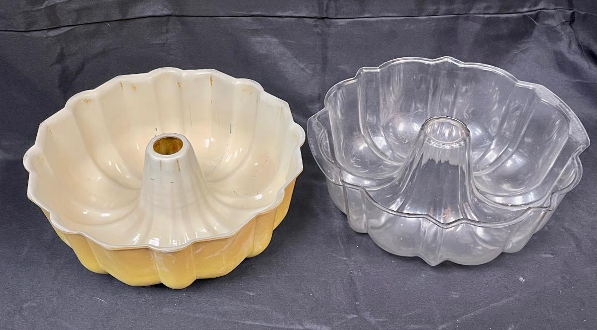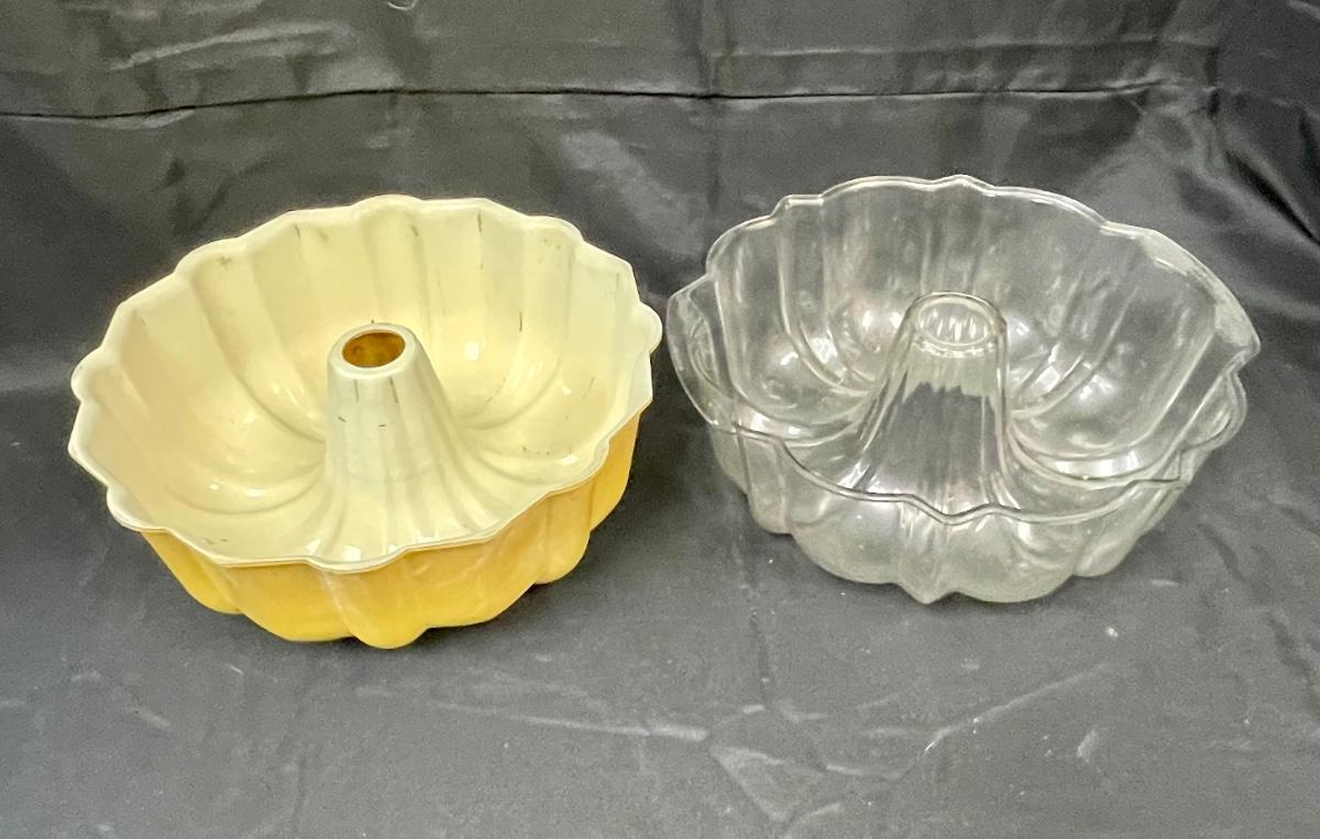 Vintage Enameled Metal and Glass Bundt Cake Jello Gelatin Mold. Both are in good vintage condition.