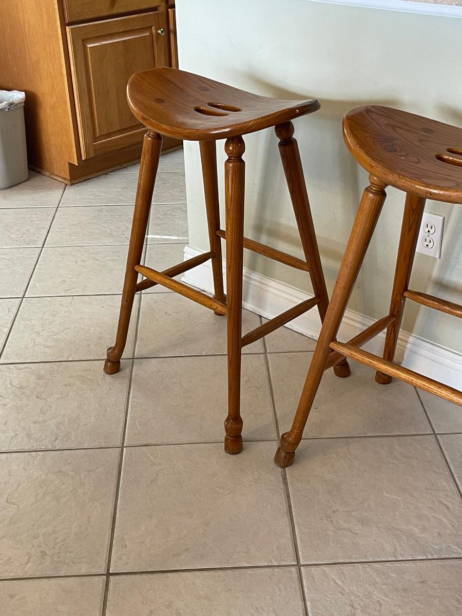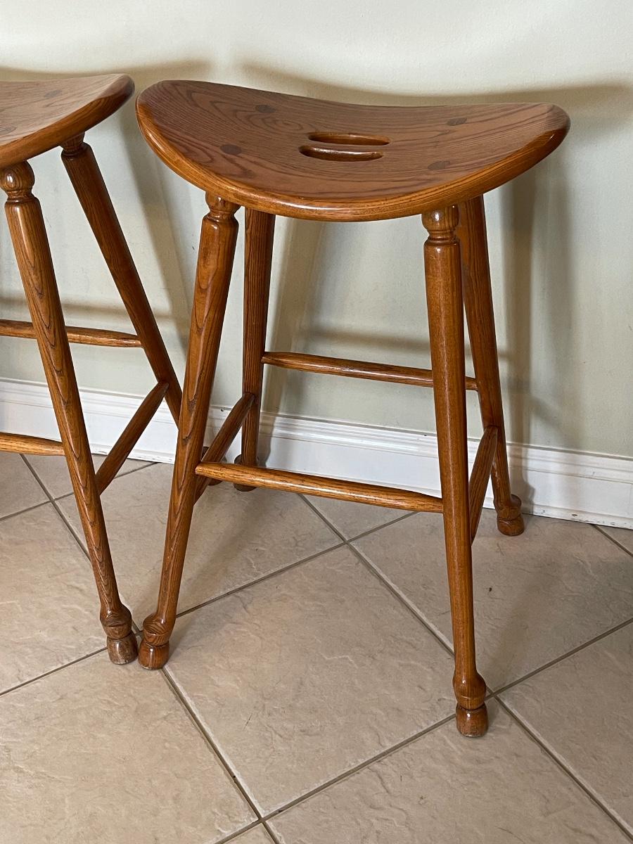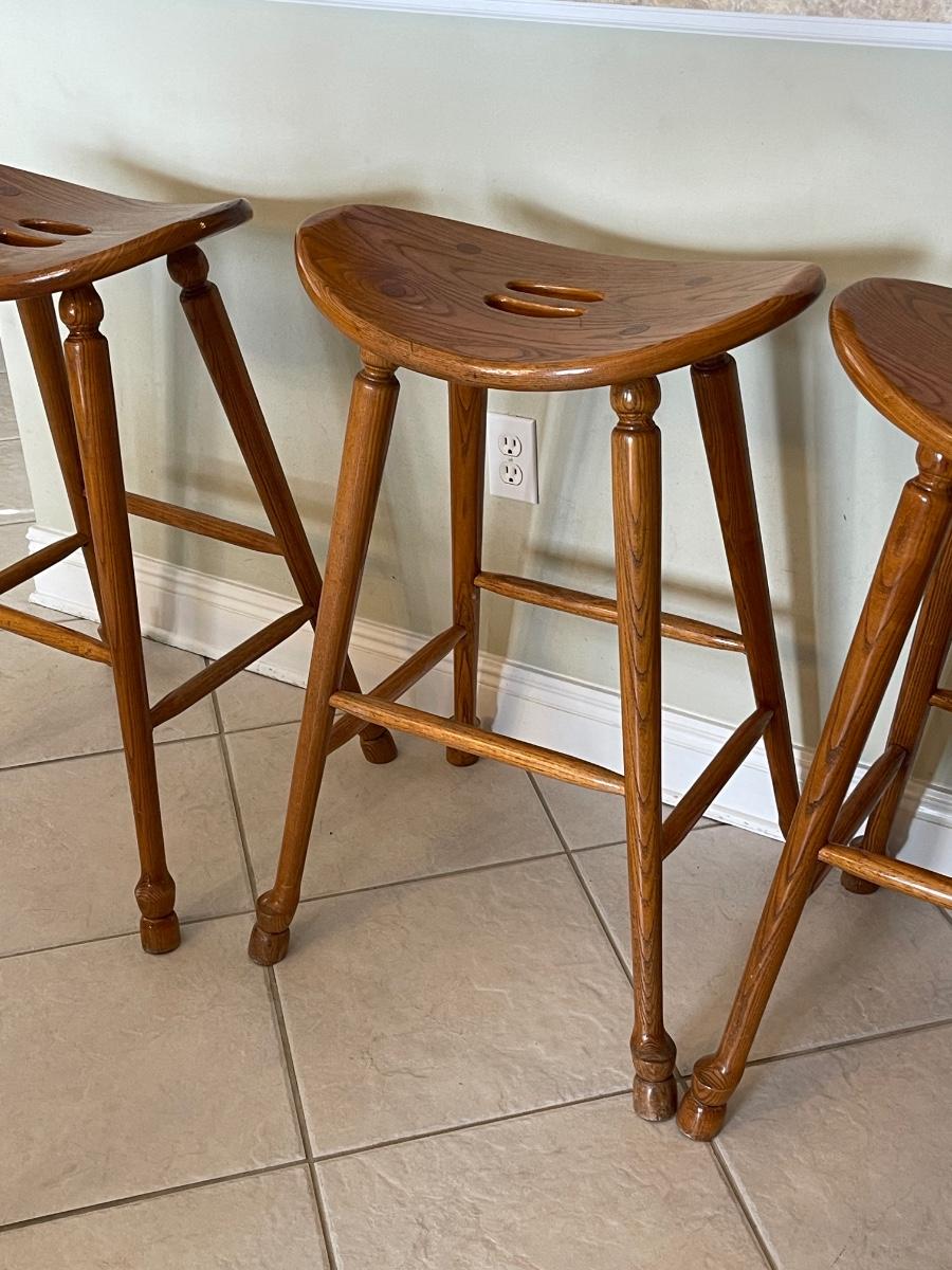 Three Wilkerson Oak Solid Wood Saddle Seat Bar/Counter Stools