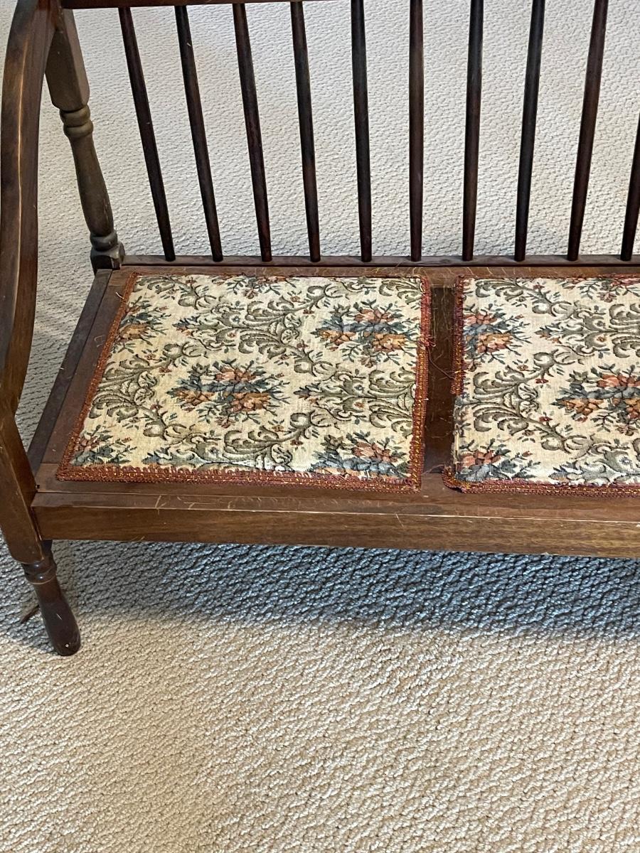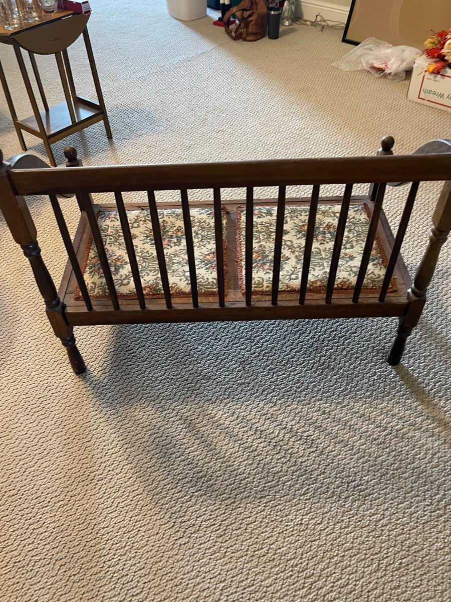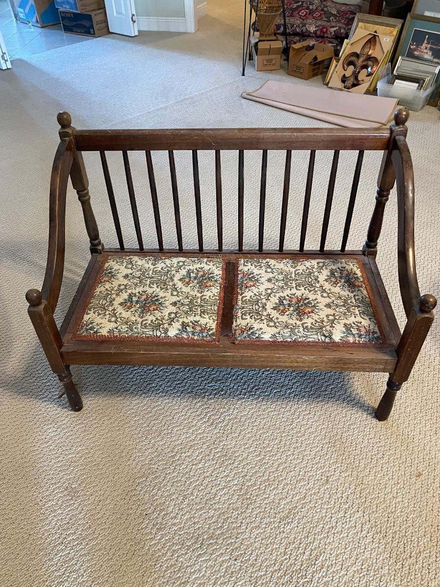 This bench is very old and has some wear. It is lightweight and needs some screws tightening. It is adorable and perfect for home decor or to be used as a child bench. It sits low to the ground.