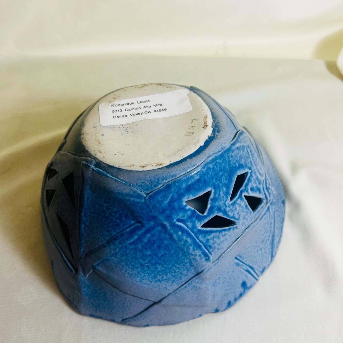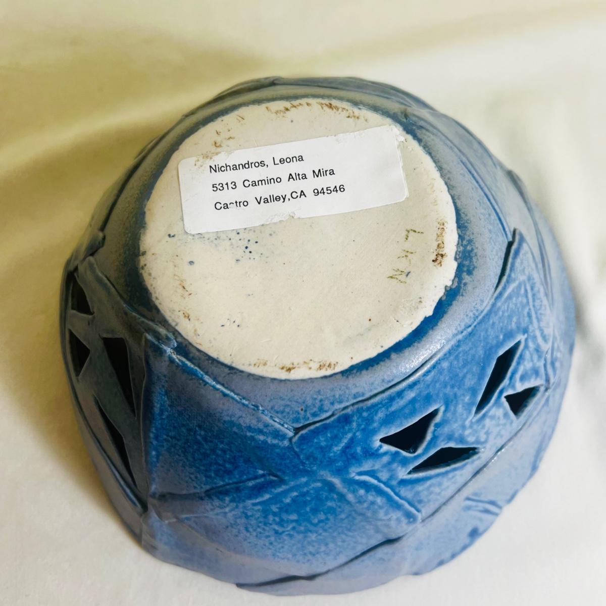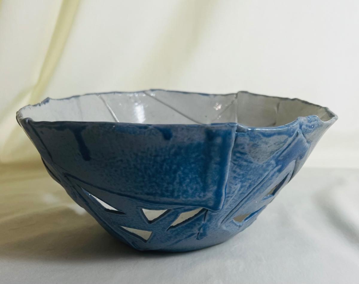 Art Deco Pottery Vase or Holder, Triangular Blue with Linear Carving, Handthrown Pottery
