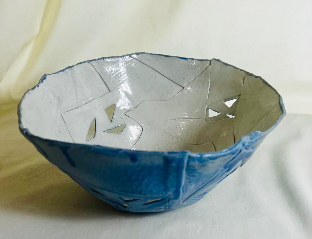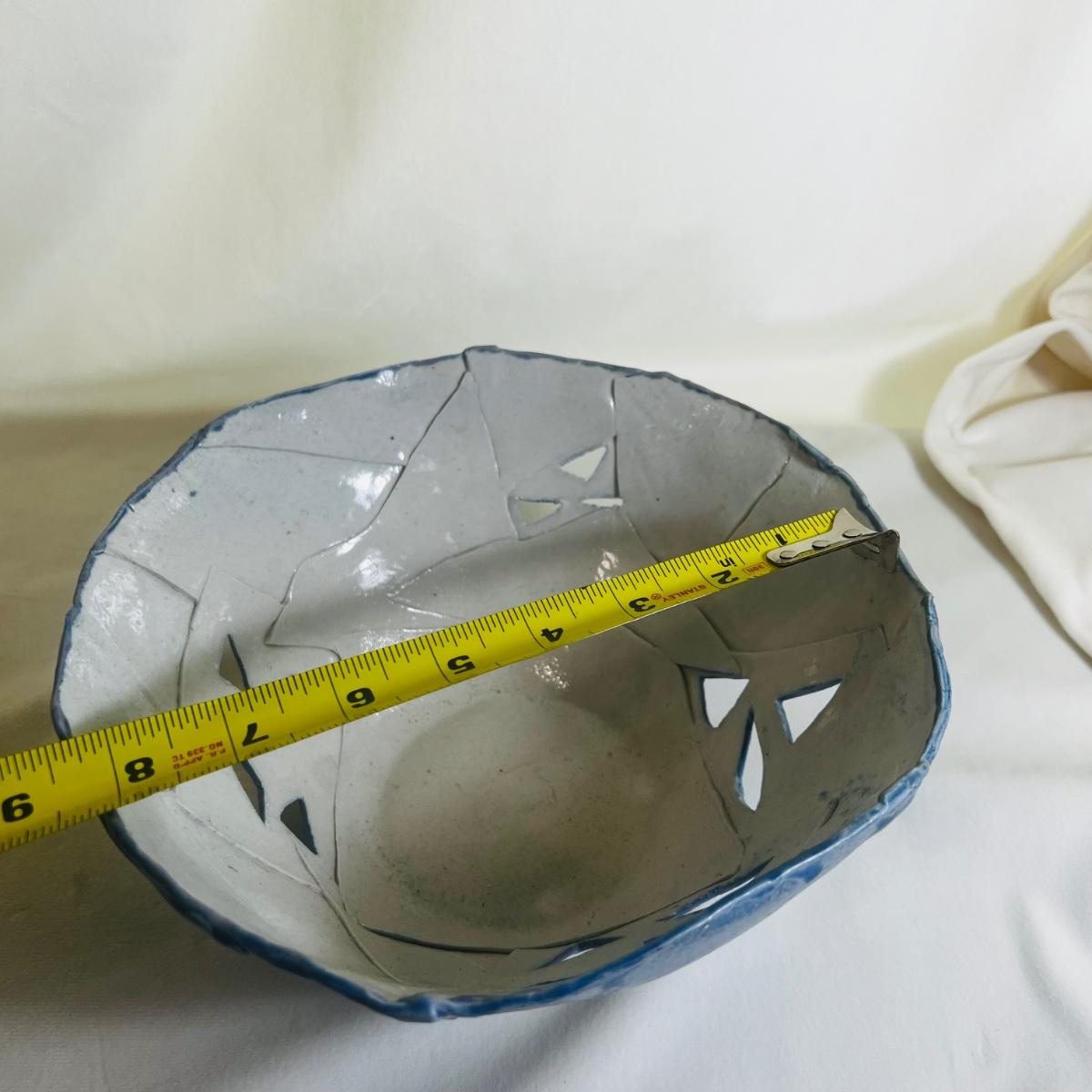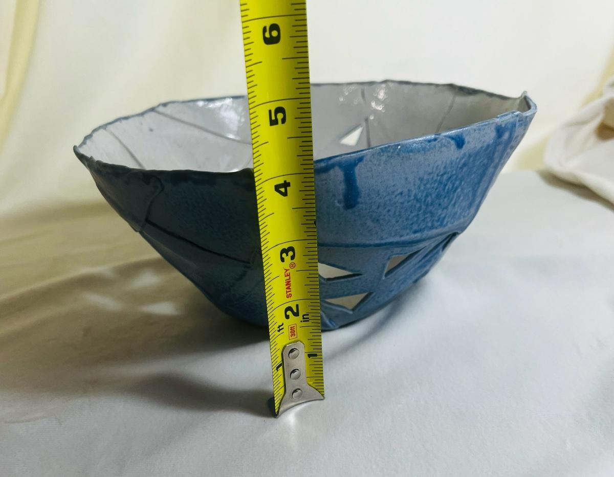 Art Deco Pottery Vase or Holder, Triangular Blue with Linear Carving, Handthrown Pottery