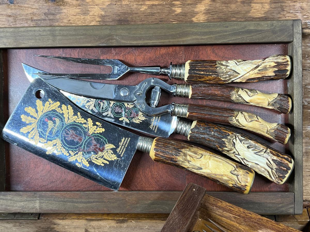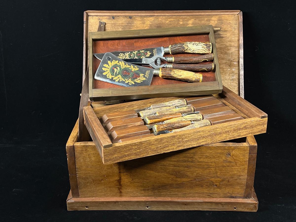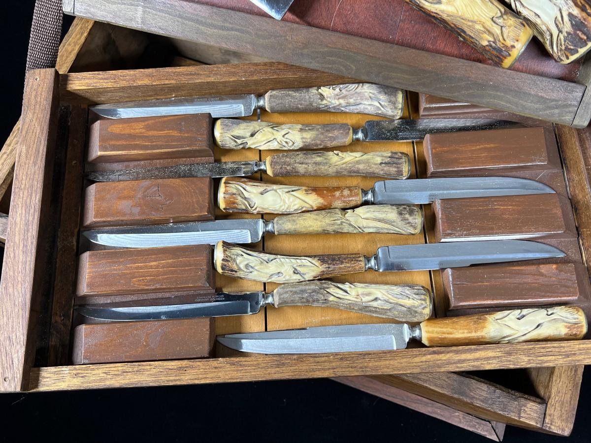 Klaus Tragbar Hand Carved Staghorn Cutlery Carving Set Heavy Wood box