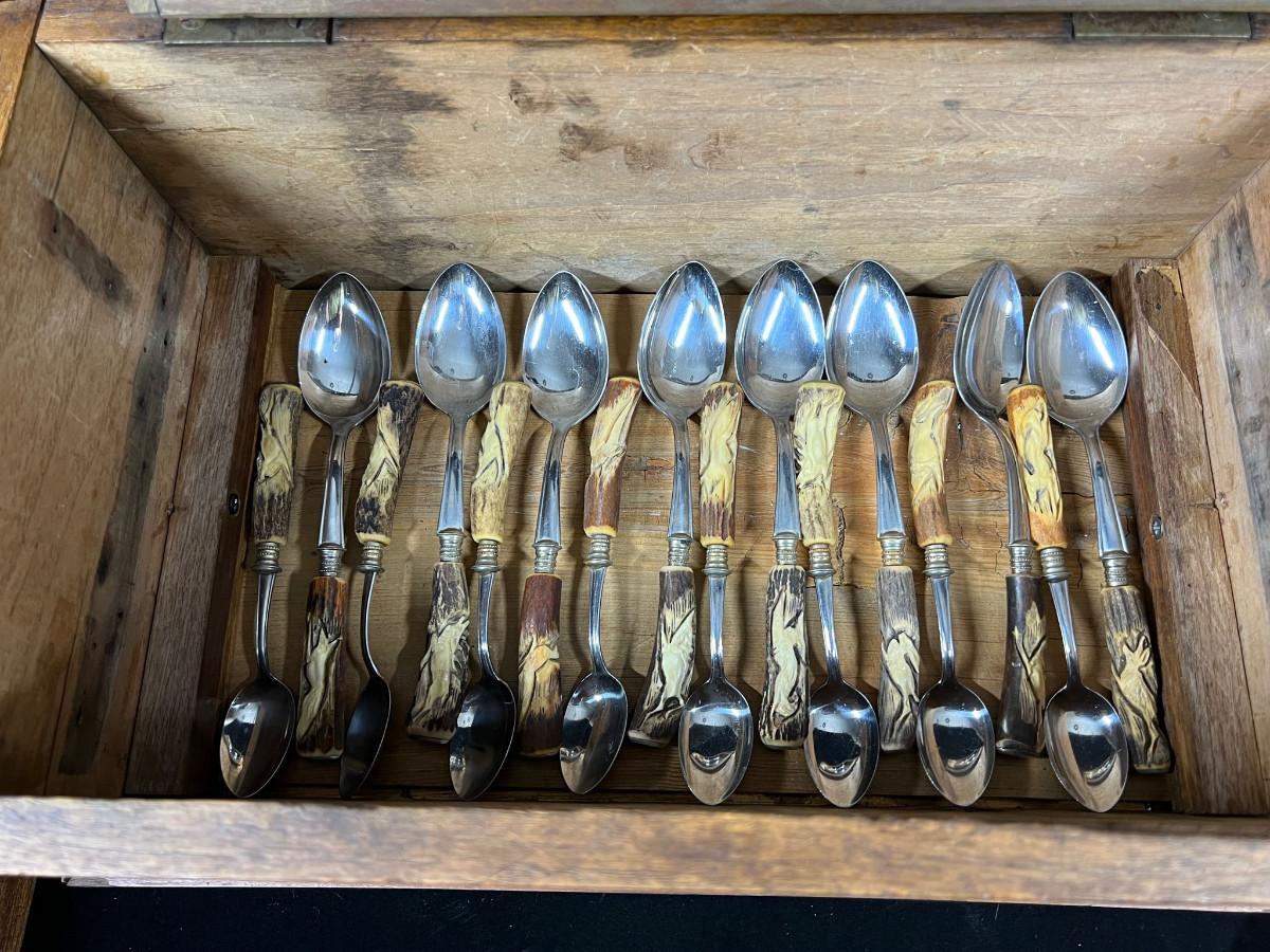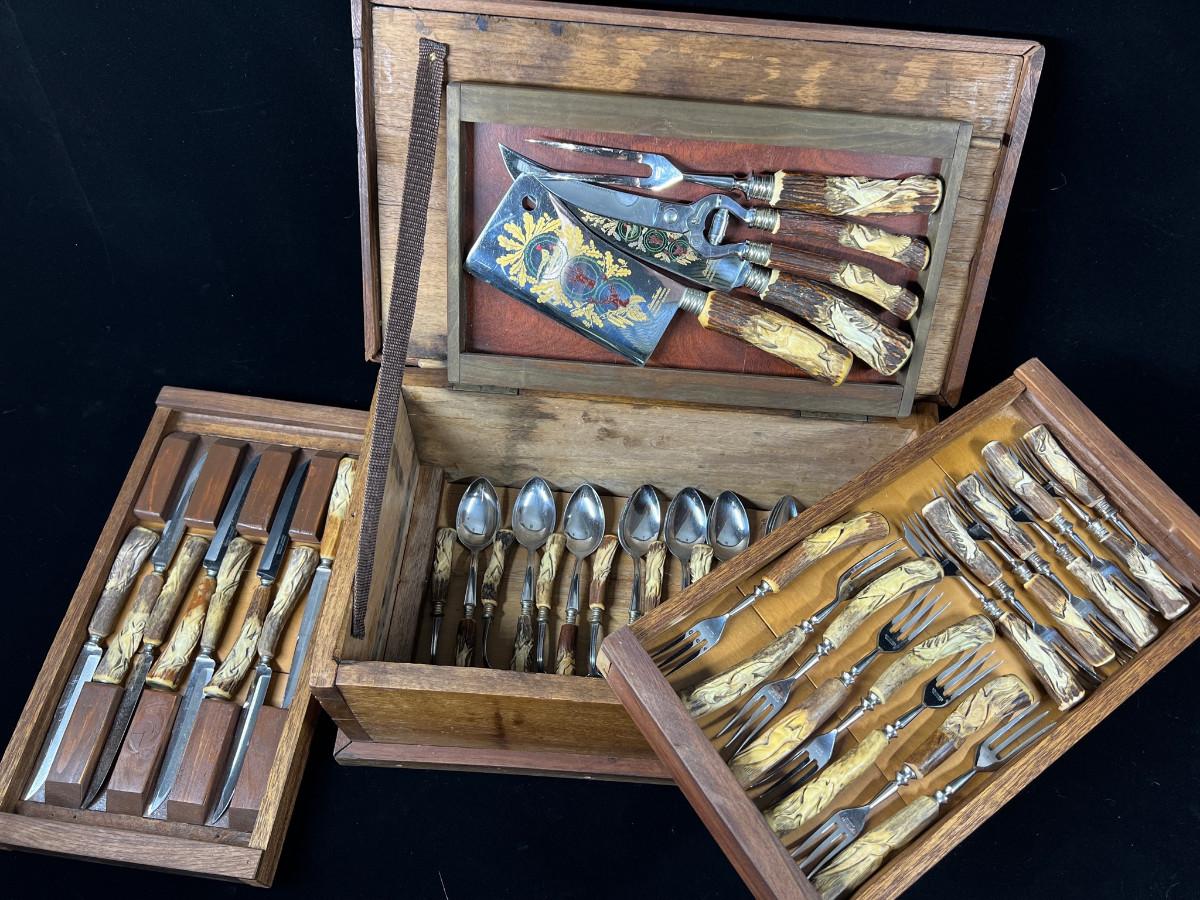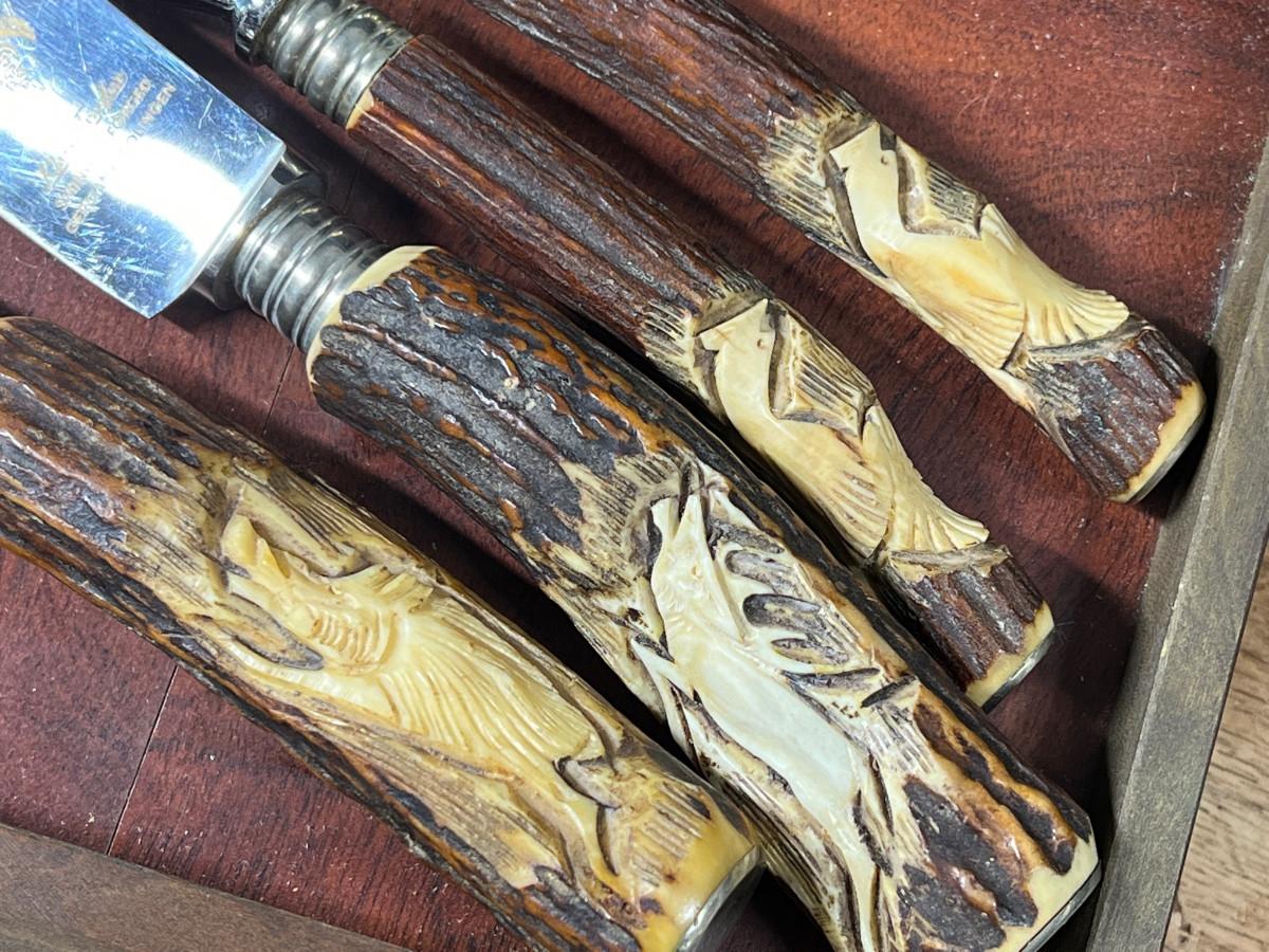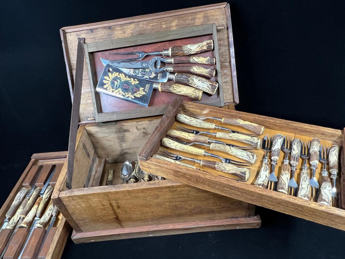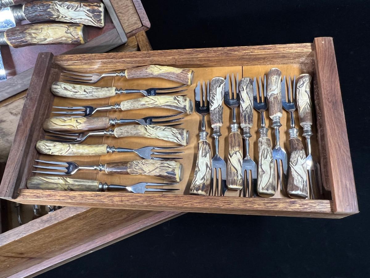 Extraordinary Klaus Tragbar German Carved Hartshorn Stag Cutlery Set in their heavy box. Each real horn handle is hand carved featuring various forest dwelling animals - wolves, boar, deer, pheasant, rabbit and more.