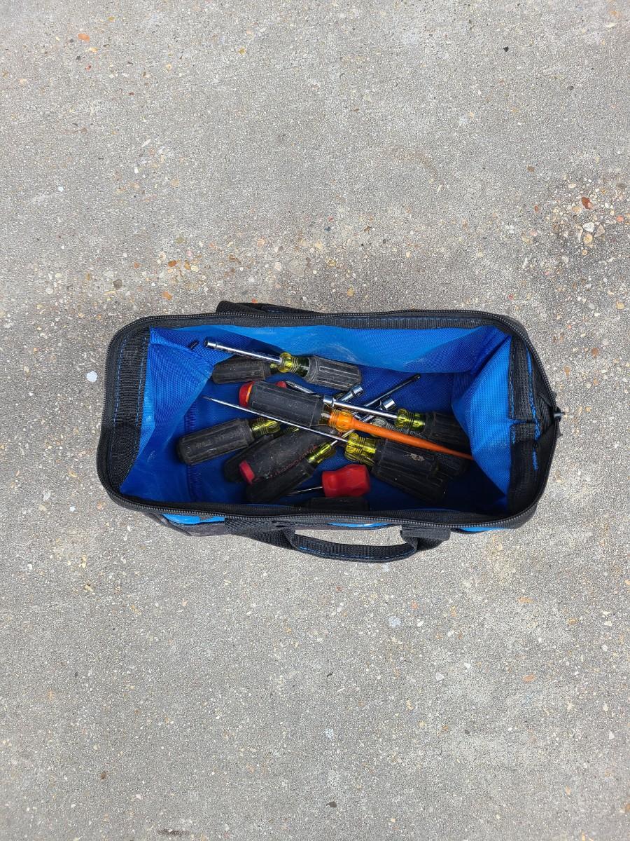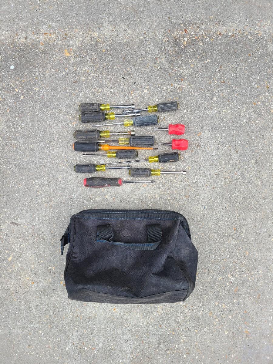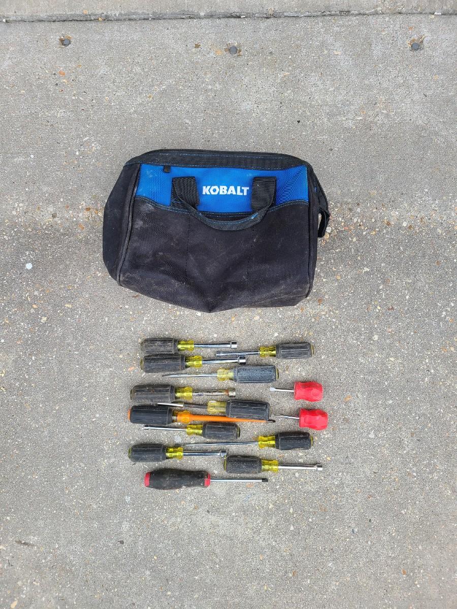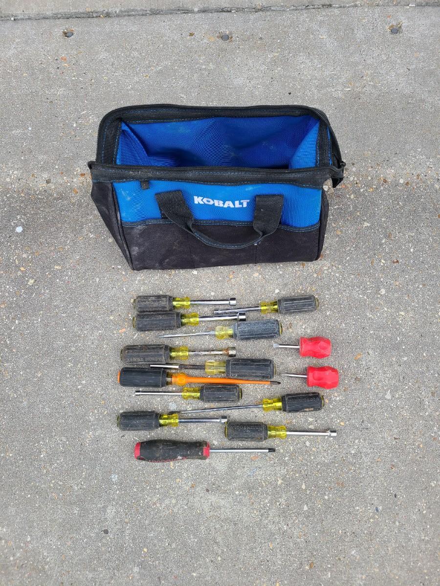 Nut drivers and Screw Driver lot. Mainly Klein Tools. In a Kobalt carry bag.