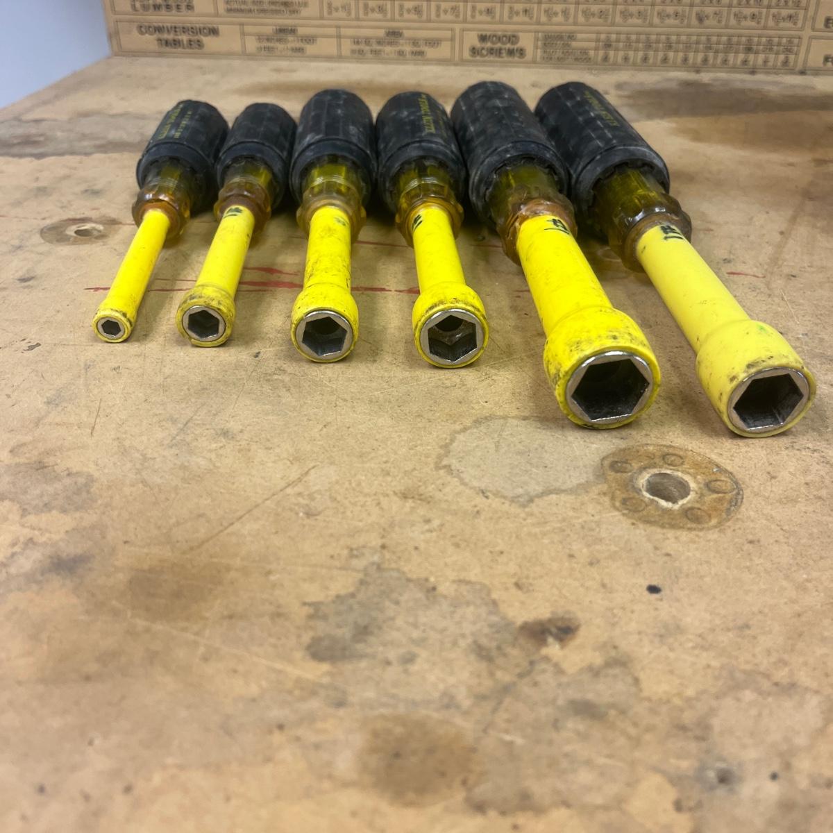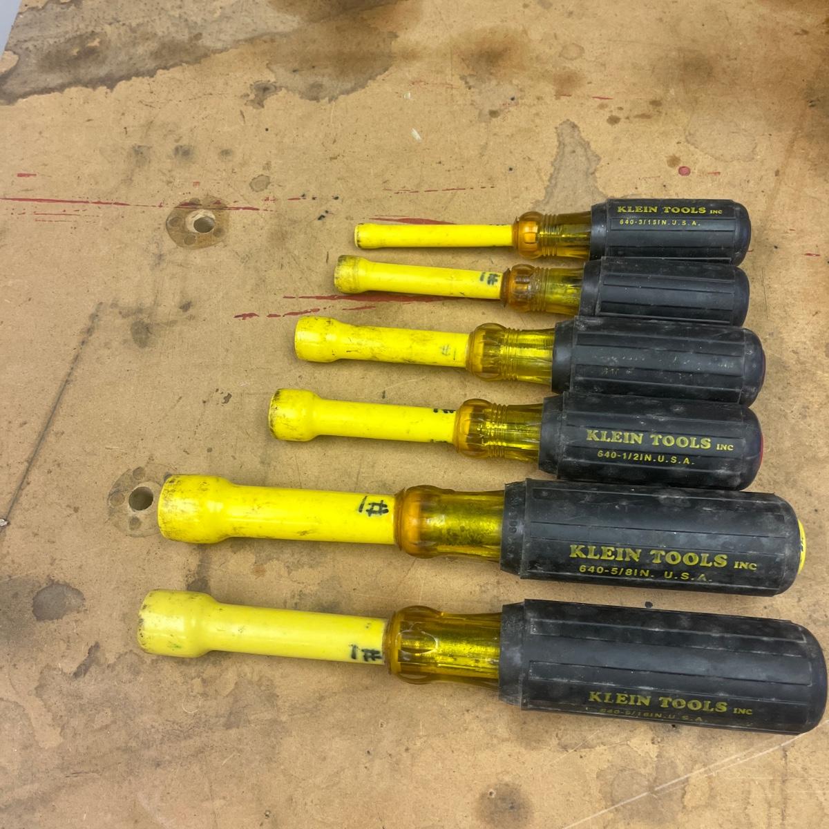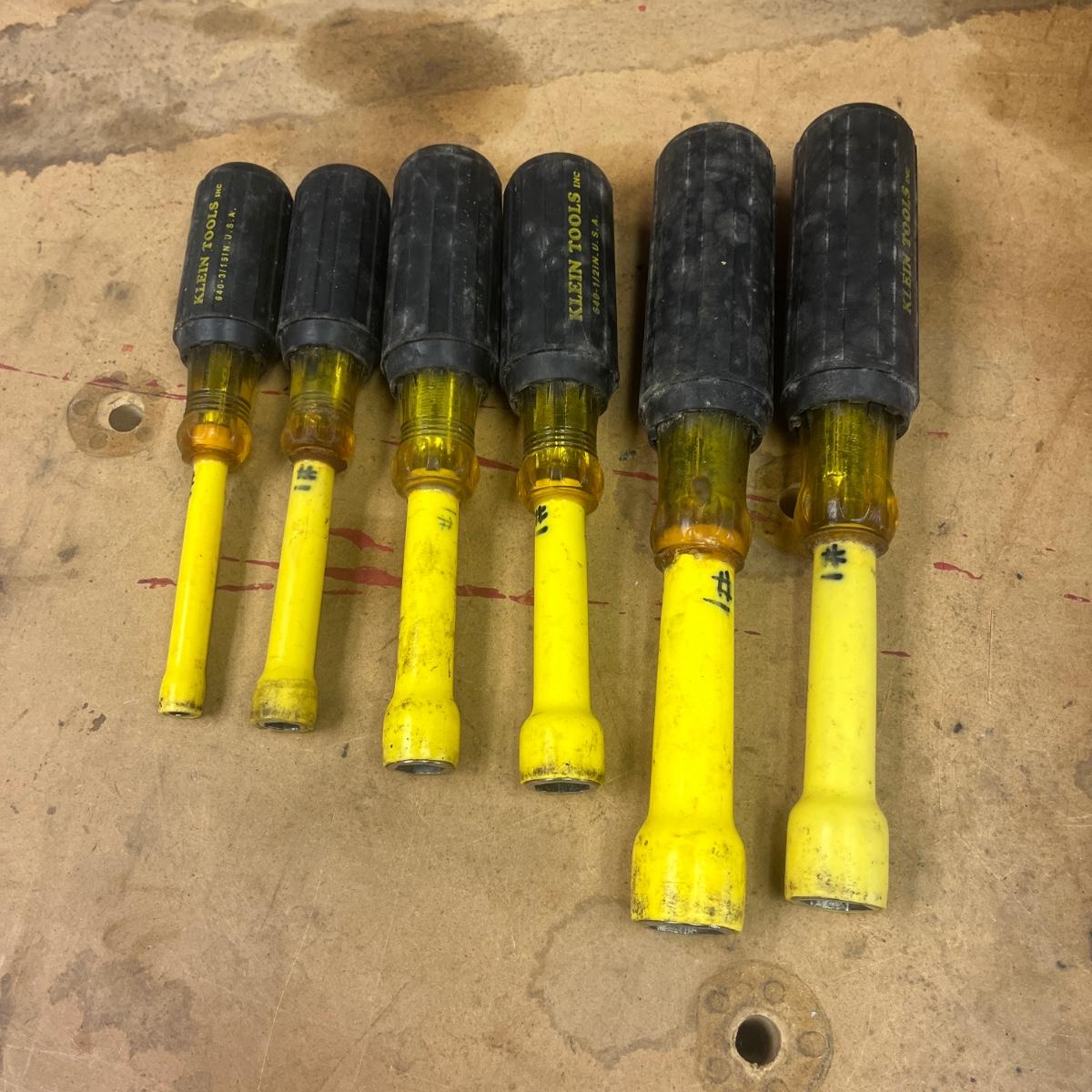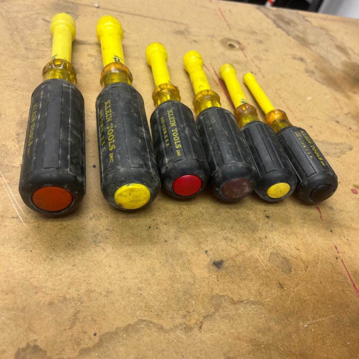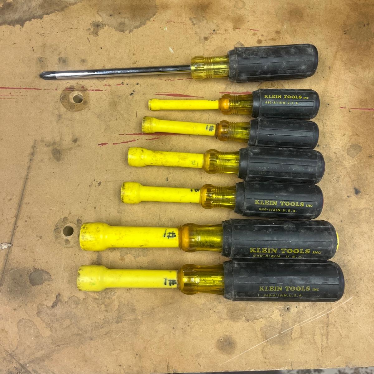 Lot includes six Klein Tools insulated nut drivers and one Klein Tools Phillips head screwdriver that measures 10.5” long.
