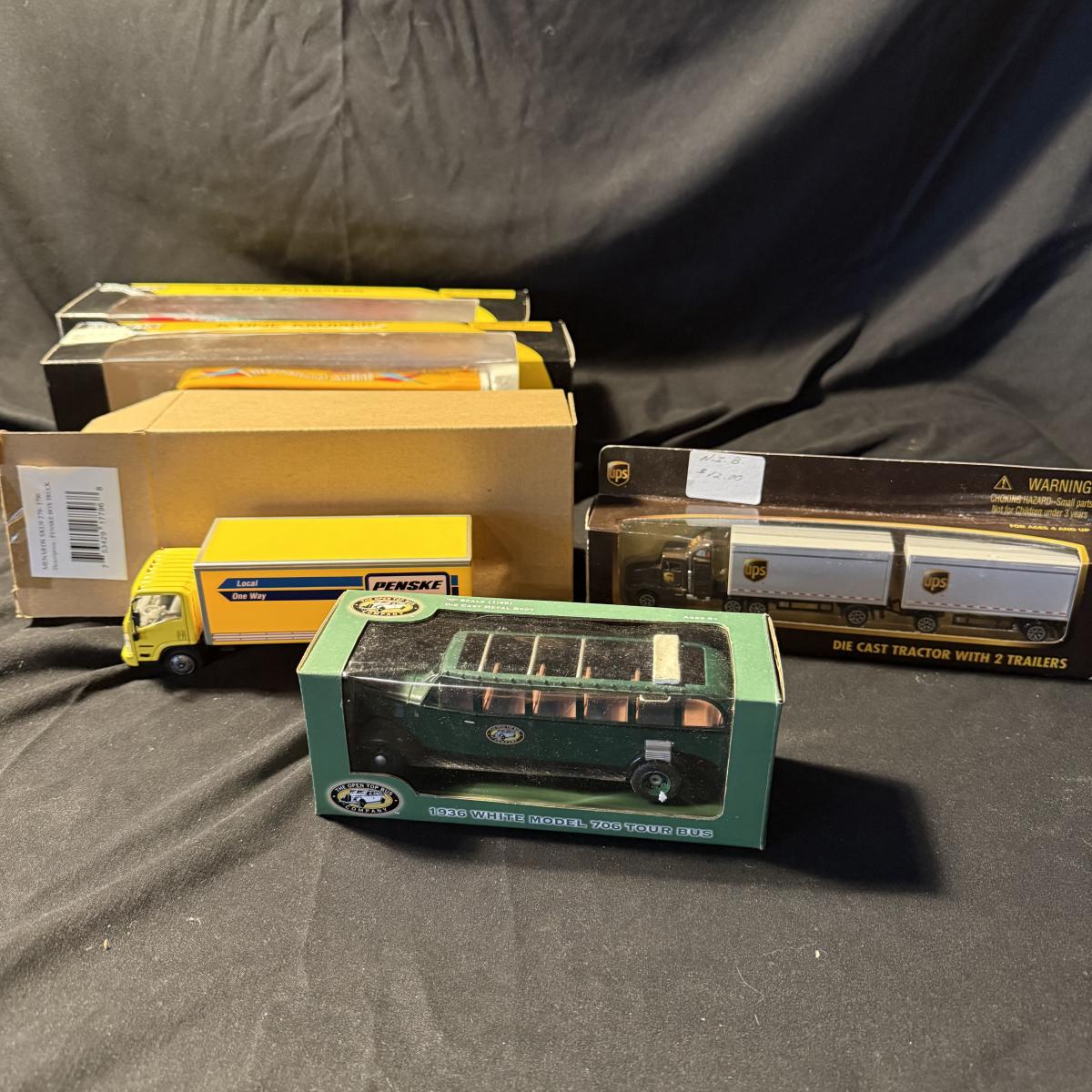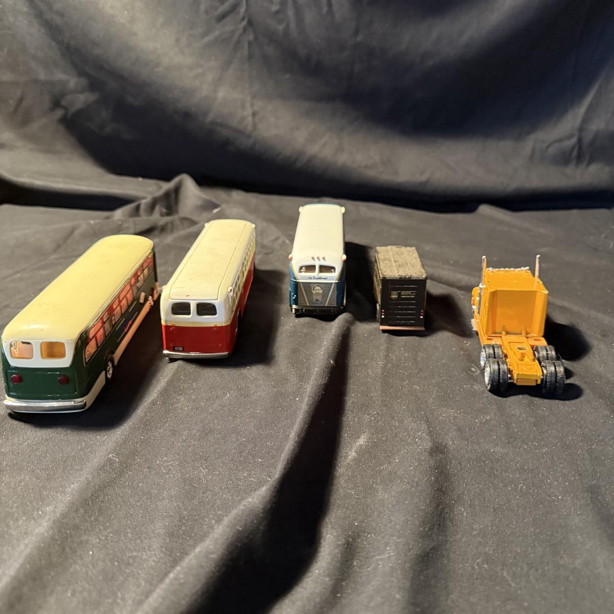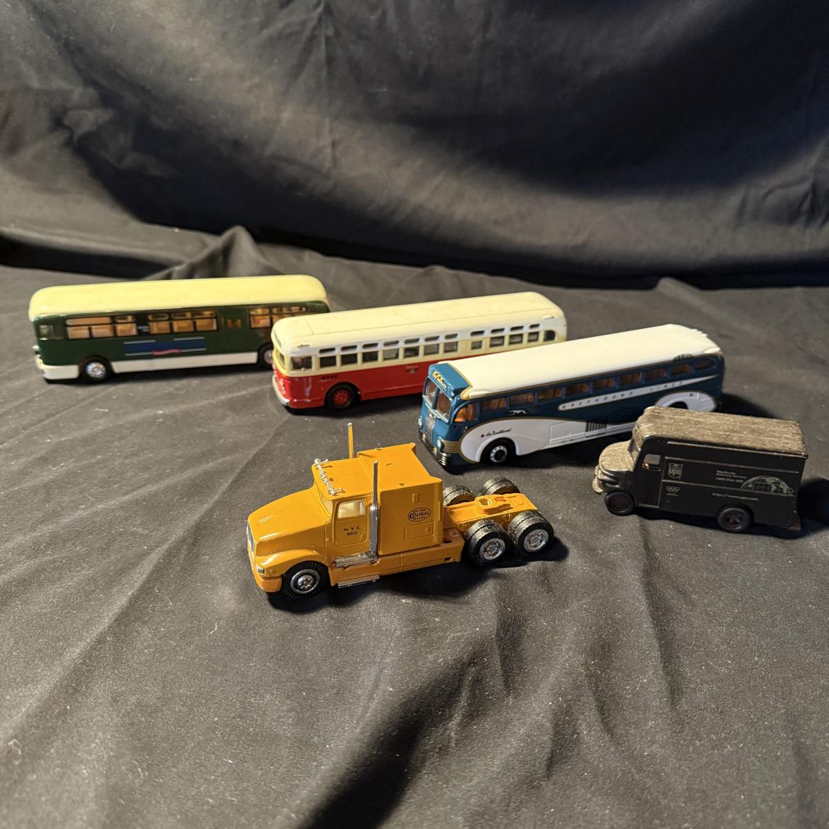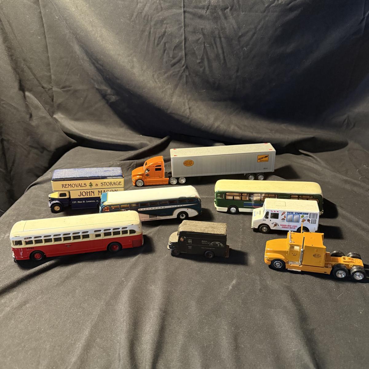 This lot contains a total of 17 toy trucks and buses. Nine of the buses and trucks come with their original boxes. The Greyhound bus measures 8” x 2” x 2”H and the ice cream truck measures 4.5” x 1.5” x 2”H. See pictures for full inventory. Shipping available. Please note that any price tag seen on an item was not put there by Sterling Transitions and does not reflect the current value of the item.