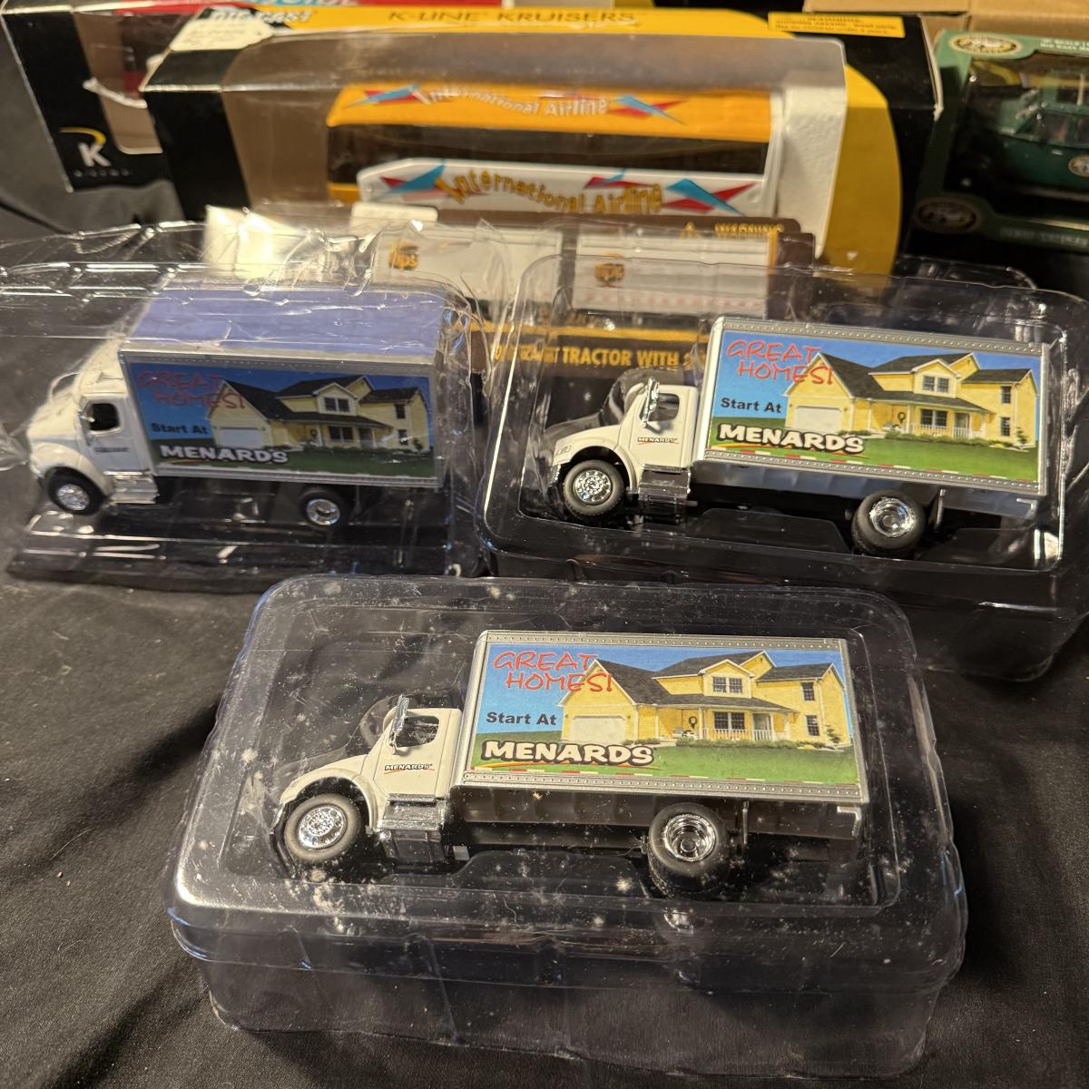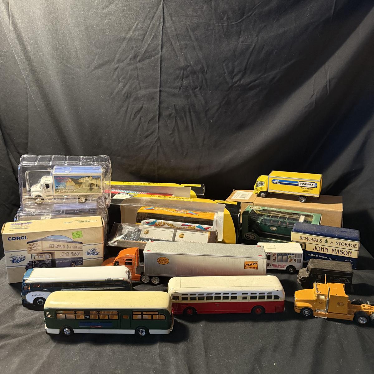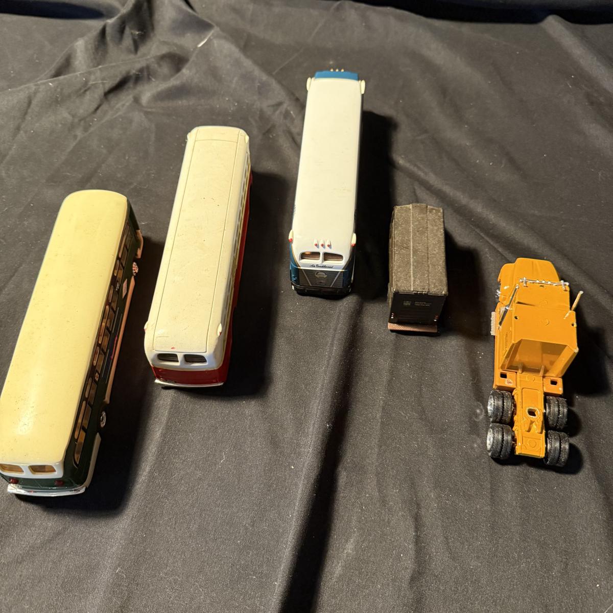 This lot contains a total of 17 toy trucks and buses. Nine of the buses and trucks come with their original boxes. The Greyhound bus measures 8” x 2” x 2”H and the ice cream truck measures 4.5” x 1.5” x 2”H. See pictures for full inventory. Shipping available. Please note that any price tag seen on an item was not put there by Sterling Transitions and does not reflect the current value of the item.