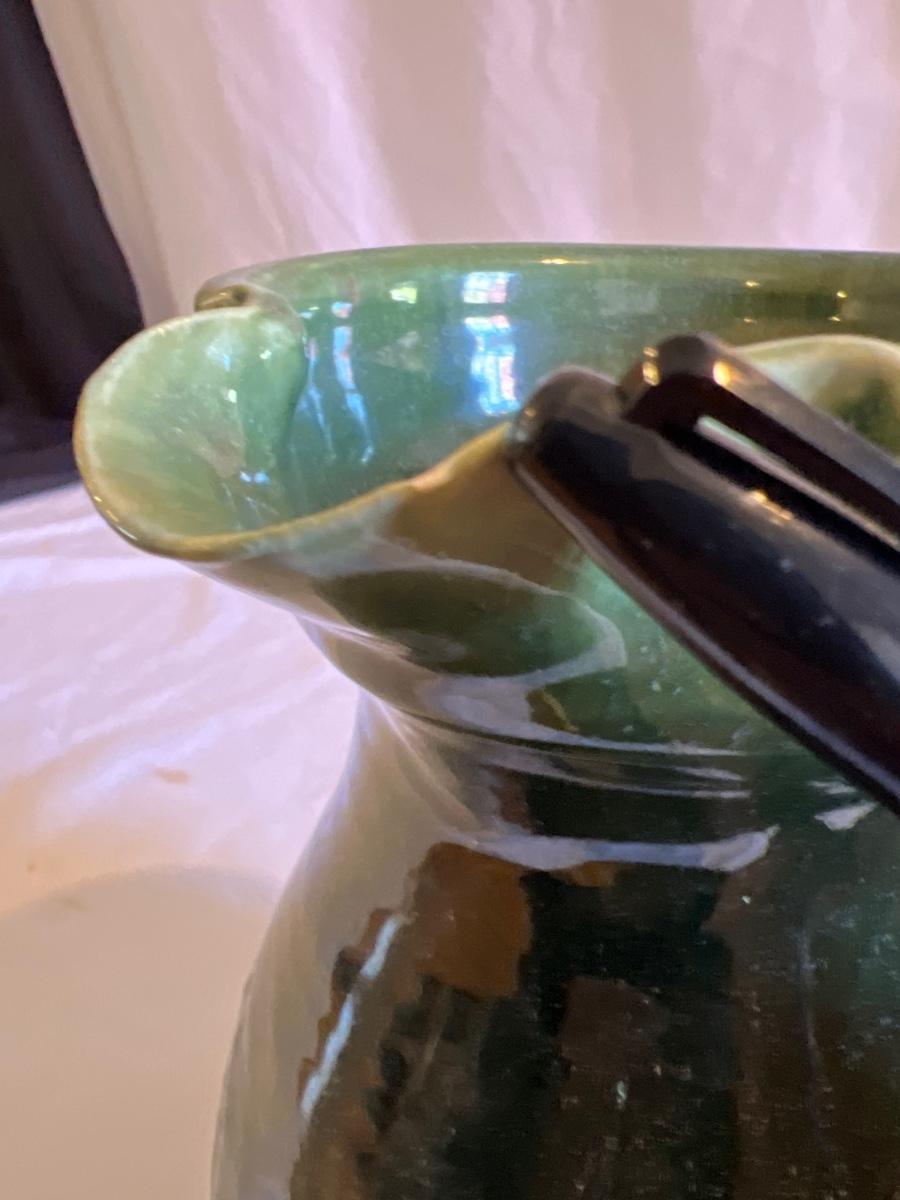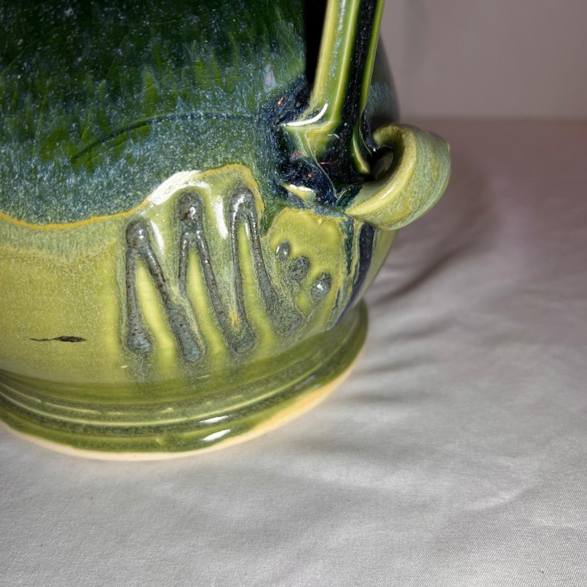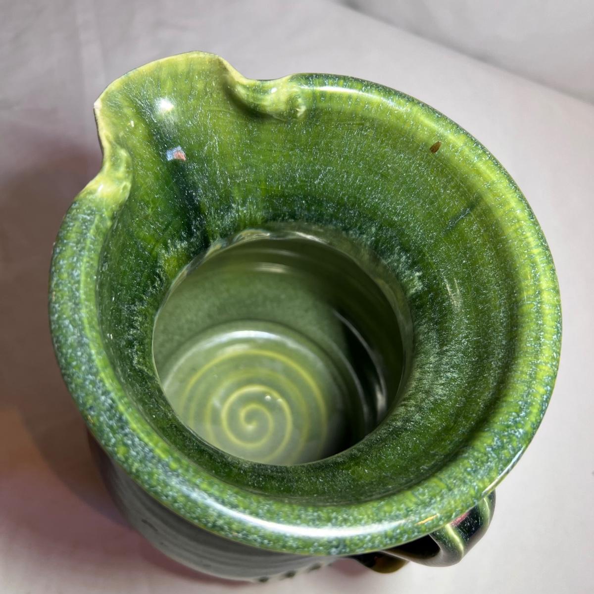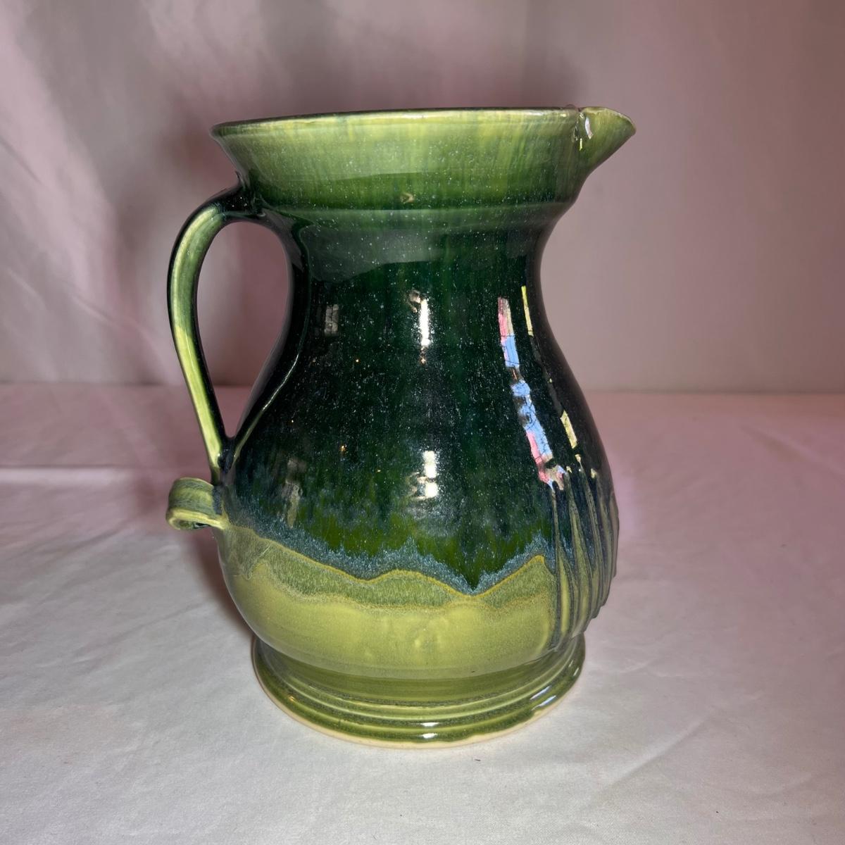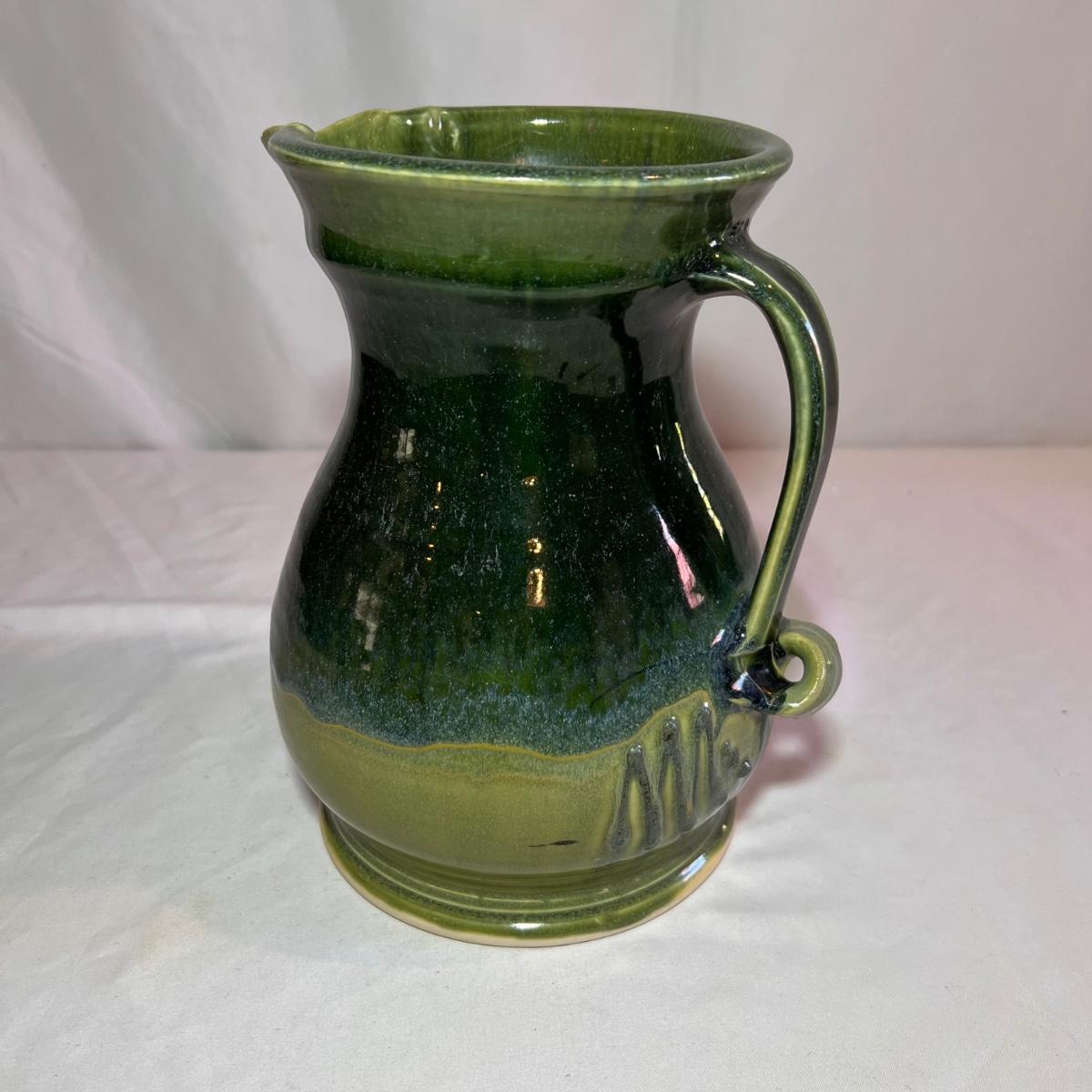 Large green stoneware pitcher with an attractive green and blue glaze. There is a very small chip, see pic.
