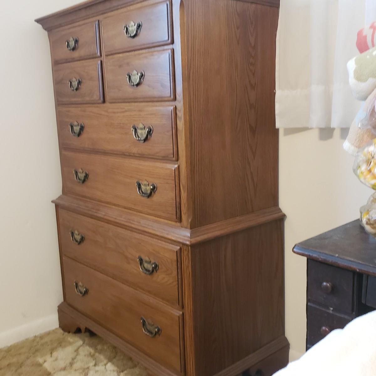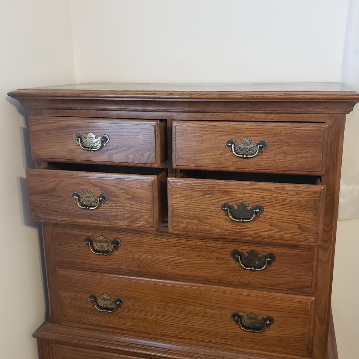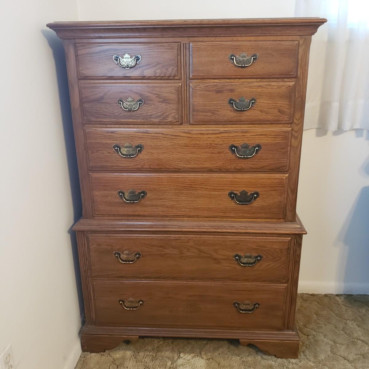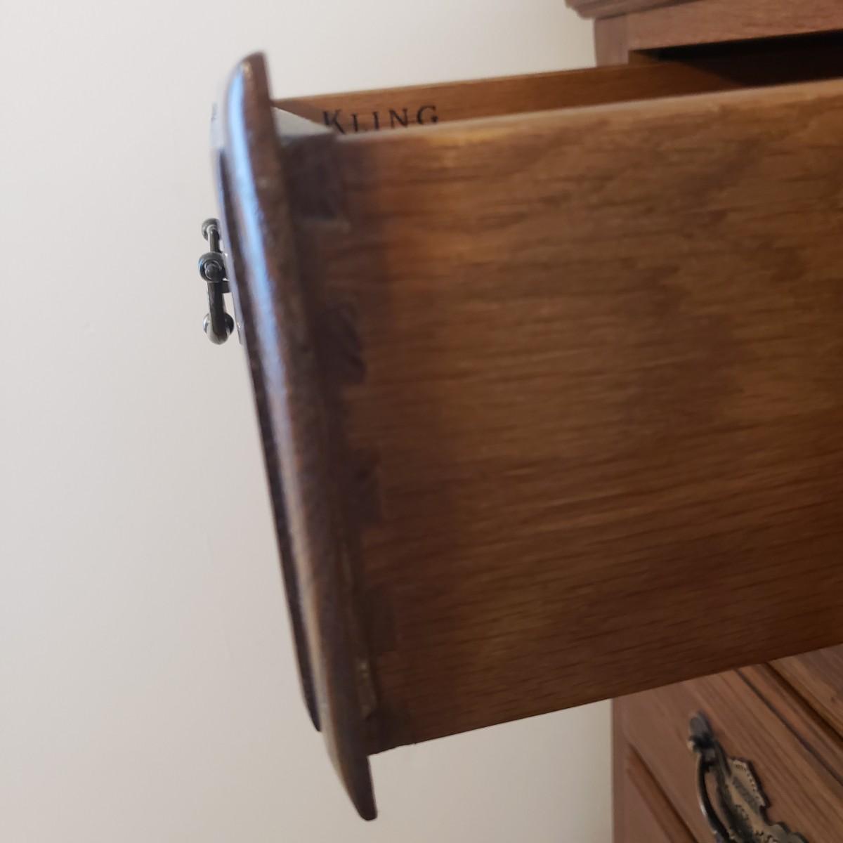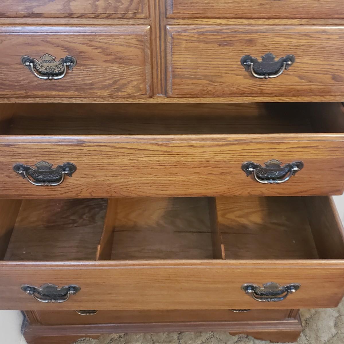 This Klinger tall boy dresser features dovetailed drawers and ornate metal handles. There are eight drawers, four small, two medium and two large. One medium and one large drawer have removable dividers. The dresser measures 38" x 19" x 57"H. Dresser appears to be blemish free.