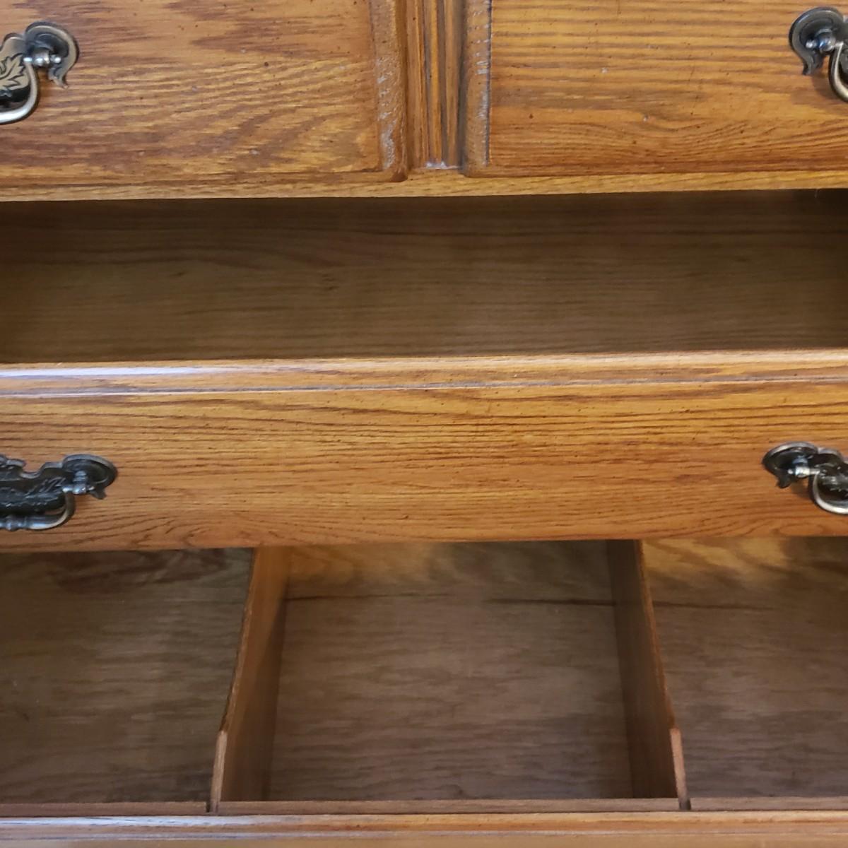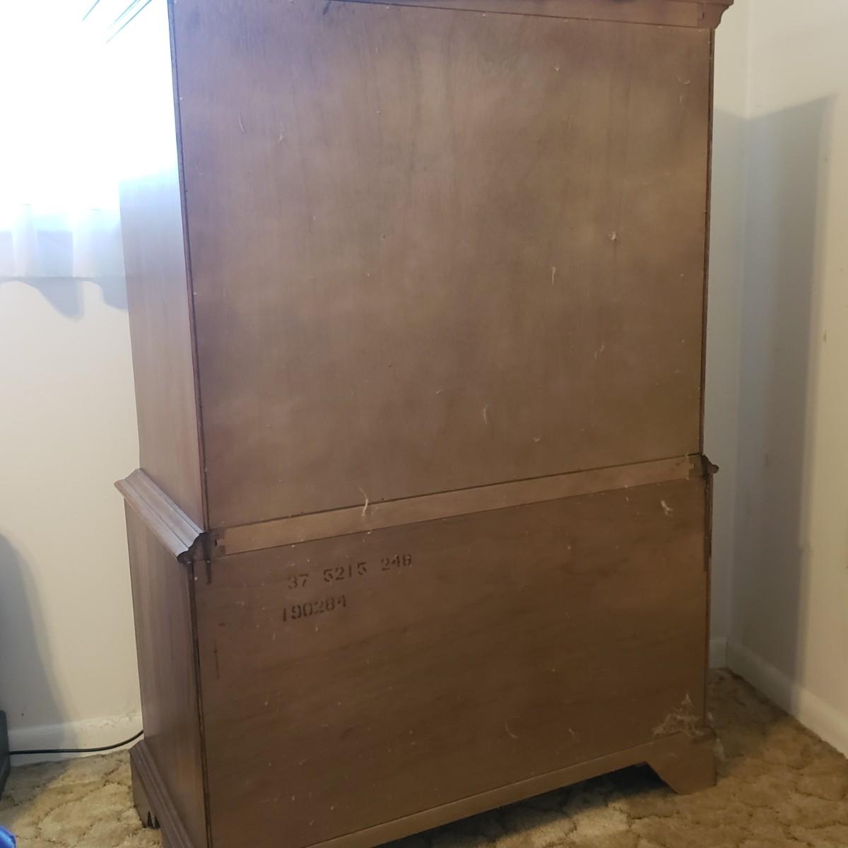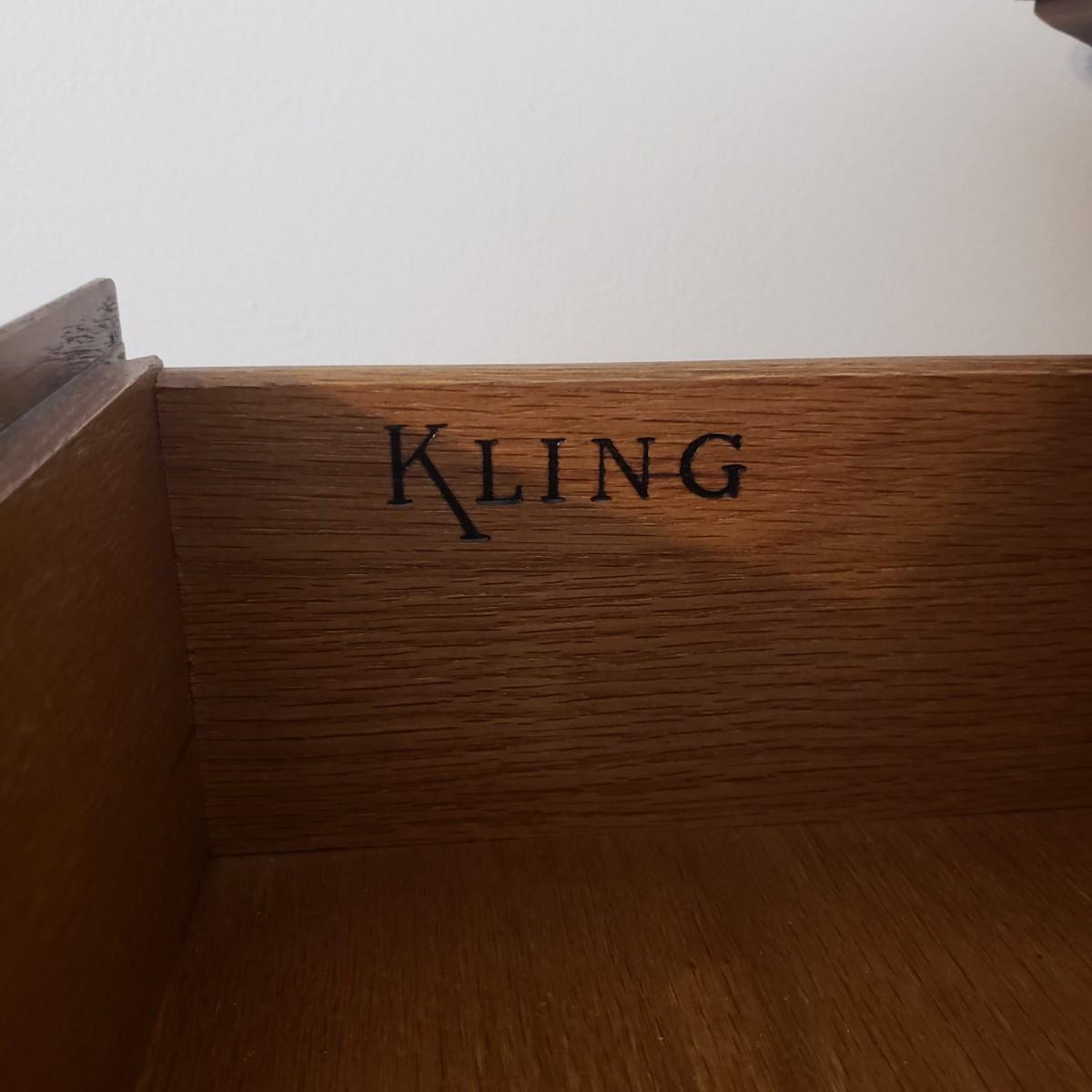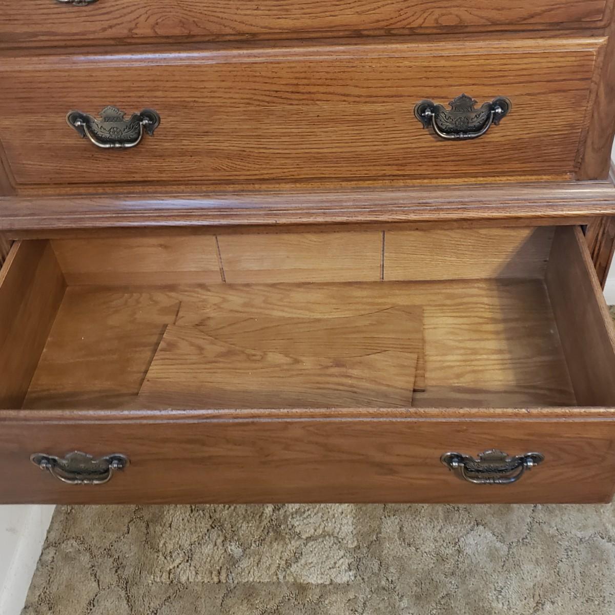 This Klinger tall boy dresser features dovetailed drawers and ornate metal handles. There are eight drawers, four small, two medium and two large. One medium and one large drawer have removable dividers. The dresser measures 38" x 19" x 57"H. Dresser appears to be blemish free.