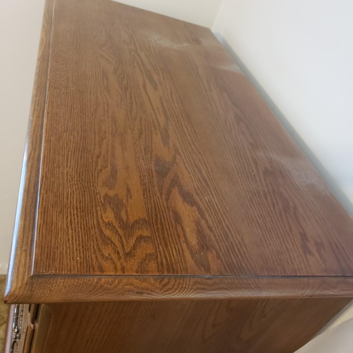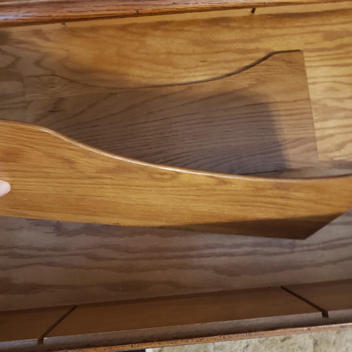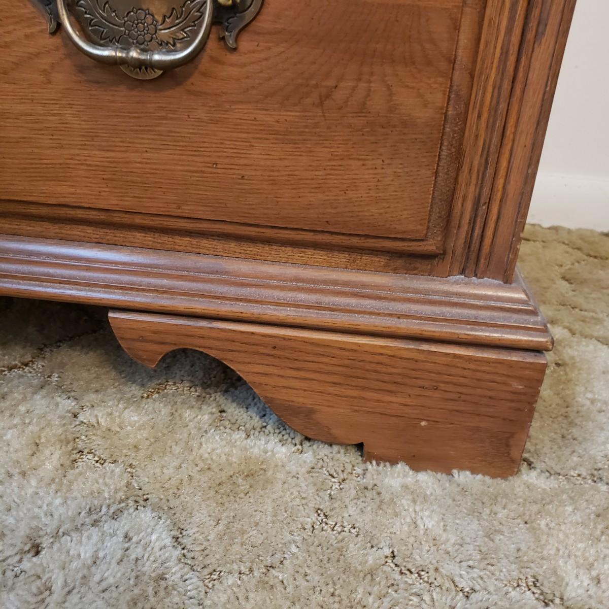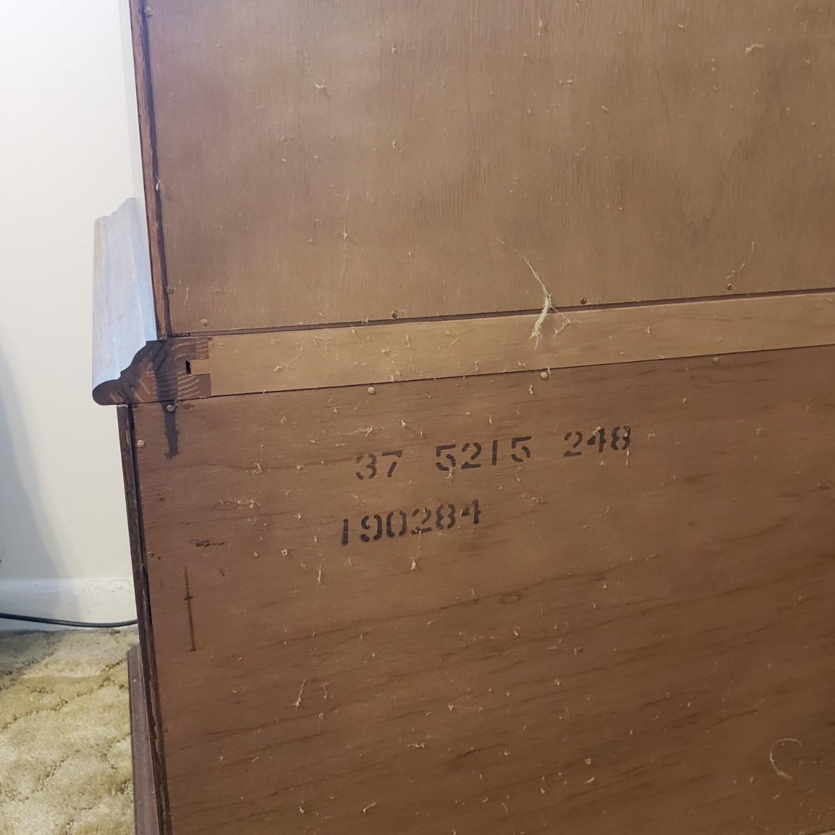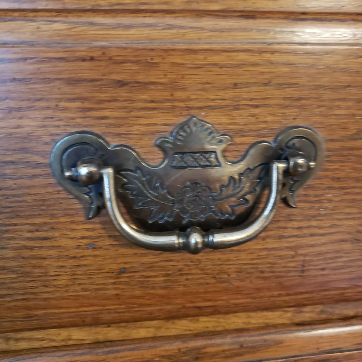 This Klinger tall boy dresser features dovetailed drawers and ornate metal handles. There are eight drawers, four small, two medium and two large. One medium and one large drawer have removable dividers. The dresser measures 38" x 19" x 57"H. Dresser appears to be blemish free.