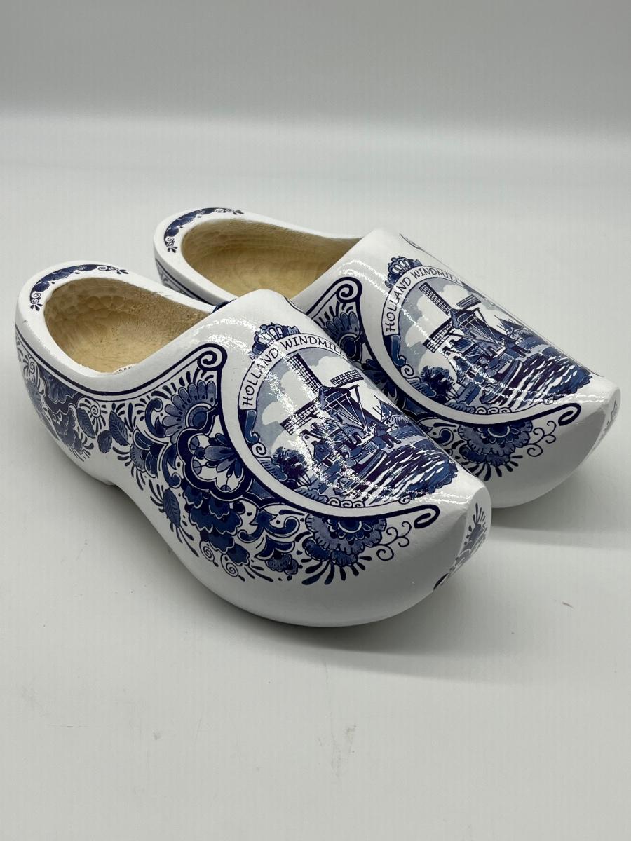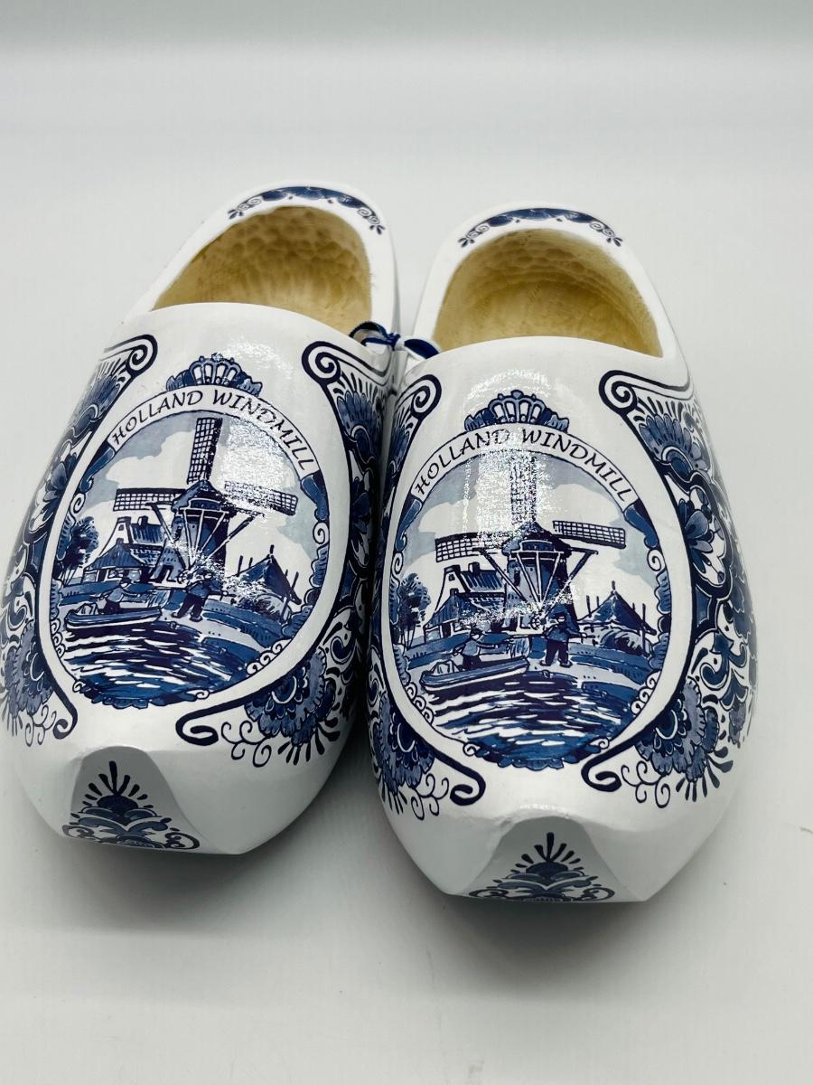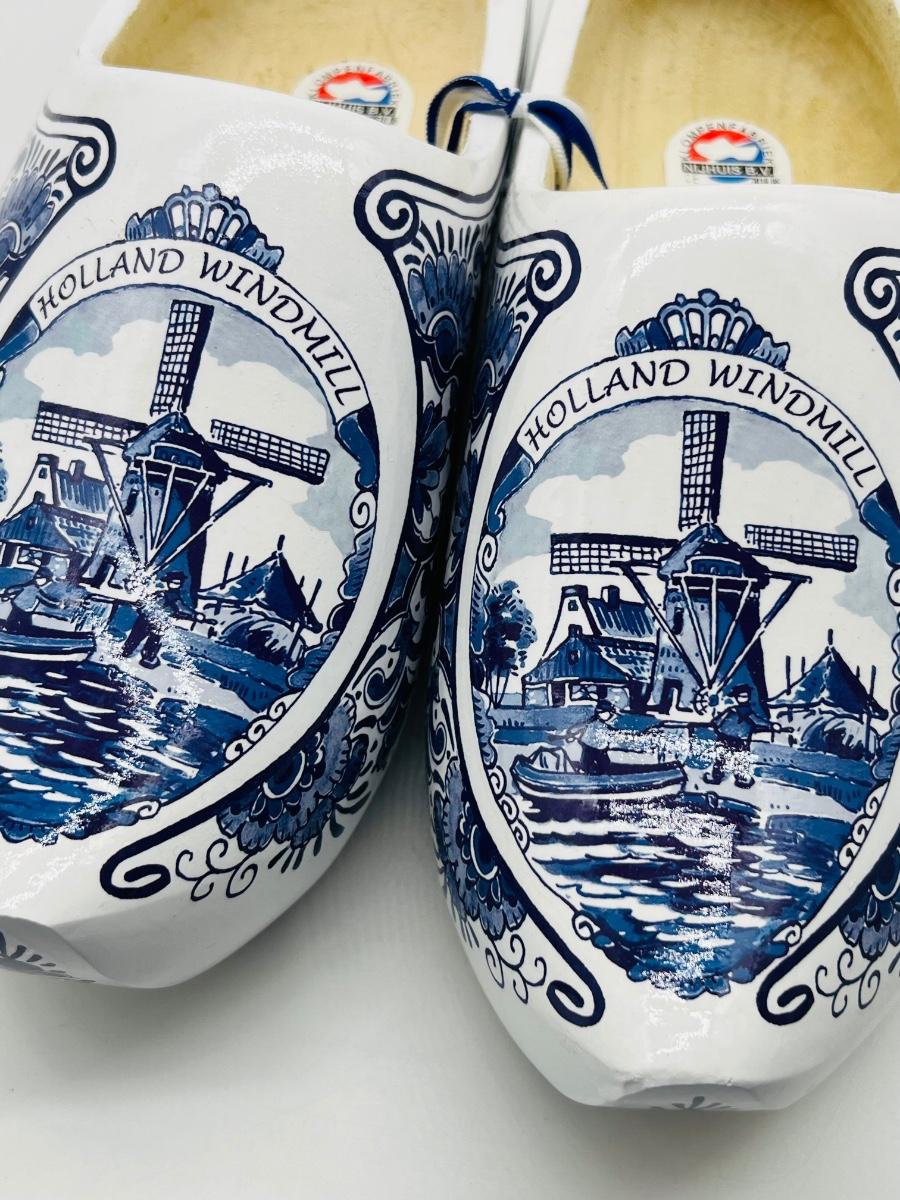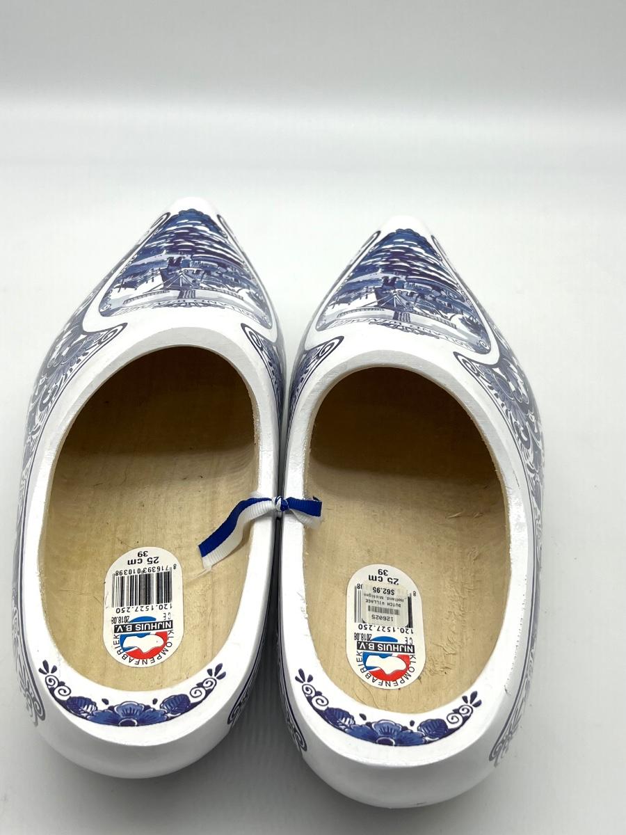 Blue Mill Dutch Clogs, wooden shoes with white and blue Holland Windmill design. Shoes are 25cm or 39.