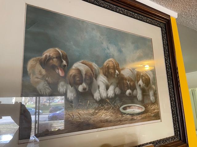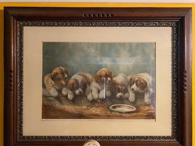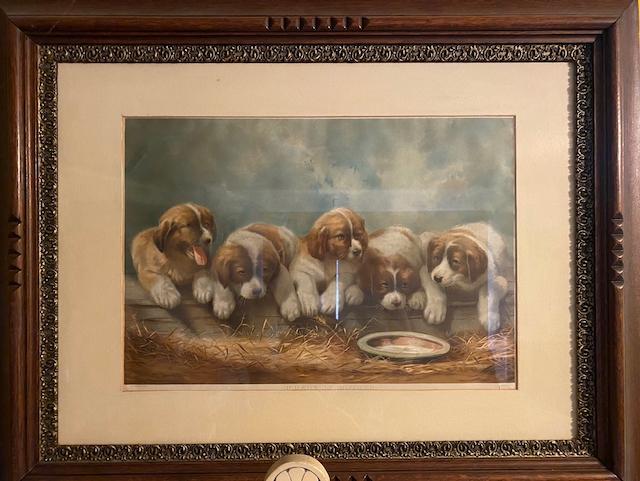 Knapp "Where is Mother?" c.1892 Color Lithograph, DOGS Framed - very nice wood frame Print is 28inches x 16 inches frame is 29 inches x 29.5 - hard to photograph with out glare.