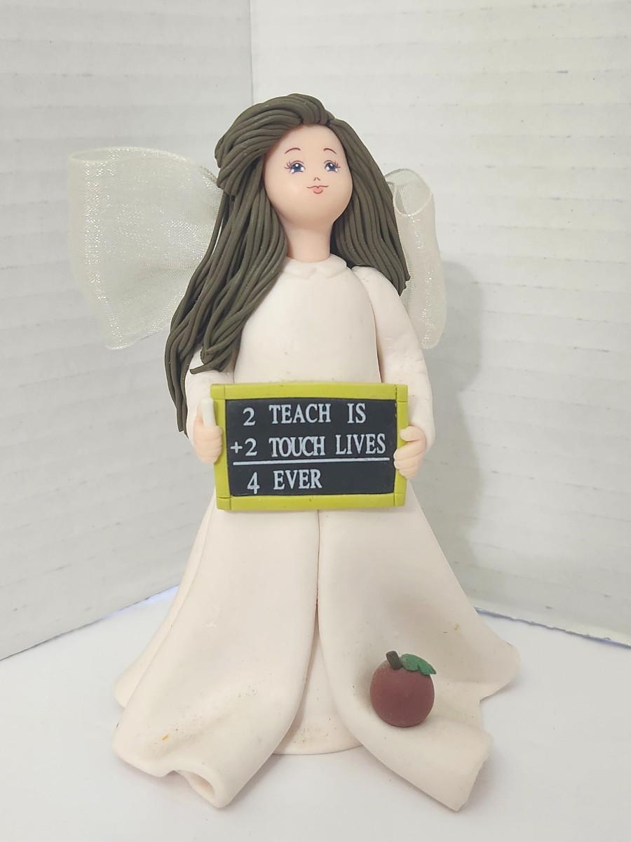 Decorative angel figurine by Pavilion Gift Company from the Kneeling Angels series, designed as a teacher appreciation piece. The angel is dressed in a flowing ivory gown with translucent wings and holds a chalkboard style sign reading “To Teach Is To Touch Lives Forever.” Finished with sculpted long hair, soft facial features, and a small apple detail at the base. Marked on the underside Kneeling Angels Pavilion Gift Co, item number 6012, handmade in China. Intended as a decorative figurine for display, gifting, or teacher themed collections. Suitable for shelves, desks, or seasonal appreciation decor.