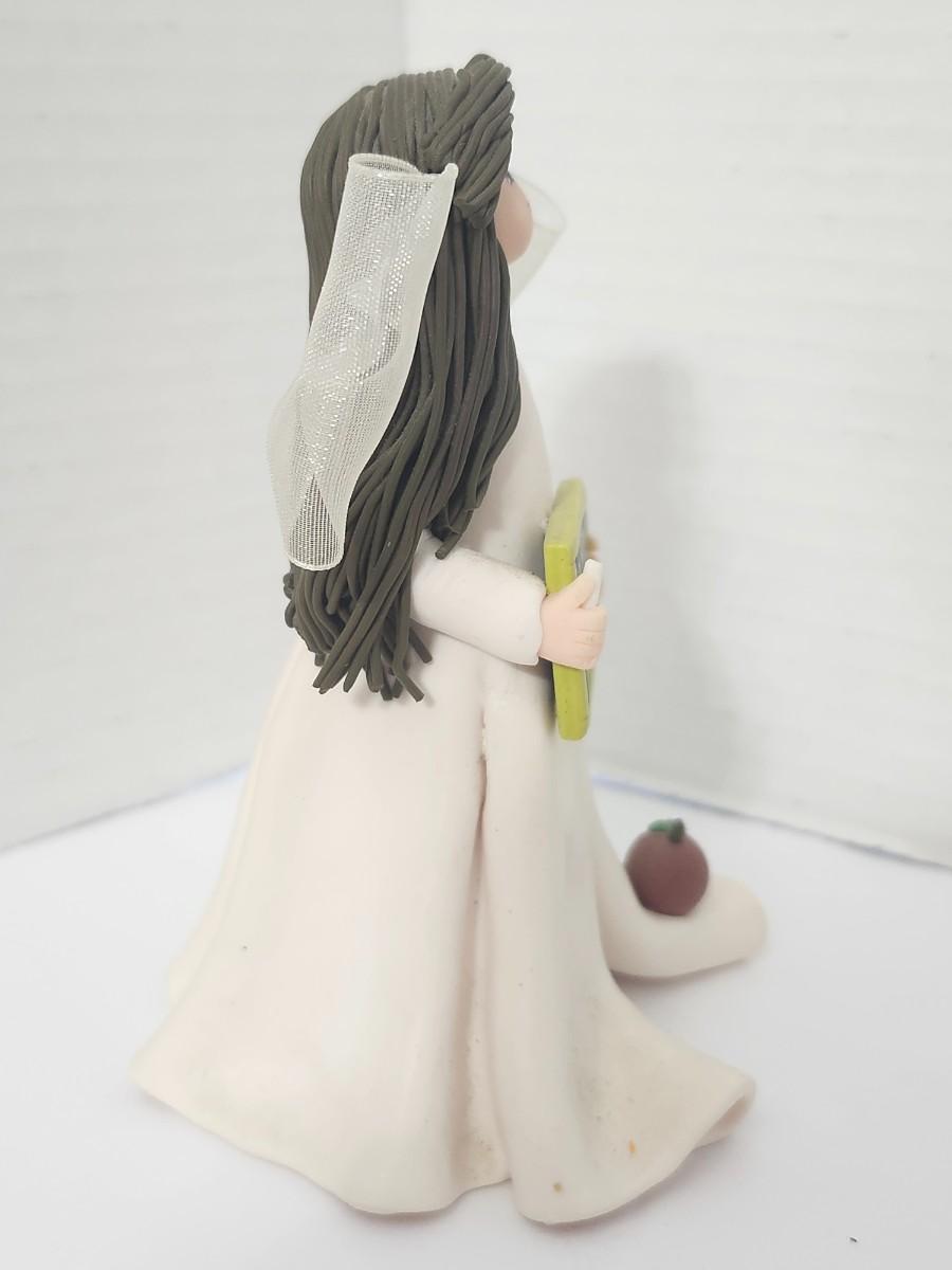 Decorative angel figurine by Pavilion Gift Company from the Kneeling Angels series, designed as a teacher appreciation piece. The angel is dressed in a flowing ivory gown with translucent wings and holds a chalkboard style sign reading “To Teach Is To Touch Lives Forever.” Finished with sculpted long hair, soft facial features, and a small apple detail at the base. Marked on the underside Kneeling Angels Pavilion Gift Co, item number 6012, handmade in China. Intended as a decorative figurine for display, gifting, or teacher themed collections. Suitable for shelves, desks, or seasonal appreciation decor.